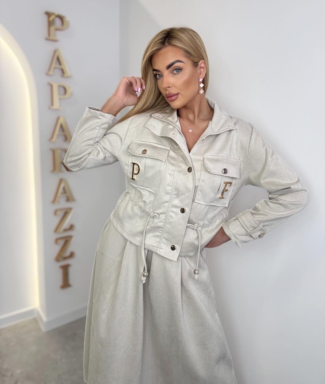 Komplet zamszowy, góra zapinana na guziczki z efektownymi kieszeniami na przodzie, w pasie z możliwością ściągania za pomocą sznureczków. Spódnica z ozdobnymi kontrafałdami o rozszerzonym kroju. Elegancja i wygoda w jednym – ten …