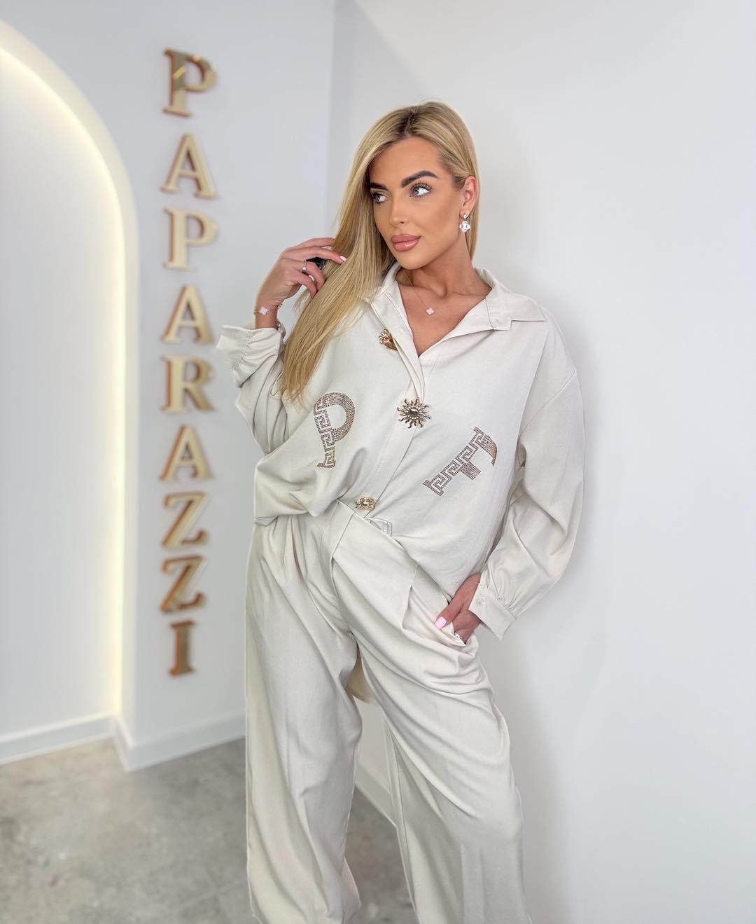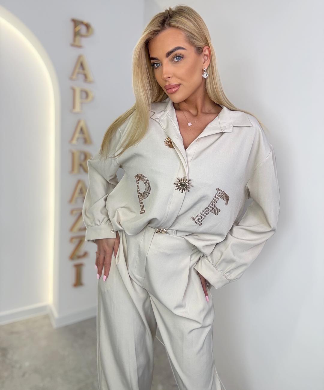 Elegancki komplet bawełniany o luźnym, oversizeowym kroju. Koszula z ozdobnymi guzikami, spodnie o szerokim kroju.