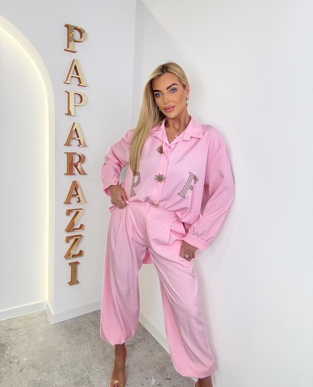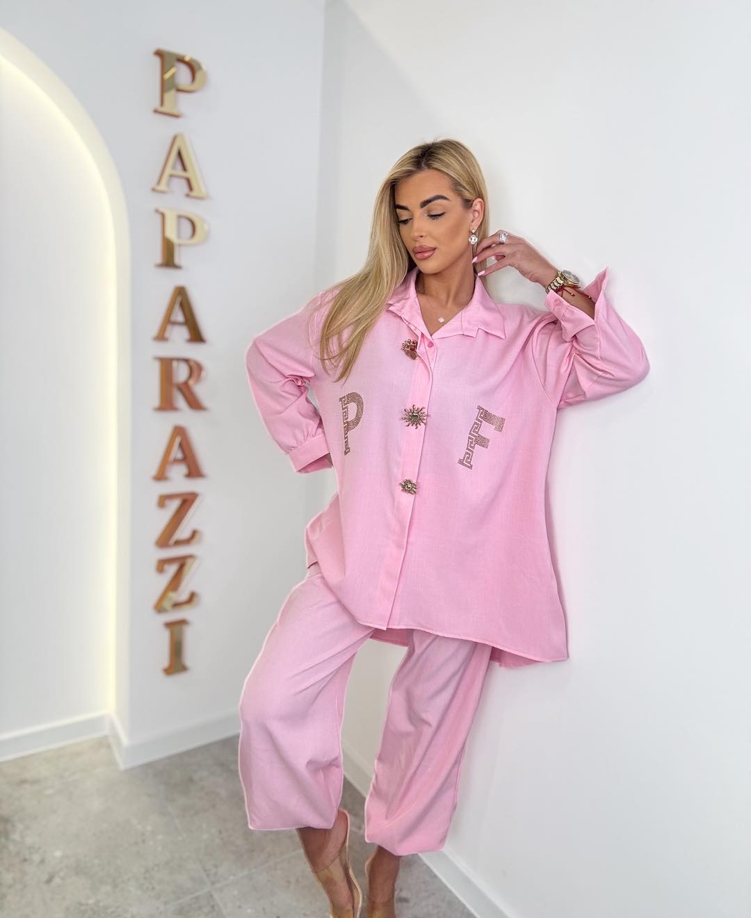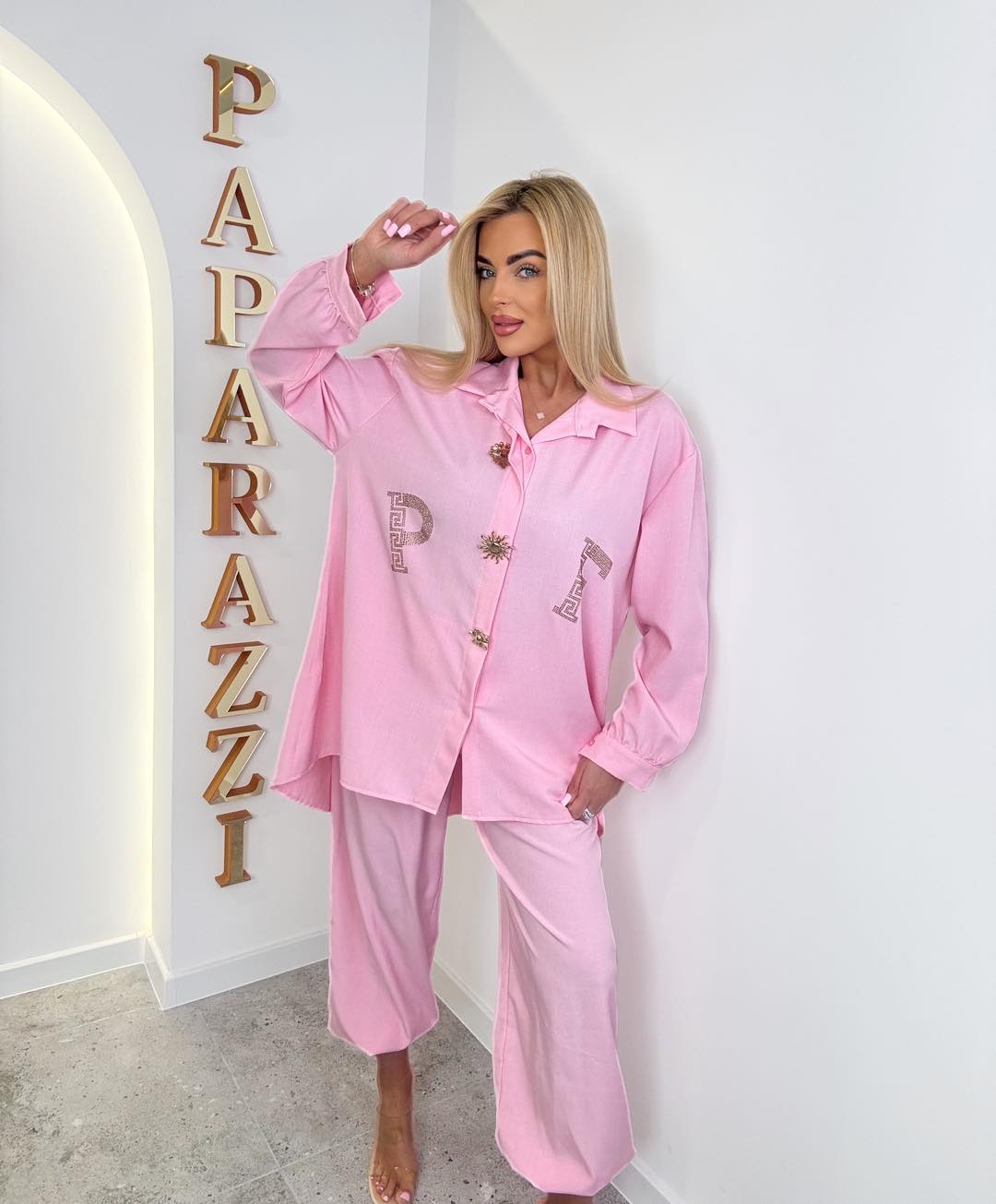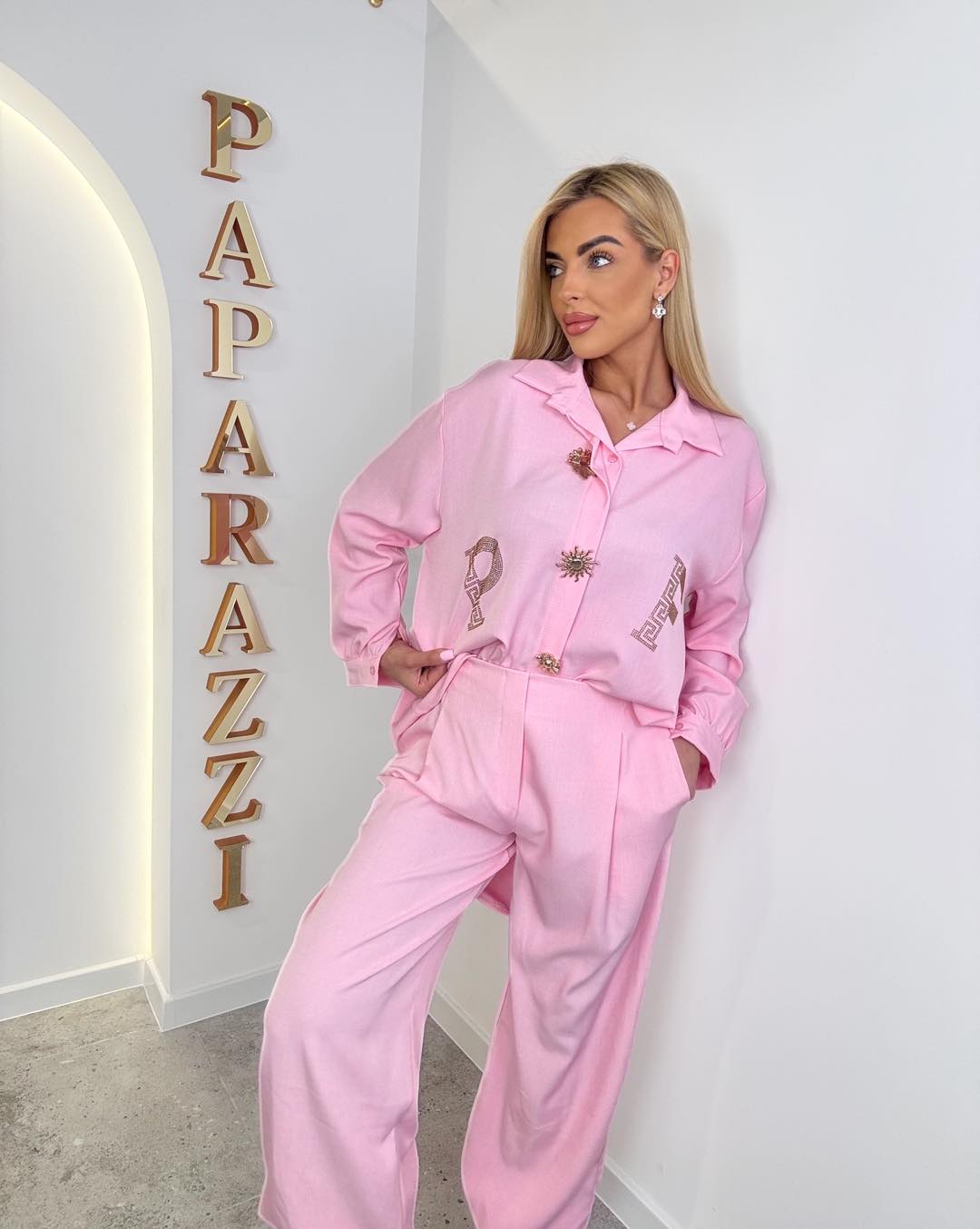 Elegancki komplet bawełniany o luźnym, oversizeowym kroju. Koszula z ozdobnymi guzikami, spodnie o szerokim kroju. Bluzka: Biust:68x2 Pas:68x2 Długość: 76cm Spodnie: Pas:40-55x2 Biodra:60-65x2 Długość:103cm
