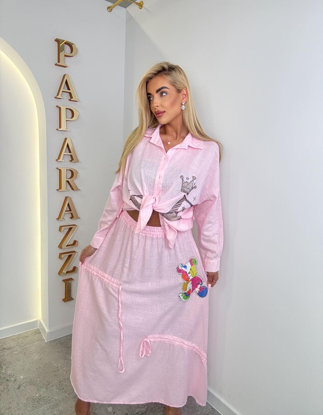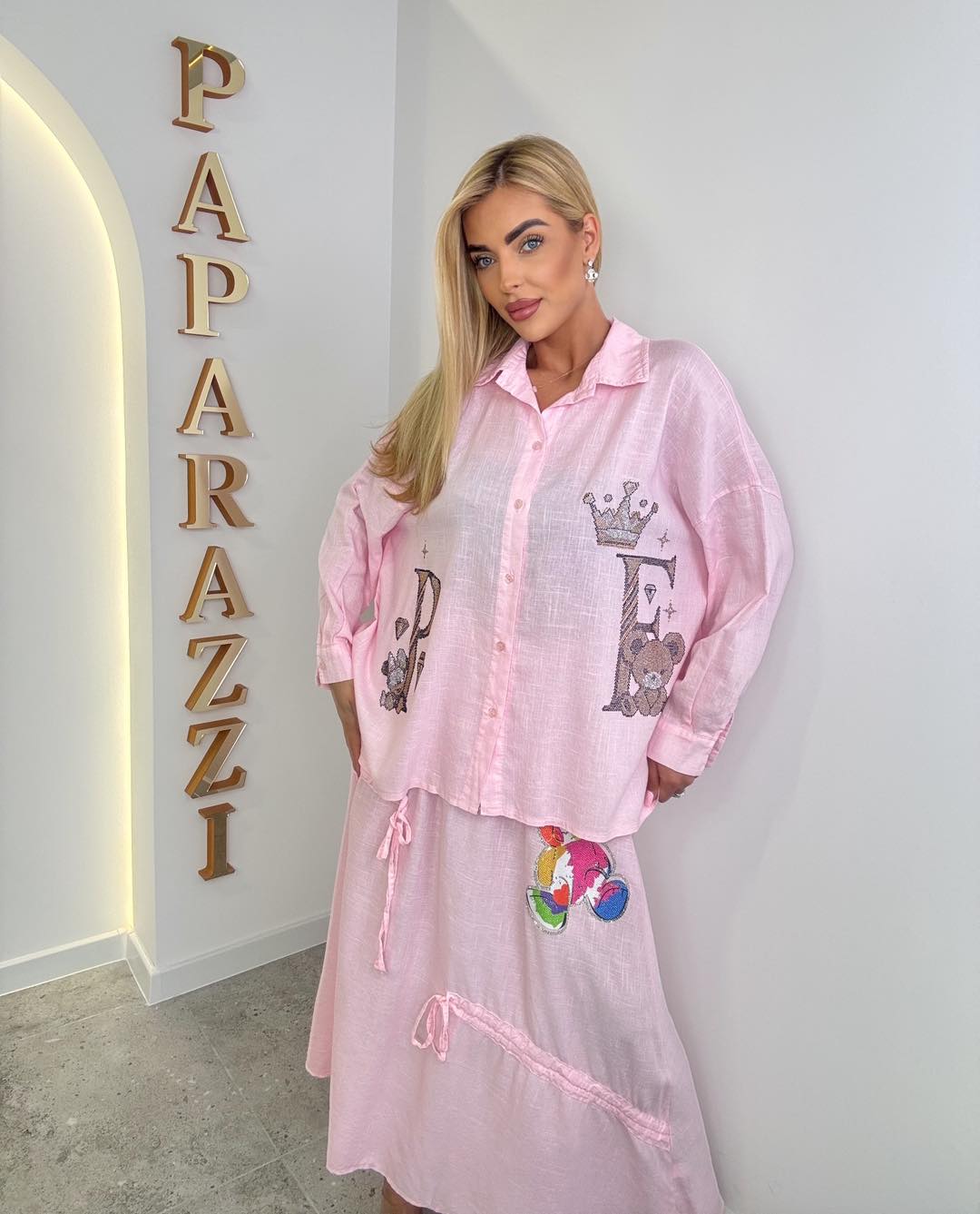 Zwiewny, lekki komplet z aplikacją kolorowego misia oraz ozdobnymi złotymi kamyczkami z logo firmy. Koszula: Biust:73x2 Pas:73x2 Długość:68 cm Spódnica: Pas:40-60x2 Biodra:65x2 Długość:93cm