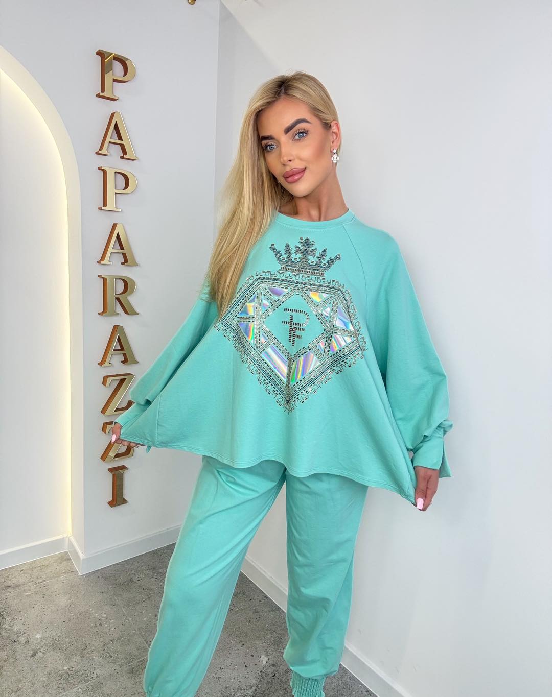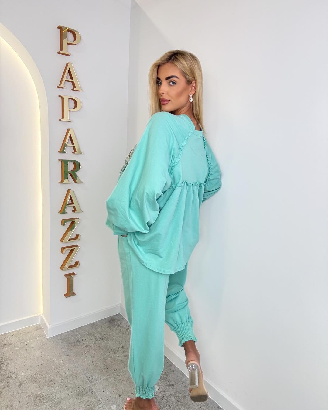 Bluzka z szerokimi rękawkami i rozcięciem przy nadgarstkach, na przodzie duża ozdobna aplikacja. Spodnie zakończone ściągaczem. Bluzka: Biust:65x2 Pas:65x2 Długość: 61/68cm Spodnie: Pas:40-60x2 Biodra:60-65x2 …