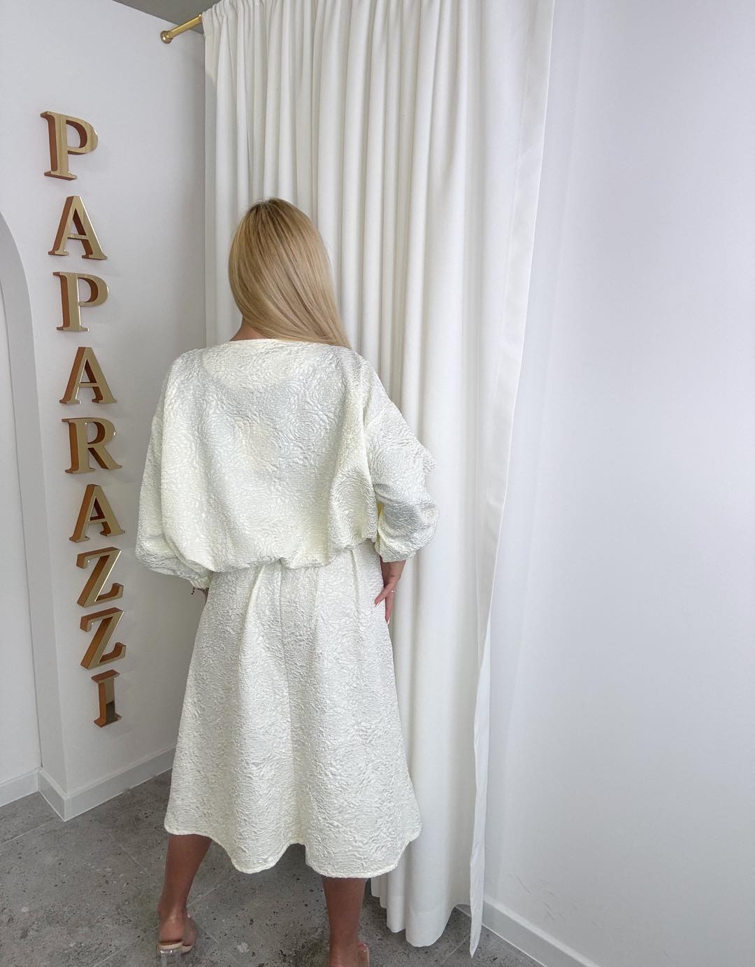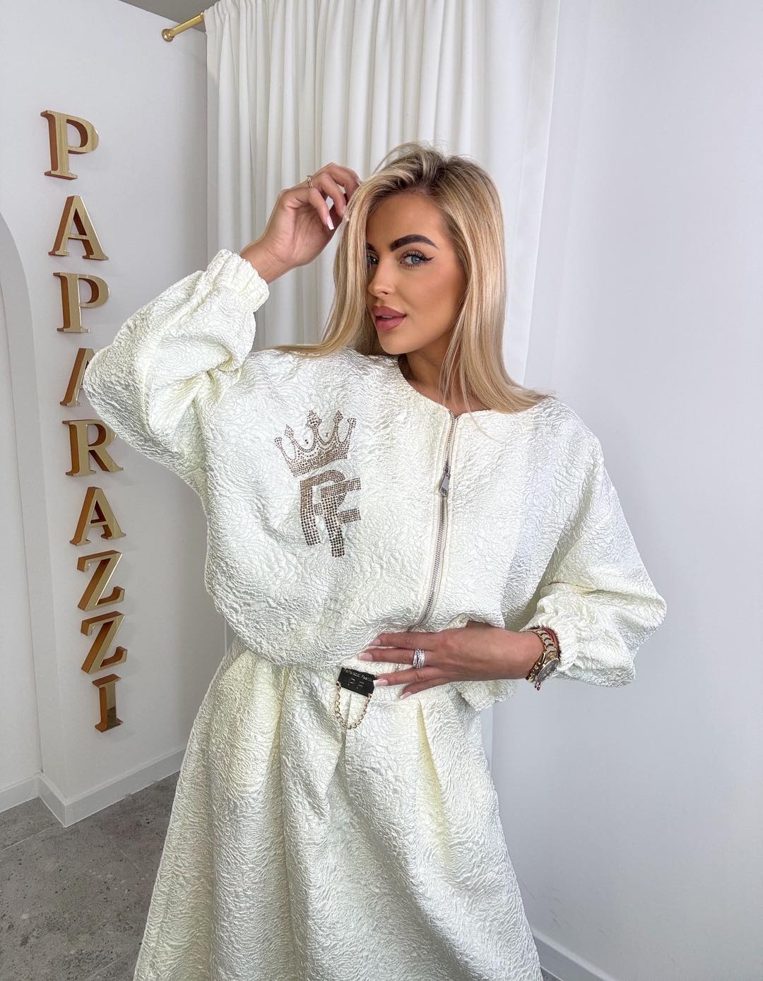 Stylowy zestaw wykonany z subtelnej strukturalnej tkaniny, który łączy klasykę z nowoczesną elegancją. Kurtka zapinana na zamek o swobodnym kroju zapewnia komfort noszenia, a spódnica pięknie podkreśla sylwetkę dzieki kontrafałdom i tworzy spójną całość.