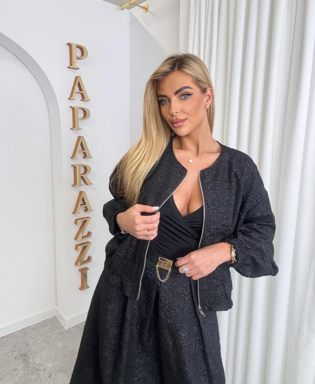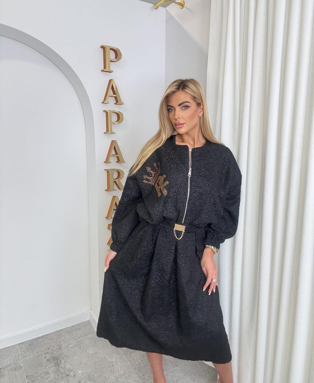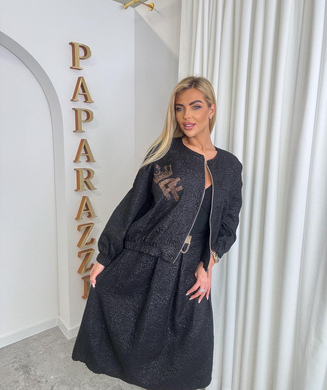 Stylowy zestaw wykonany z subtelnej strukturalnej tkaniny, który łączy klasykę z nowoczesną elegancją. Kurtka zapinana na zamek o swobodnym kroju zapewnia komfort noszenia, a spódnica pięknie podkreśla sylwetkę dzieki kontrafałdom i tworzy spójną całość.