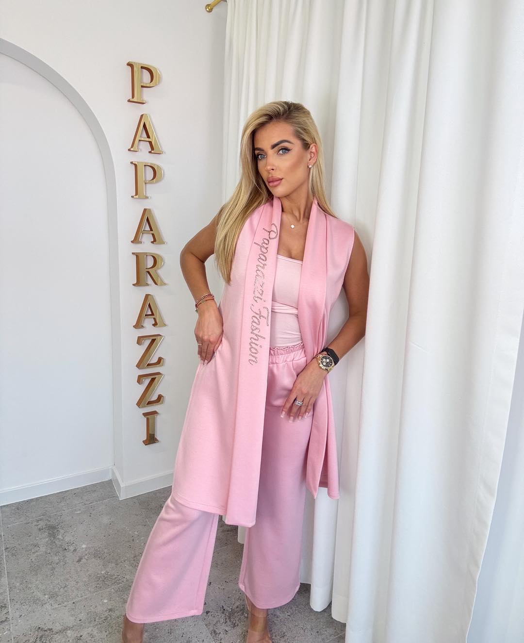 Elegancki komplet w odcieniu pudrowego różu to idealna propozycja dla kobiet ceniących ponadczasowy styl i wygodę. Długa, lekko opadająca kamizelka bez rękawów pięknie wysmukla sylwetkę i nadaje stylizacji lekkości. Subtelne, dekoracyjne wykończenie z napisem dodaje całości wyjątkowego charakteru. Spodnie z szeroką nogawką oraz elastyczną talią zapewniają komfort noszenia i swobodę ruchów, jednocześnie optycznie wydłużając nogi. Miękki, przyjemny w dotyku materiał sprawia, że komplet doskonale sprawdzi się zarówno w stylizacjach codziennych, jak i bardziej eleganckich – do pracy, na spotkanie czy wyjście do miasta. ✨ Długa kamizelka bez rękawów ✨ Szerokie, komfortowe spodnie ✨ Idealny do stylizacji casual i smart-casual