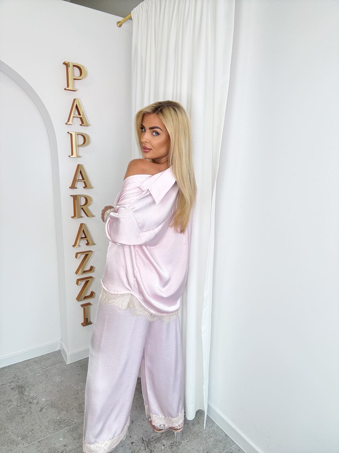 Elegancki komplet satynowy. Koszula zapinana na guziki oraz spodnie o luźnym, wygodnym kroju. Całość wykończona koronkowymi wstawkami.