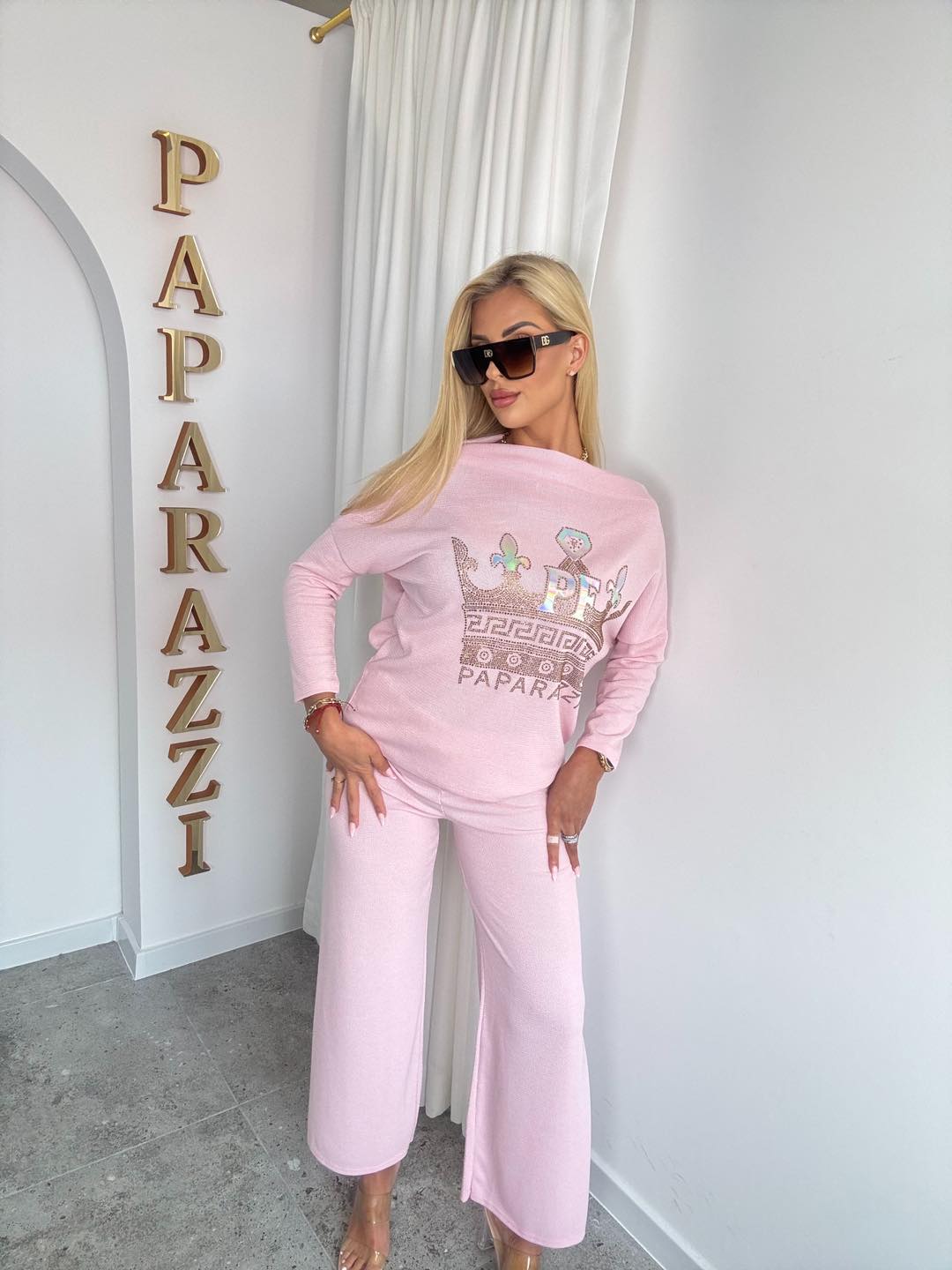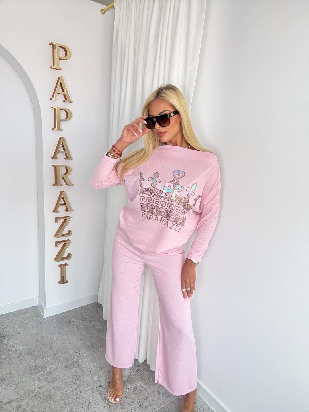 Stylowy i wygodny komplet dzianinowy w modnym odcieniu pudrowego różu. Składa się z luźnej bluzki z efektownym zdobieniem oraz spodni z szeroką nogawką, które zapewniają komfort i swobodę noszenia. Miękka, przyjemna w dotyku dzianina idealnie sprawdzi się na co dzień i w casualowych stylizacjach.