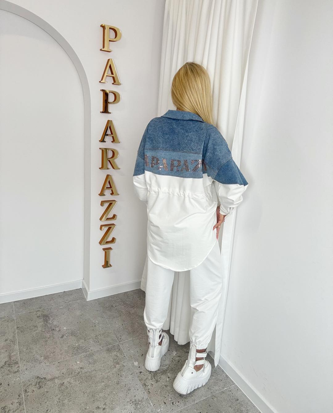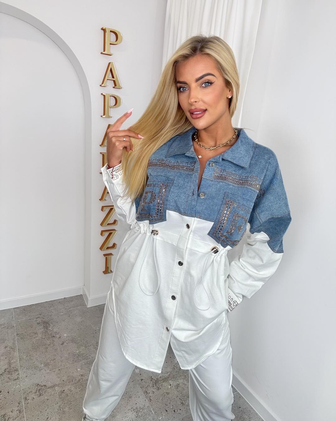Wygodny,sportowy komplet składający się z luźnej koszuli z jeansem, ściąganej na gumeczkę pod biustem, ozdobnymi mankietami oraz spodniami o klasycznym dresowym kroju. Bluzka: Biust:60x2 Pas:60x2 Długość: 83cm Spodnie: …