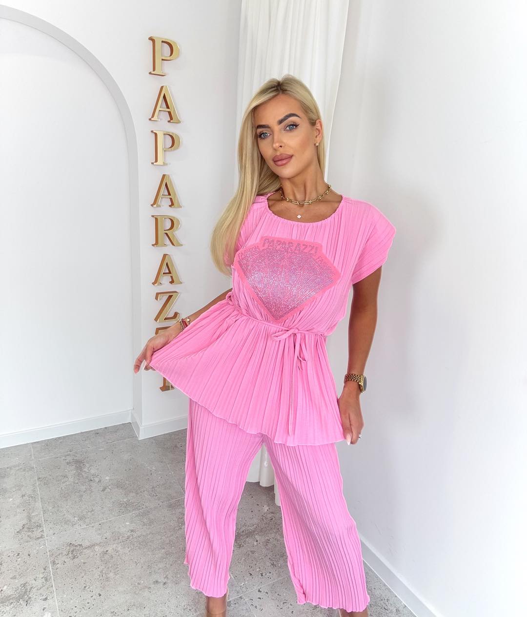 Casualowy komplet plisowany, bluzka o luźniejszym kroju, lekko opadającymi rękawkami i zaokrąglonym dekoltem. Na przodzie dekoracyjny diament. Spodnie z szerszymi nogawkami. Idealny wybór na co dzień, gdy chcesz wyglądać stylowo i …