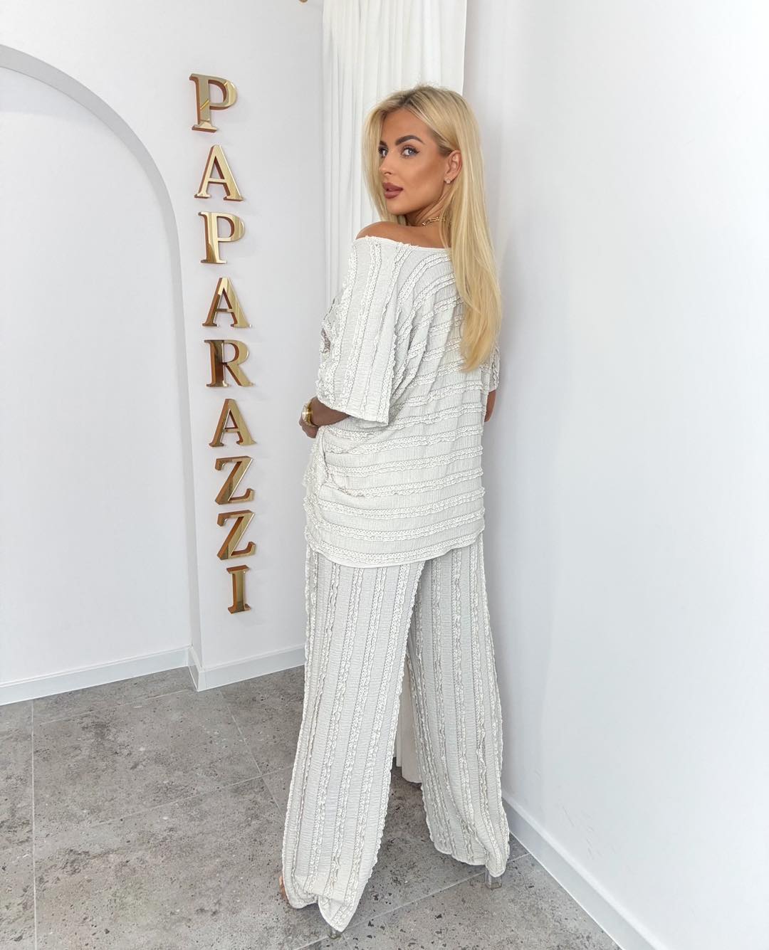 Oversize’owa góra z opadającym ramieniem dodaje lekkości, a spodnie z wysokim stanem optycznie wydłużają sylwetkę. Idealny zarówno na co dzień, jak i na bardziej stylowe wyjścia.