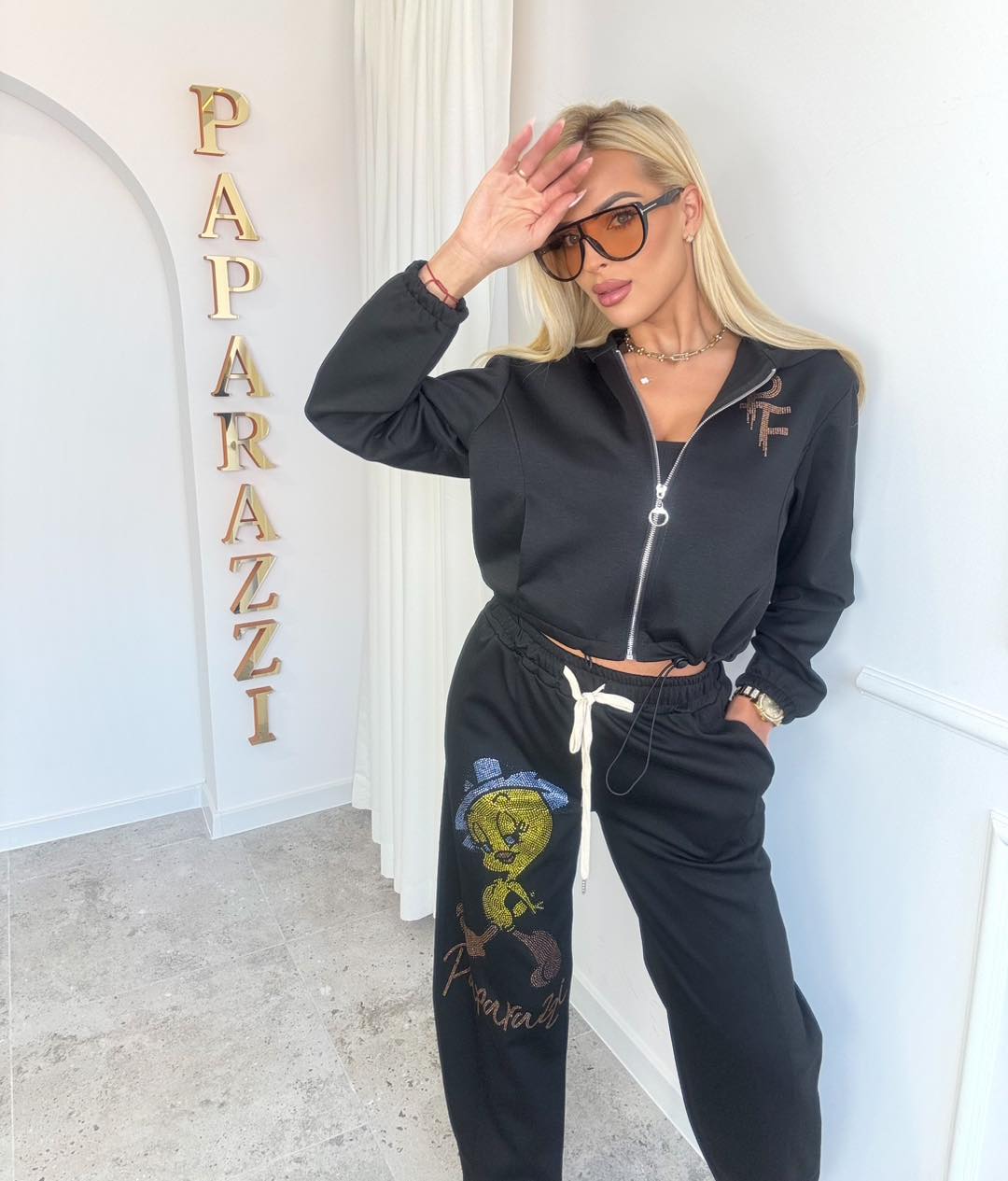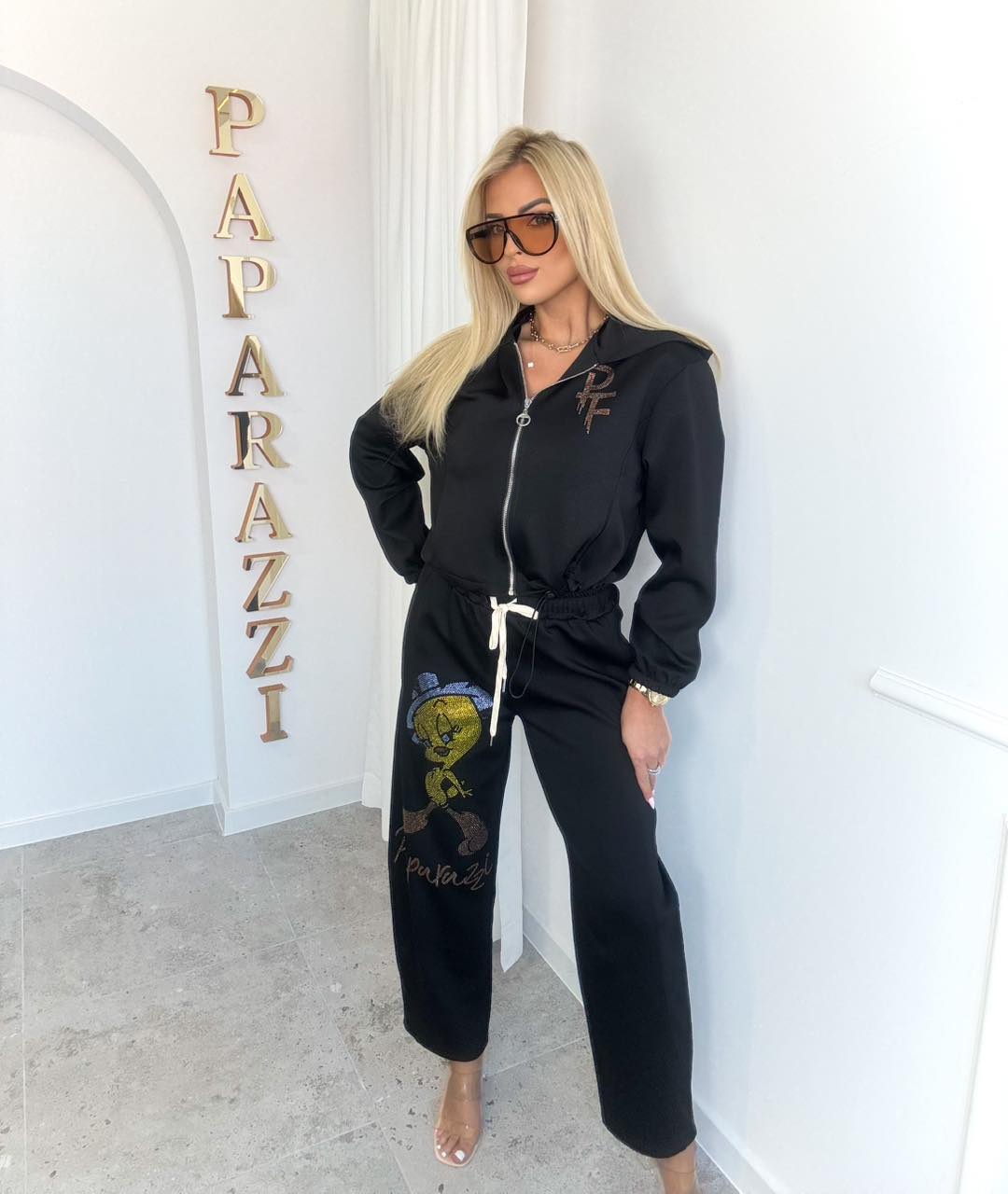 Stylowy komplet dresowy łączący wygodę z modnym designem. Bluza zapinana na zamek z subtelnym zdobieniem oraz spodnie z wysokim stanem i regulacją w pasie pięknie podkreślają sylwetkę. Szerokie nogawki i efektowna aplikacja dodają całości charakteru. Idealny na co dzień i na wyjścia ✨