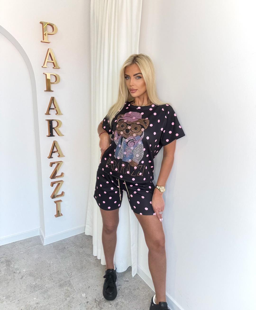 Lekki i wygodny komplet na co dzień, który łączy styl z maksymalnym komfortem. T-shirt o luźnym kroju z efektowną aplikacją i modnym printem w groszki nadaje całości uroczego charakteru. Dopasowane kolarki z regulacją w pasie pięknie podkreślają sylwetkę i zapewniają swobodę ruchów.
