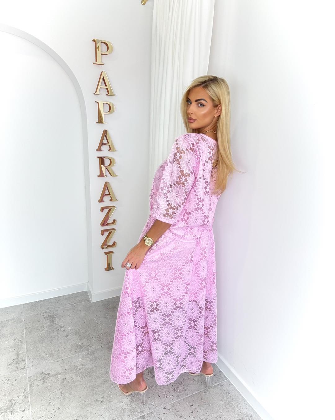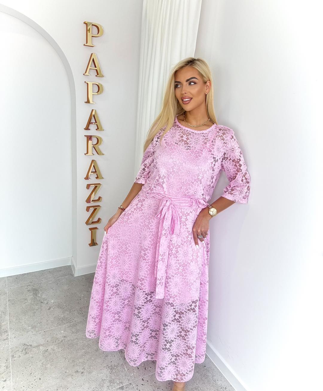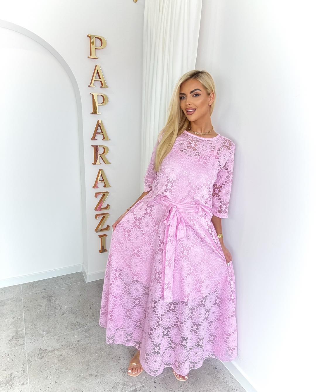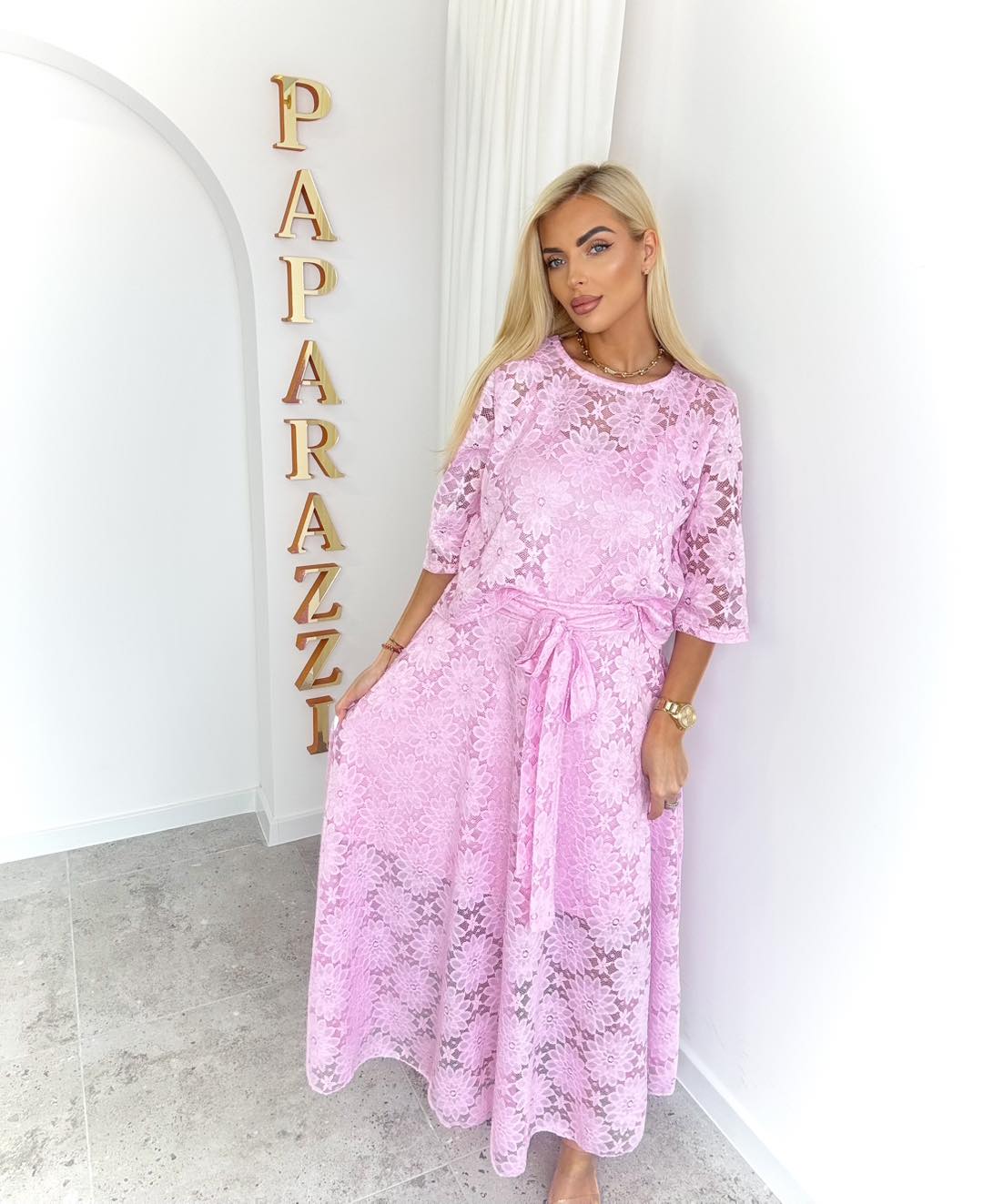 Komplet wykonany z wyjątkowej koronki o kwiatowym wzorze to esencja kobiecości i elegancji. Bluzka z rękawem 3/4 subtelnie podkreśla sylwetkę, dodając stylizacji lekkości i klasy. Maxi spódnica pięknie układa się w ruchu, tworząc zwiewny, romantyczny efekt.