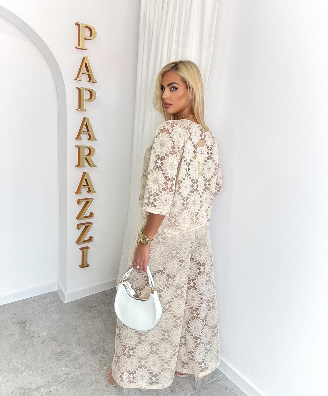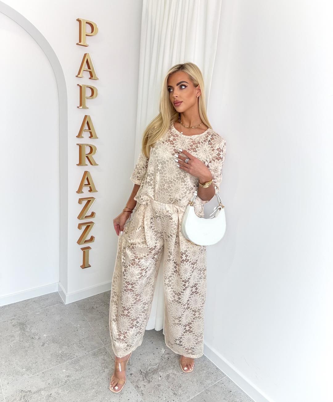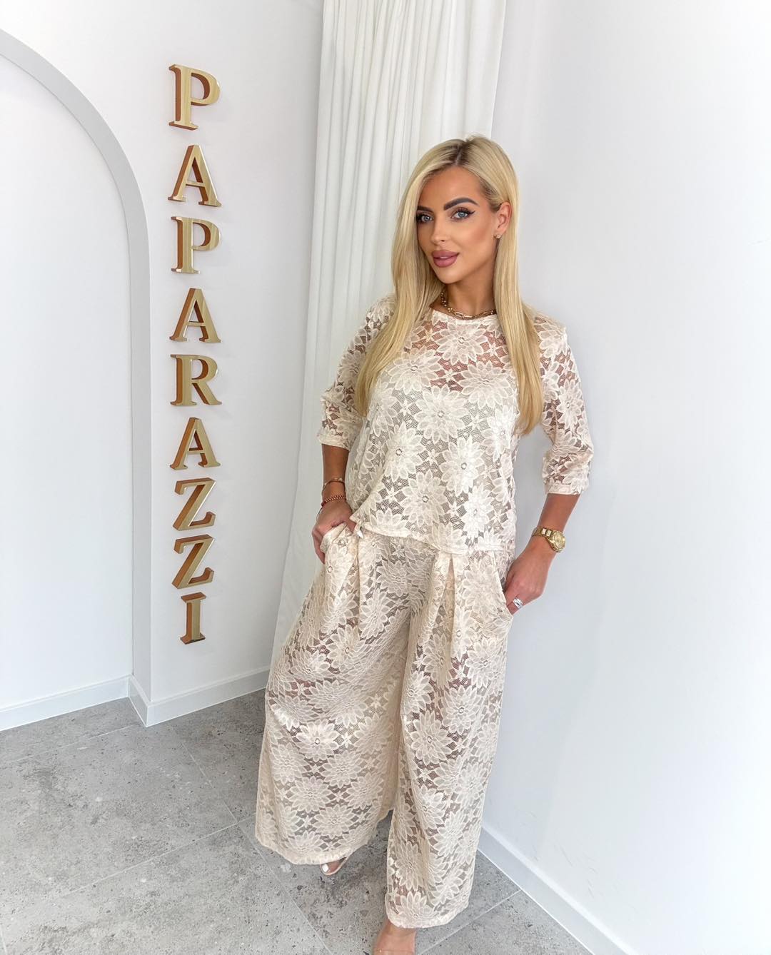 Komplet wykonany z wyjątkowej koronki o kwiatowym wzorze to esencja kobiecości i elegancji. Bluzka z rękawem 3/4 subtelnie podkreśla sylwetkę, dodając stylizacji lekkości i klasy. Szerokie spodnie pięknie układają się w ruchu, tworząc zwiewny, romantyczny efekt.