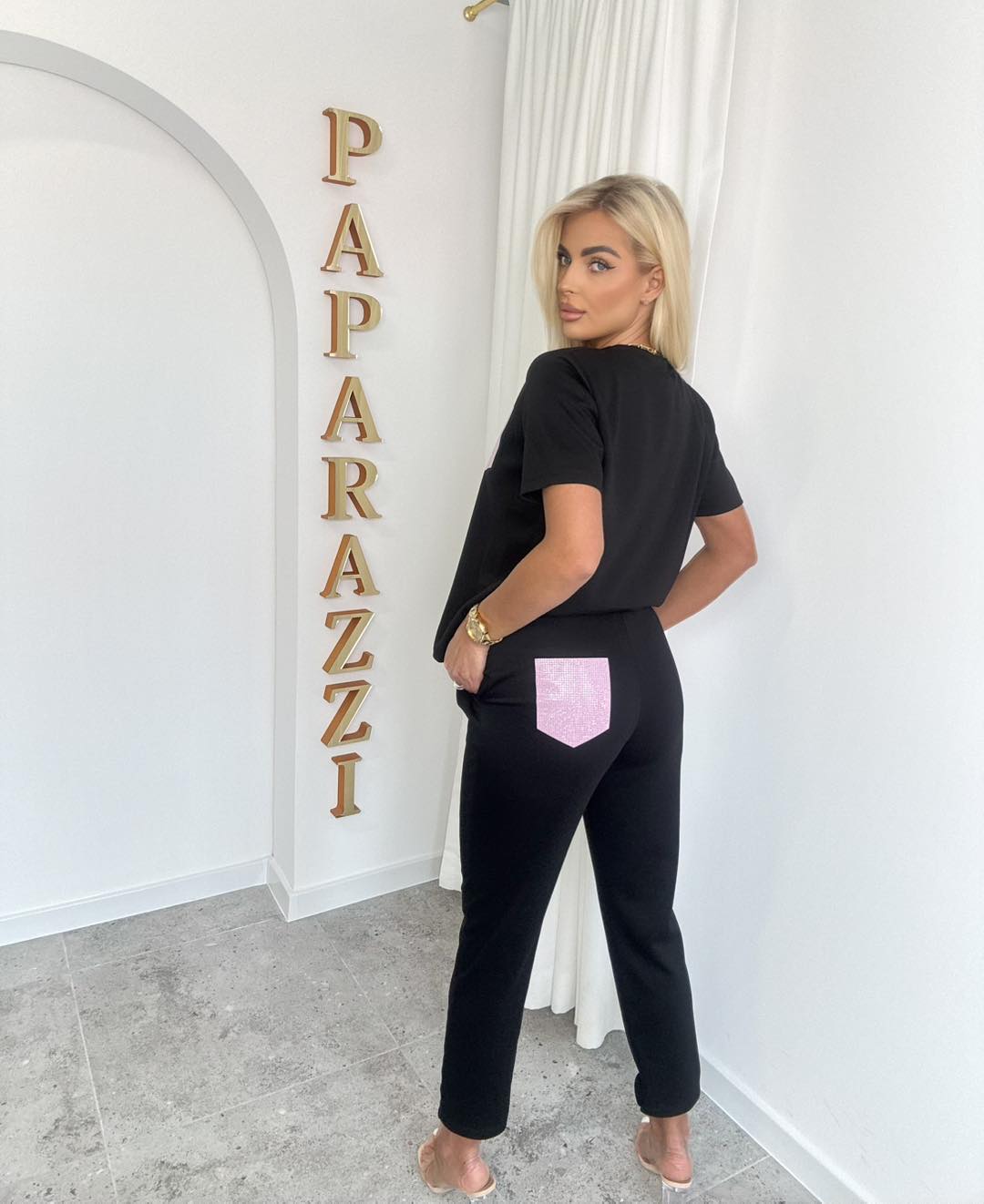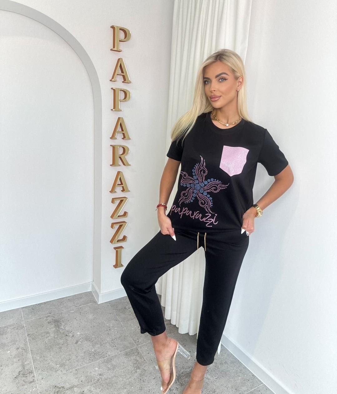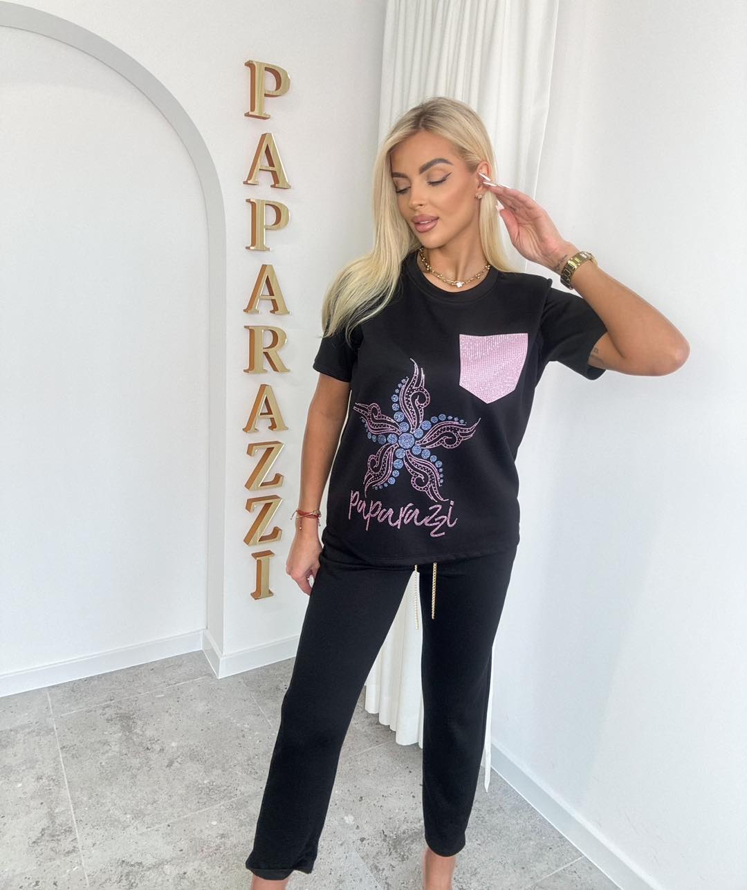 Stylowy, wygodny komplet w ciemnym odcieniu, idealny na co dzień. Luźny t-shirt z tłoczoną aplikacją oraz spodniami o swobodnym kroju tworzy modny, casualowy look.