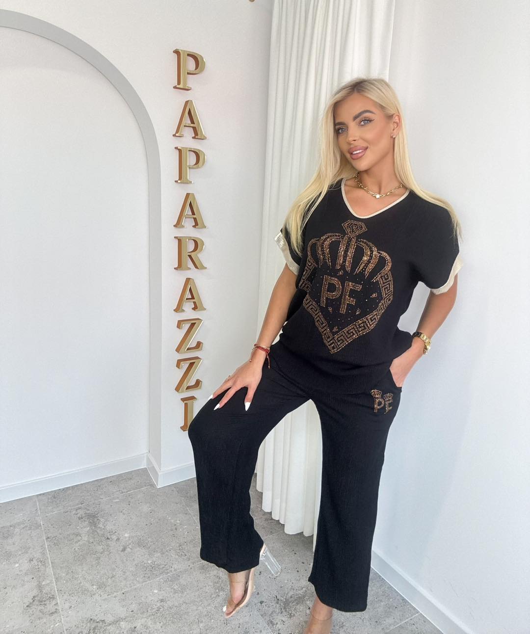 Elegancki, letni komplet w odcieniu czerni, który łączy wygodę z subtelnym luksusem. Luźna bluzka o swobodnym kroju z opadającym ramieniem została ozdobiona efektownym motywem korony z delikatnych zdobień, nadając stylizacji wyjątkowego charakteru. Szerokie spodnie z lekkiego, przewiewnego materiału zapewniają komfort noszenia i pięknie układają się w ruchu.
