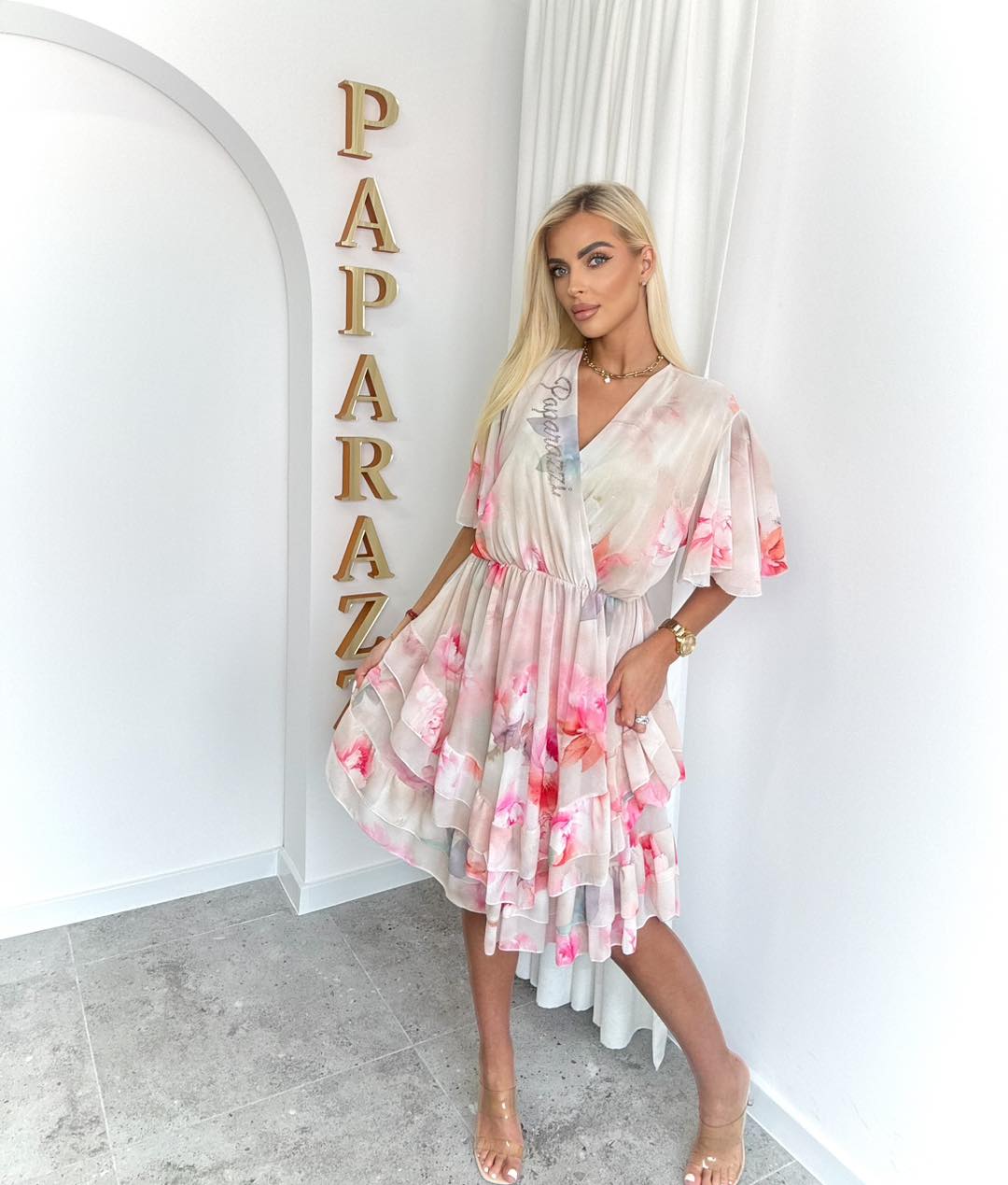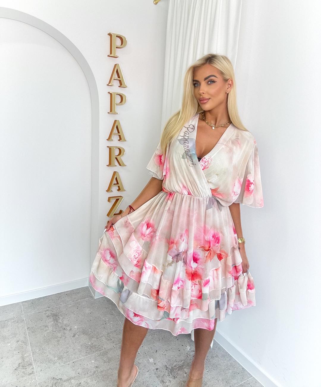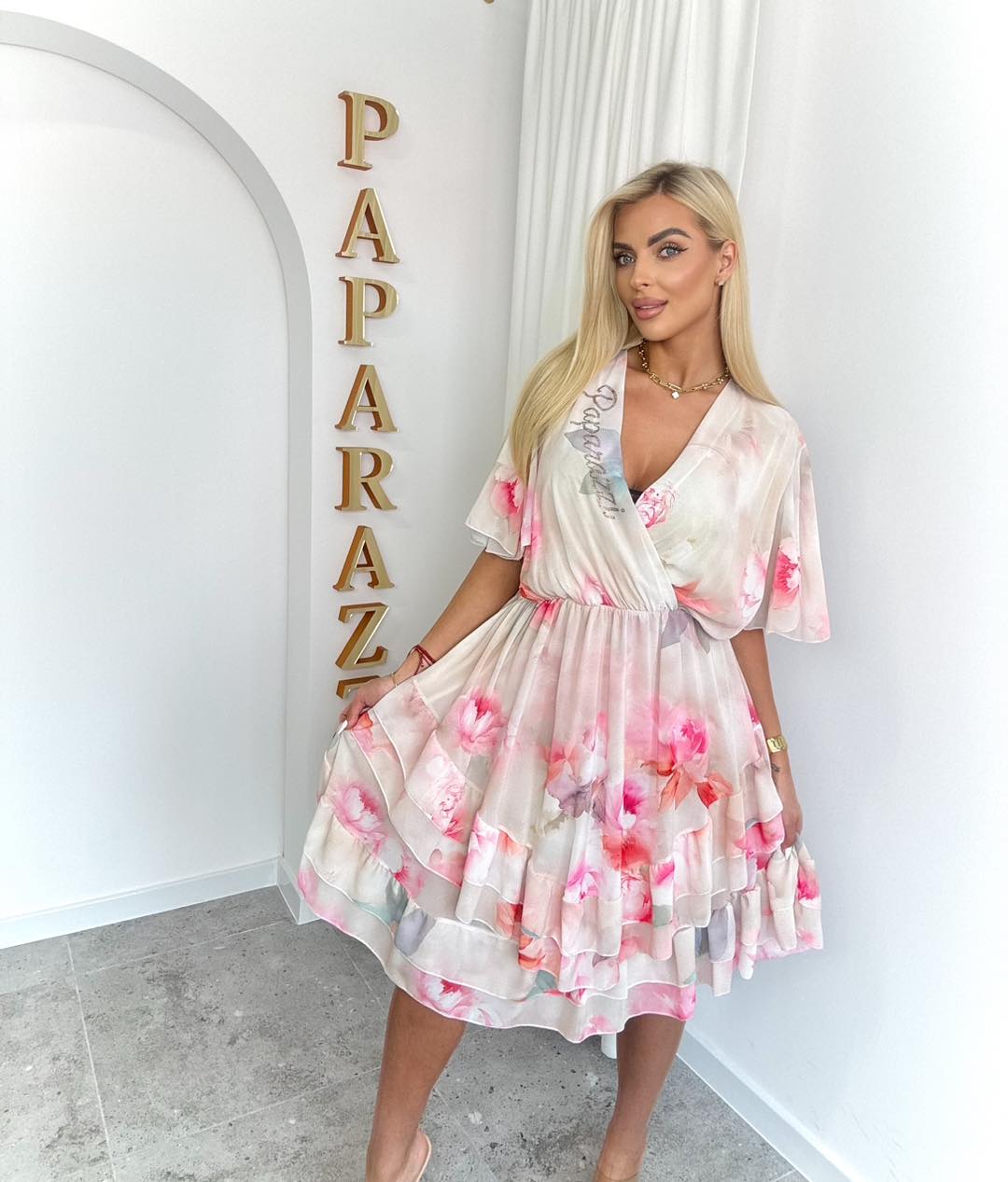Zwiewna, kobieca sukienka w romantycznym wydaniu, idealna na ciepłe dni i wyjątkowe okazje. Wykonana z lekkiego, delikatnie transparentnego materiału, pięknie układa się na sylwetce, zapewniając komfort i swobodę ruchów. Kwiatowy print w odcieniach różu dodaje świeżości i subtelnej elegancji.