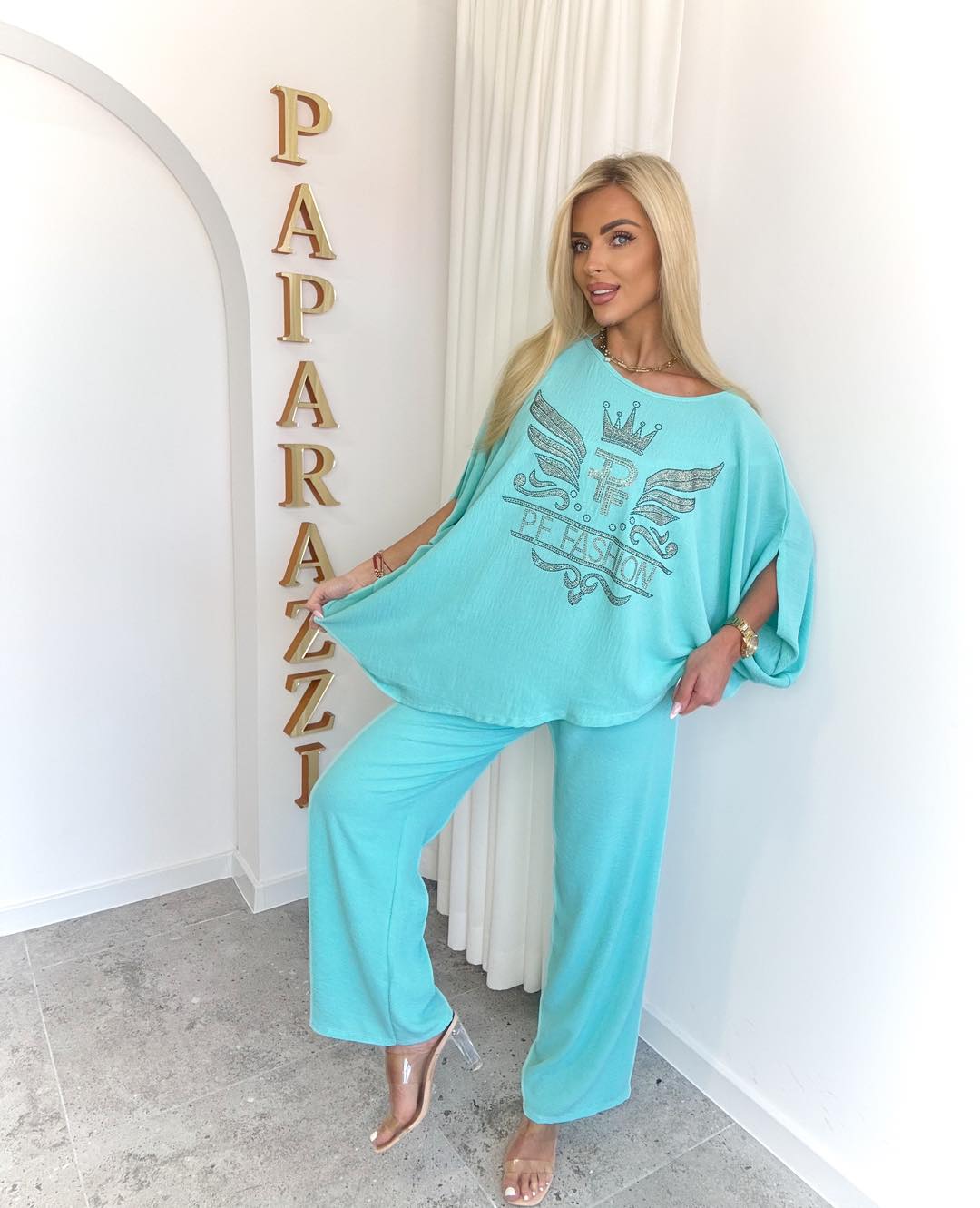 Górę stanowi luźna bluzka o oversize’owym kroju z szerokimi rękawami, ozdobiona efektownym, złotym nadrukiem, który nadaje całości modowego, wyrazistego akcentu. Spodnie z wysokim stanem i elastyczną talią doskonale dopasowują się do sylwetki, a ich prosty, lekko zwężany krój gwarantuje komfort i stylowy wygląd.