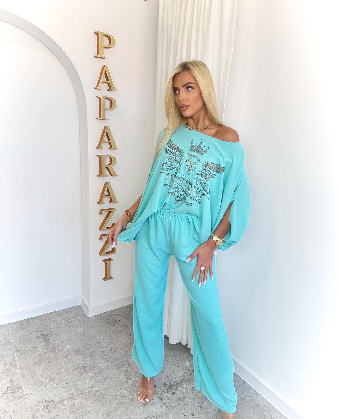 Stylowy komplet, który przyciąga uwagę i dodaje charakteru każdej stylizacji. Wykonany z miękkiego, przyjemnego w dotyku materiału, zapewnia wygodę i swobodę noszenia przez cały dzień. Górę stanowi luźna bluzka o oversize’owym kroju z szerokimi rękawami, ozdobiona efektownym, złotym nadrukiem, który nadaje całości modowego, wyrazistego akcentu. Spodnie z wysokim stanem i elastyczną talią doskonale dopasowują się do sylwetki, a ich prosty, lekko zwężany krój gwarantuje komfort i stylowy wygląd. To idealny wybór na co dzień – na spacer, zakupy czy spotkanie z przyjaciółmi. W połączeniu ze sneakersami stworzy casualowy look, a z dodatkami w złotym kolorze nabierze bardziej eleganckiego charakteru.