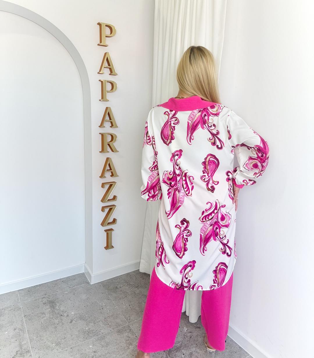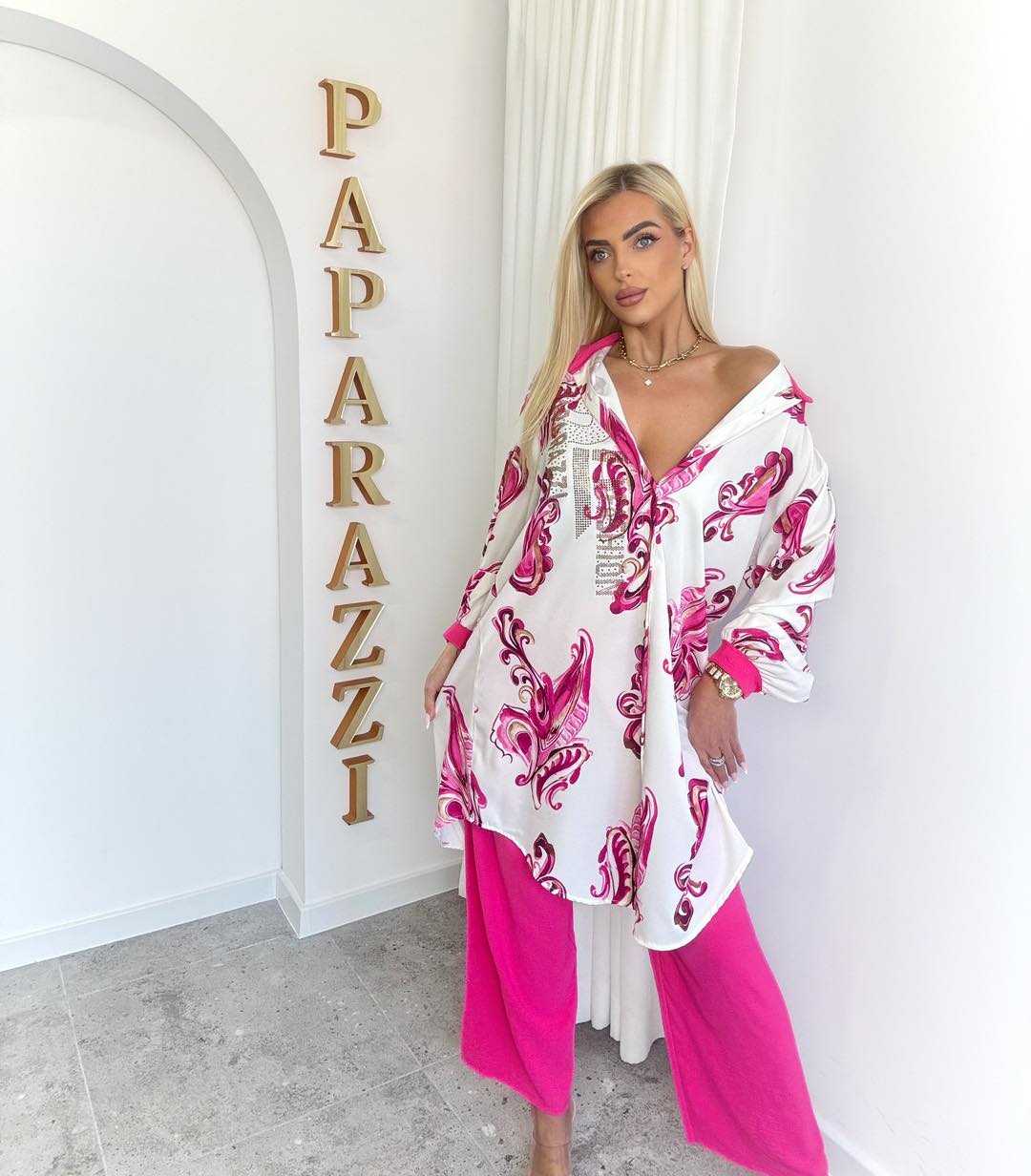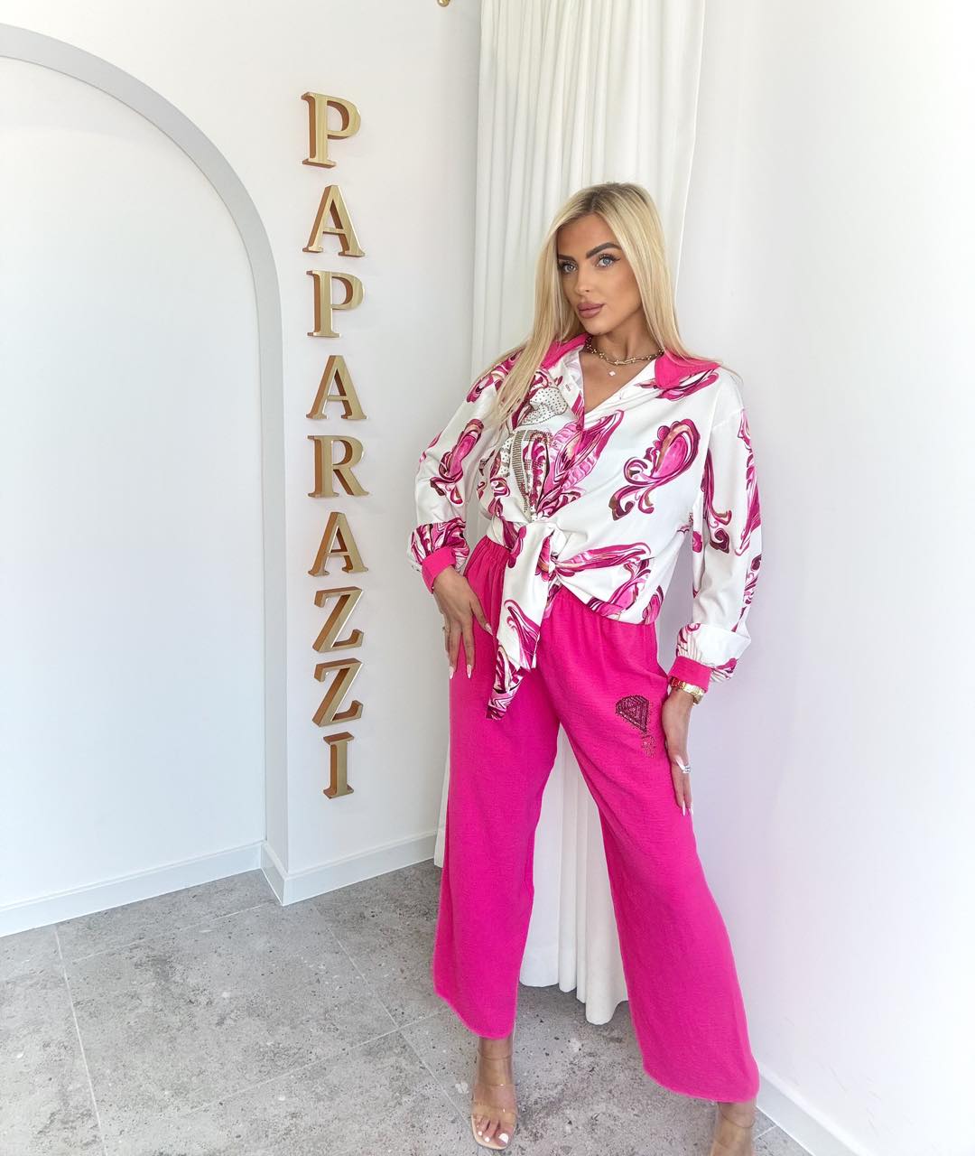 Stylowy komplet w energetycznym odcieniu różu, który przyciąga spojrzenia. Luźne spodnie z szeroką nogawką zapewniają komfort, a koszula z efektownym wzorem i możliwością wiązania lub noszenia luzem daje wiele opcji stylizacji. Idealny na lato, wyjazdy i codzienne, modne looki.
