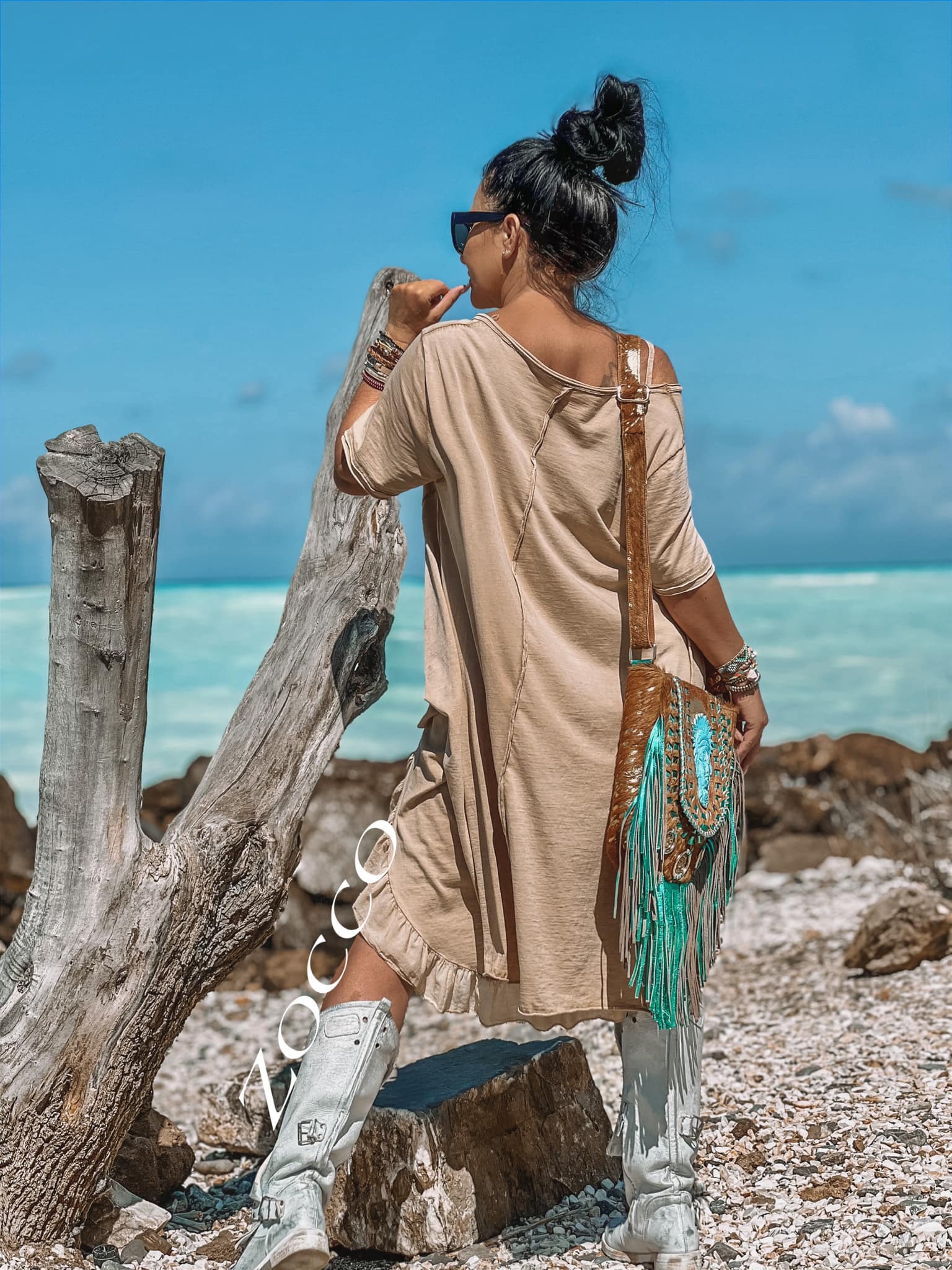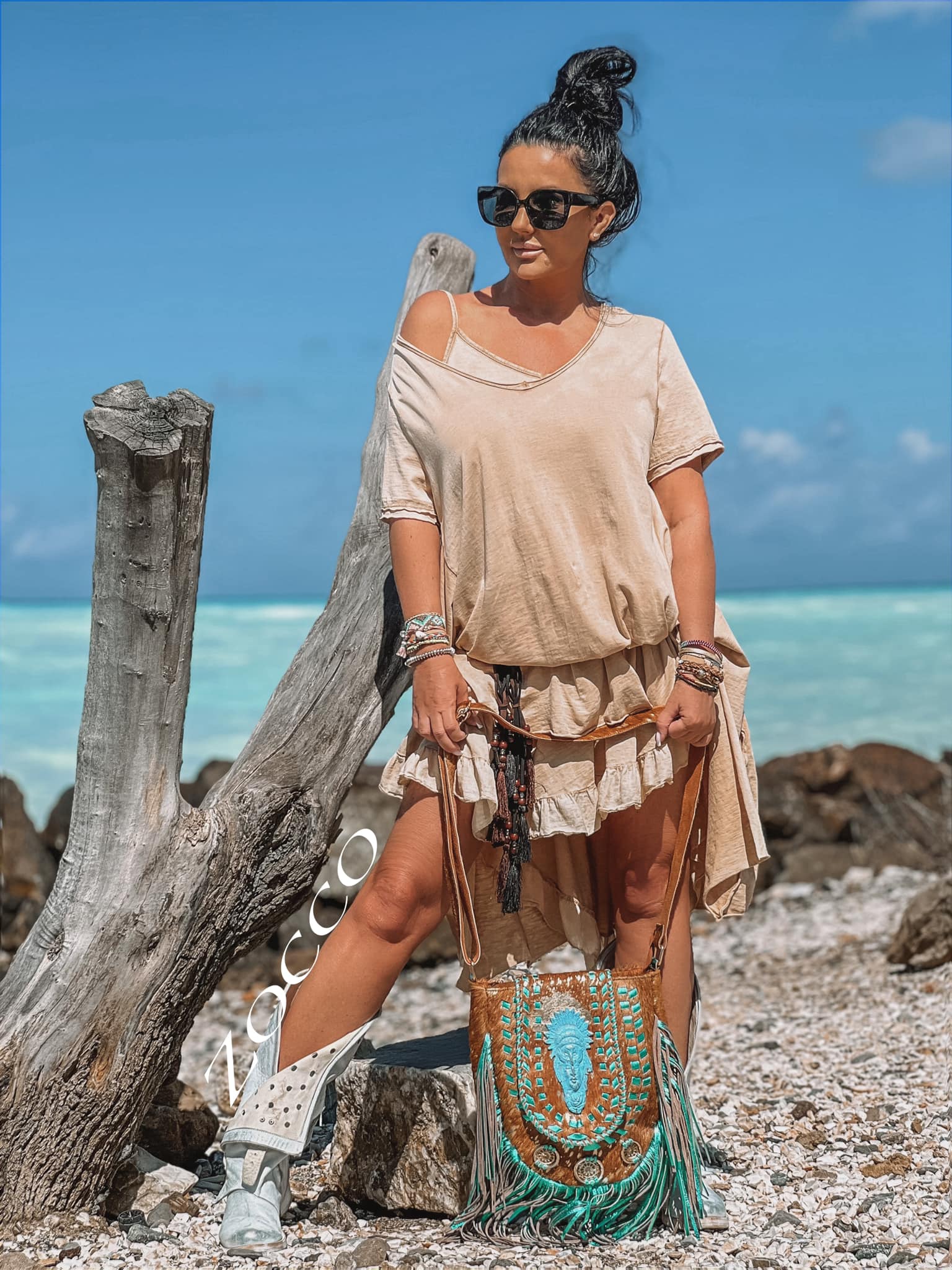 Luźny swobodny bliźniak,można nosić osobno. Sukienka na cienkich ramiączkach zakończona falbankami po bokach krótsza,druga wierzchnia w szpic ,rozszerzana ku dołowi z przodu krótsza z tyłu dłuższa.(bez paska)