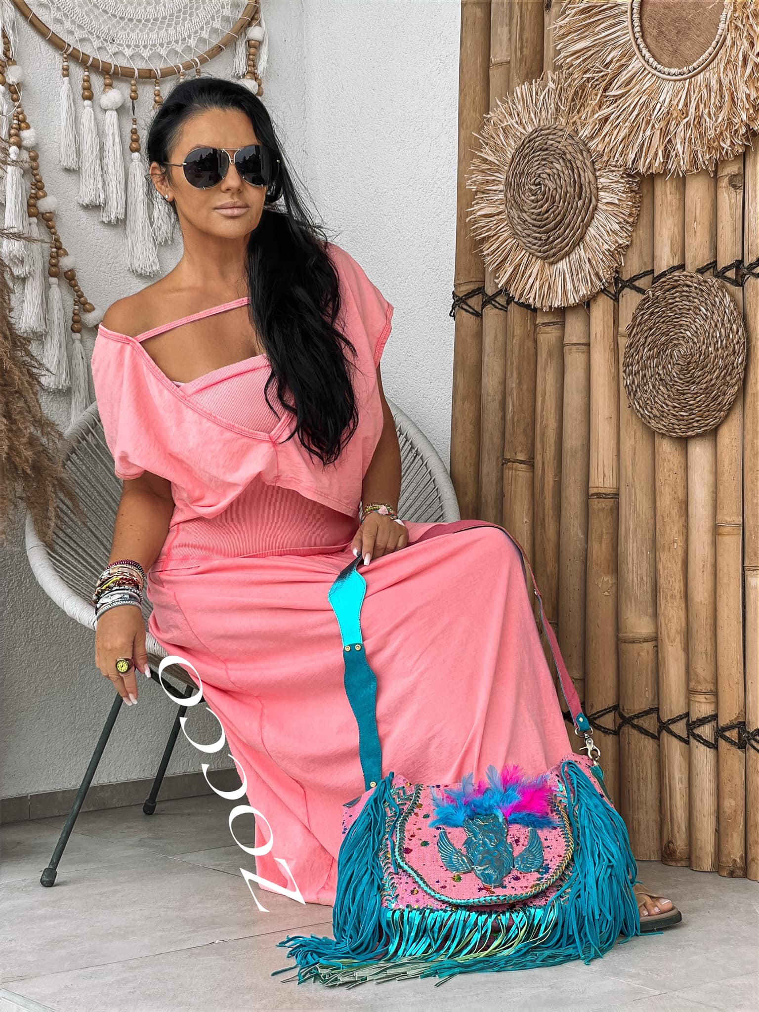 Sukienka bez ramiączek z obcisłą górą od bioder oraz krótka szeroka bluzeczka z dużym dekoltem. Rozmiar: Bluzka: Biust:67x2 Pas:62x2 Długość:49cm Sukienka: Biust:43-56x2 Pas:38-50x2 Biodra:76x2 Skład: Bawełna 100%