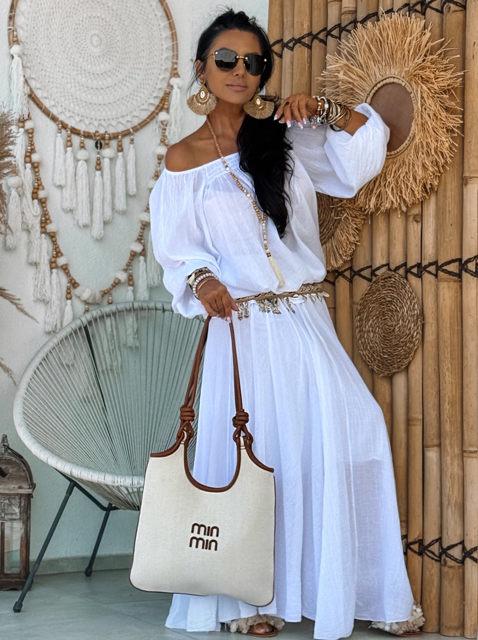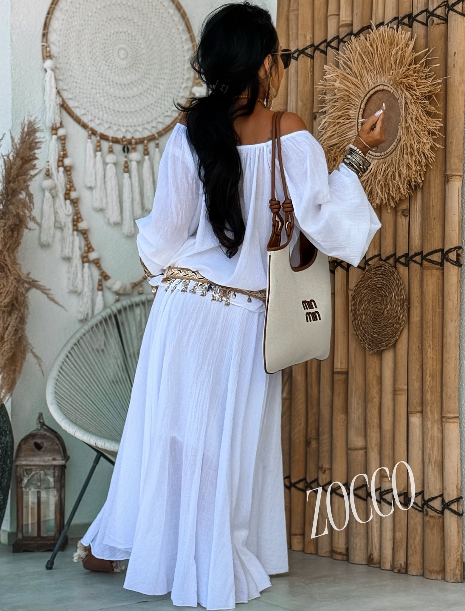 Lekki, zwiewny komplet Boho na poszewce. Luźna bluzeczka z odkrytymi ramionami, rękawki szerokie zakończone gumeczką. Spódnica szeroka maxi.