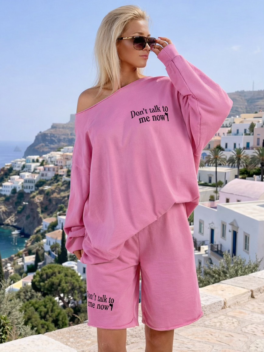 Bawełniany komplet. Swobodna oversize bluza z długim rękawkiem i napisami oraz luźne krótkie spodenki.