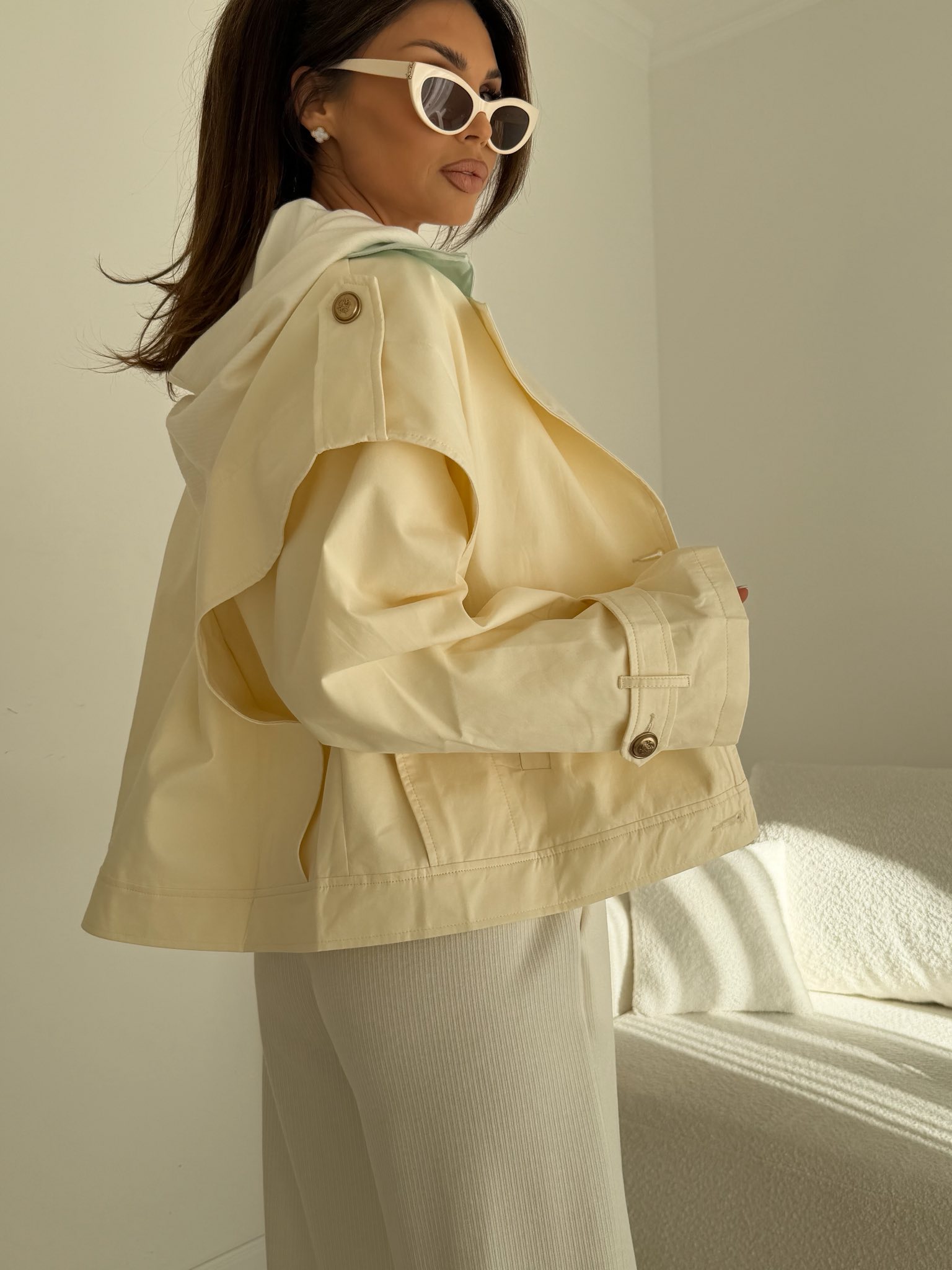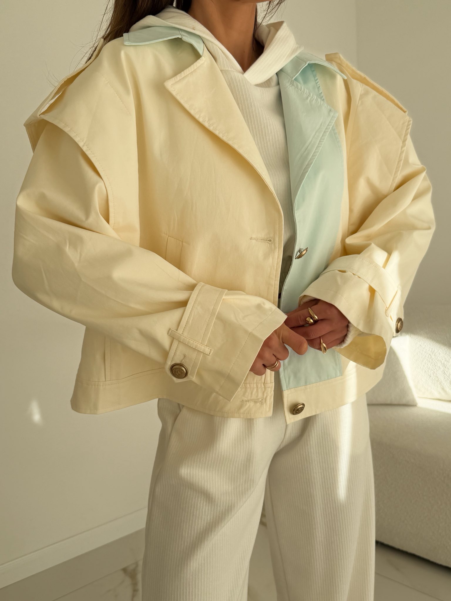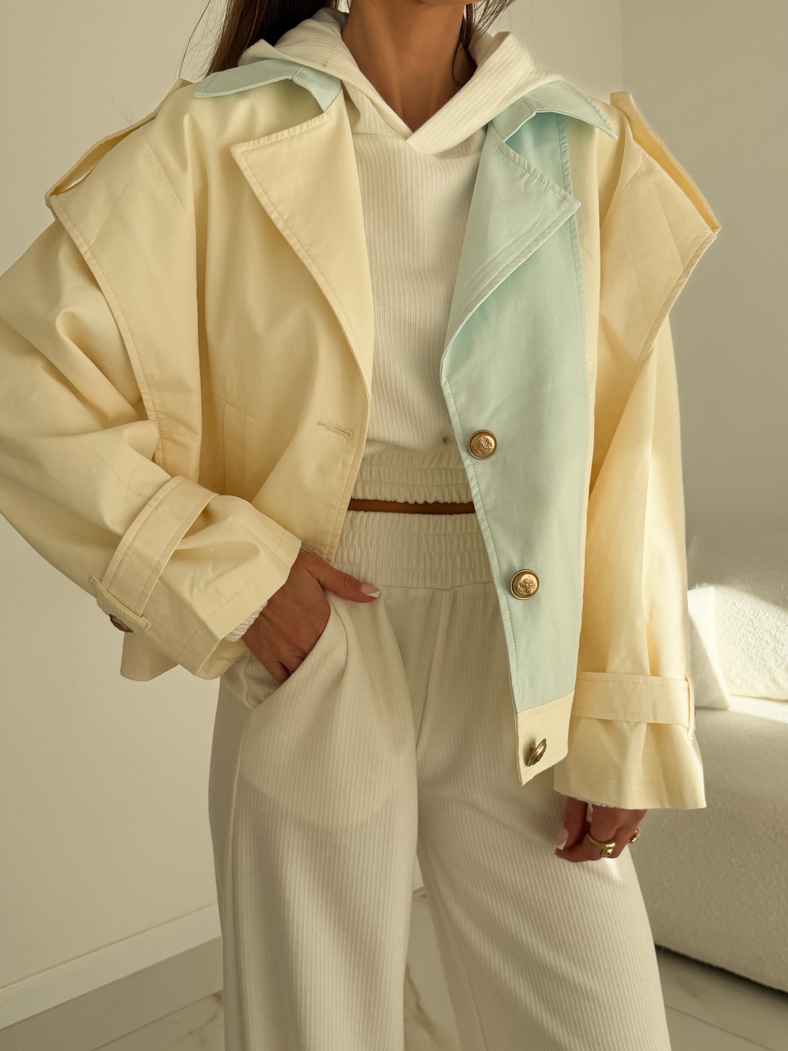 Kremowa kurtka typu trench z kontrastowym dodatkiem w odcieniu delikatnego błękitu. Nowoczesna, świeża i bardzo stylowa, świetnie wpisuje się w wiosenne trendy. Lekka forma i modny krój sprawiają, że doskonale uzupełnia zarówno casualowe, jak i …