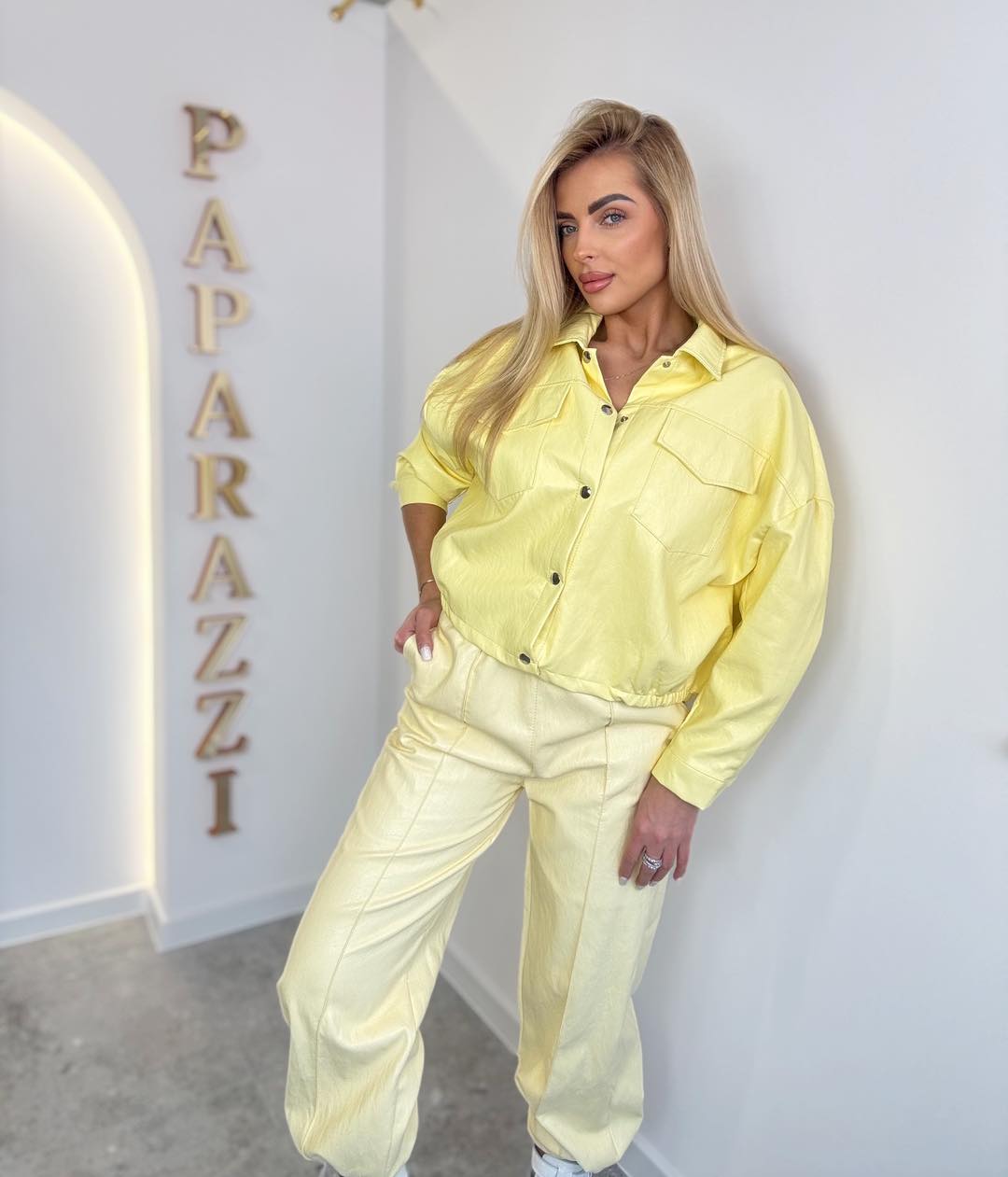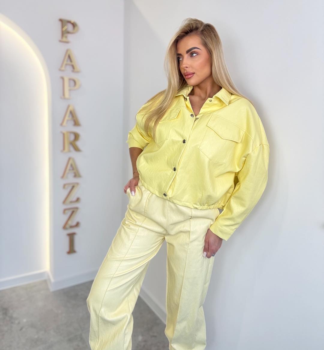 Kurtka z ekoskóry o luźnym fasonie, z kołnierzykiem, zapinana na napy. Dół ściągany na gumeczkę.