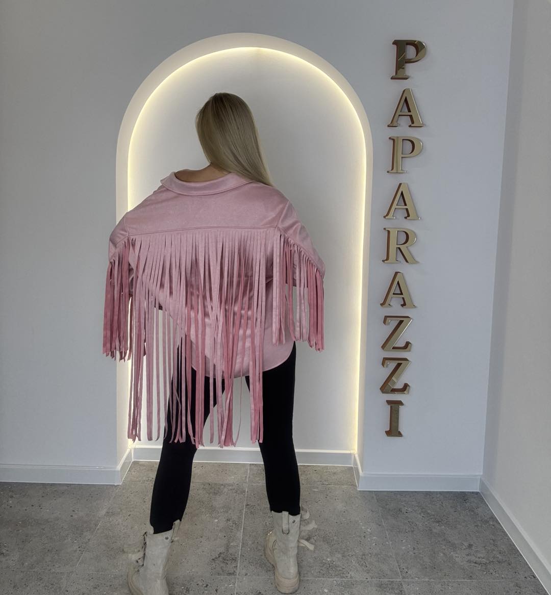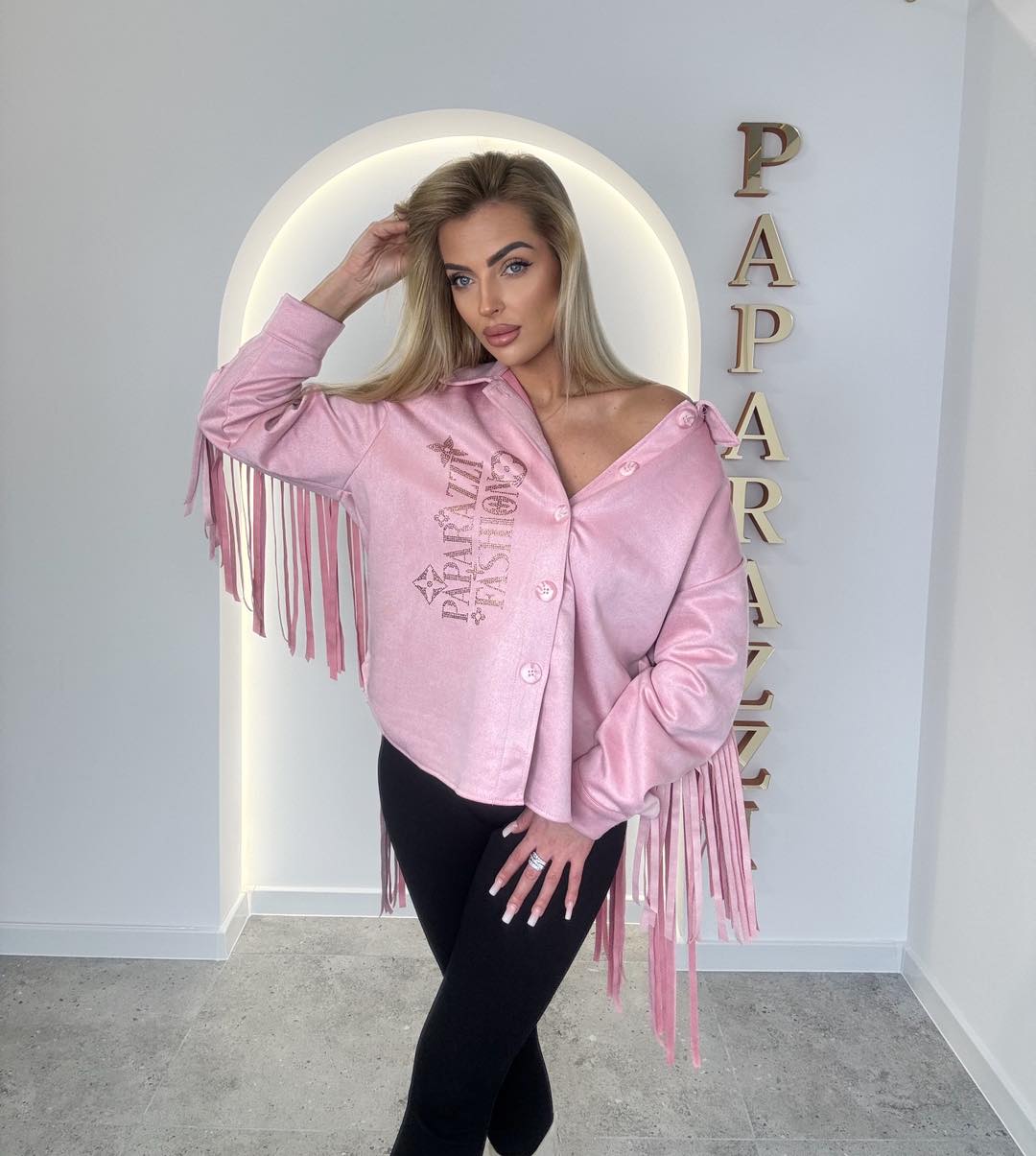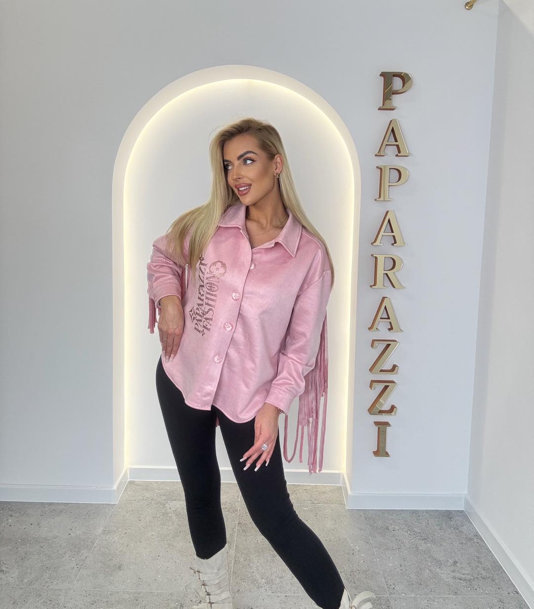 Stylowa kurtka zamszowa z ozdobnymi, długimi frędzlami. Zapinana na guziki oraz z dekoracyjnym złotym napisem.