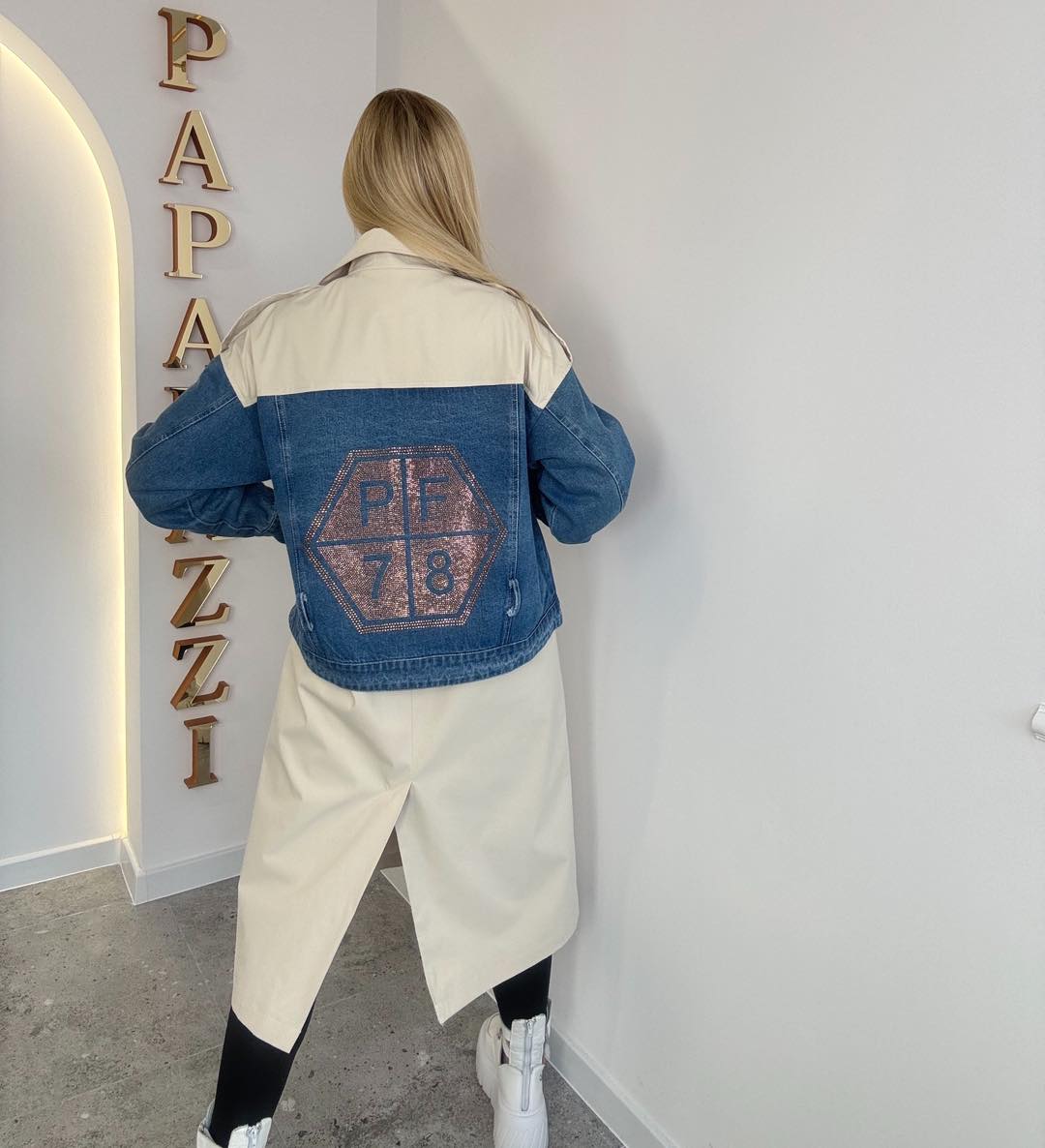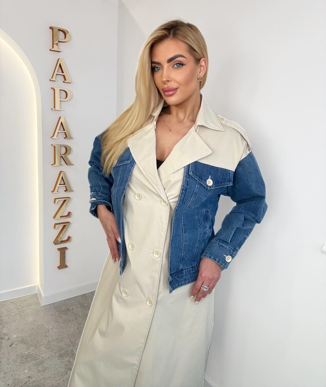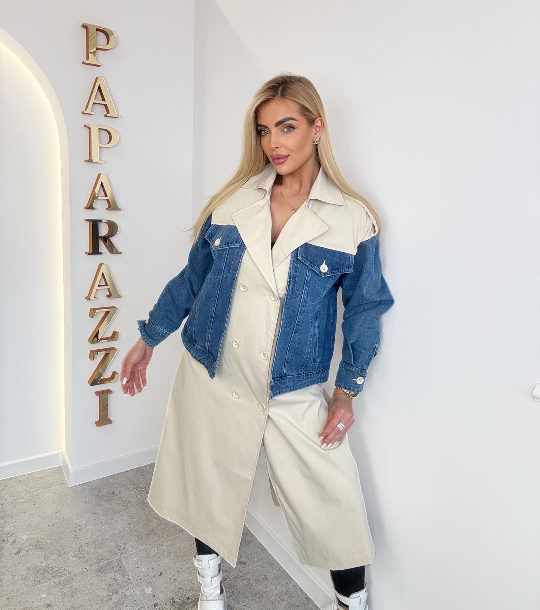 Oversizeowy płaszcz z dodatkiem jeansu i rozcięciem z tyłu.
