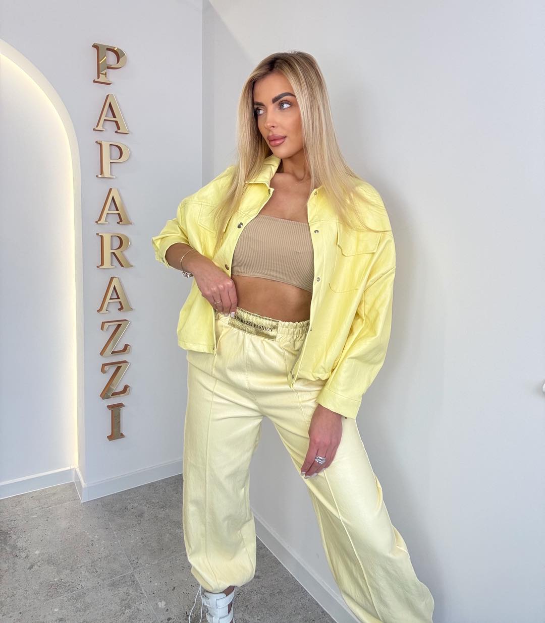 Spodnie z ekoskóry na szerokiej gumie w pasie.