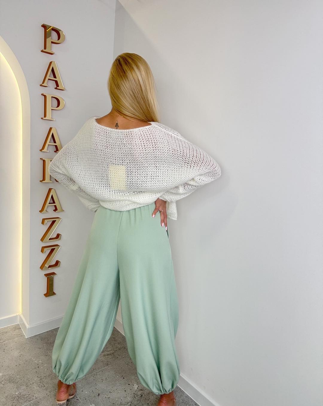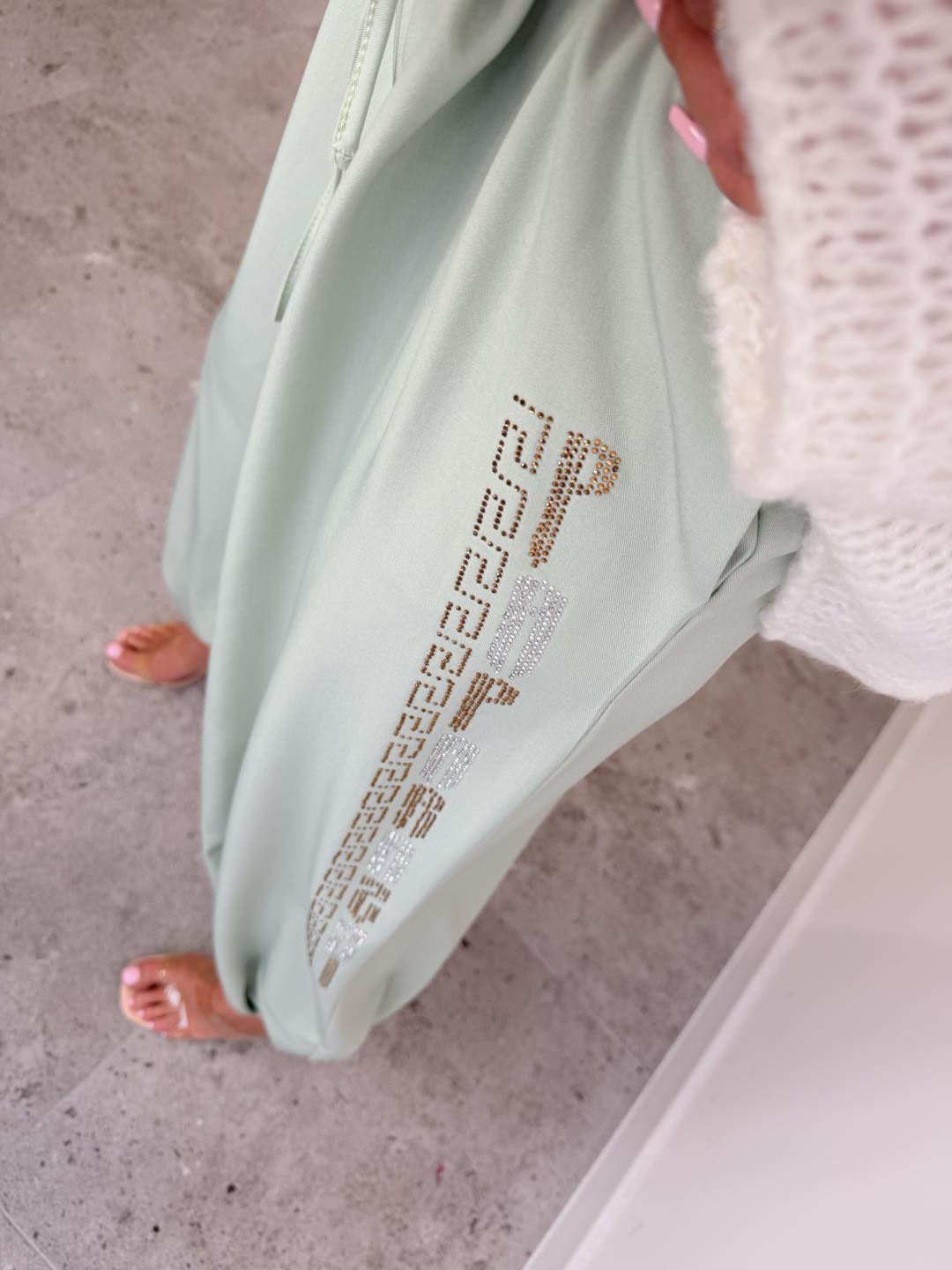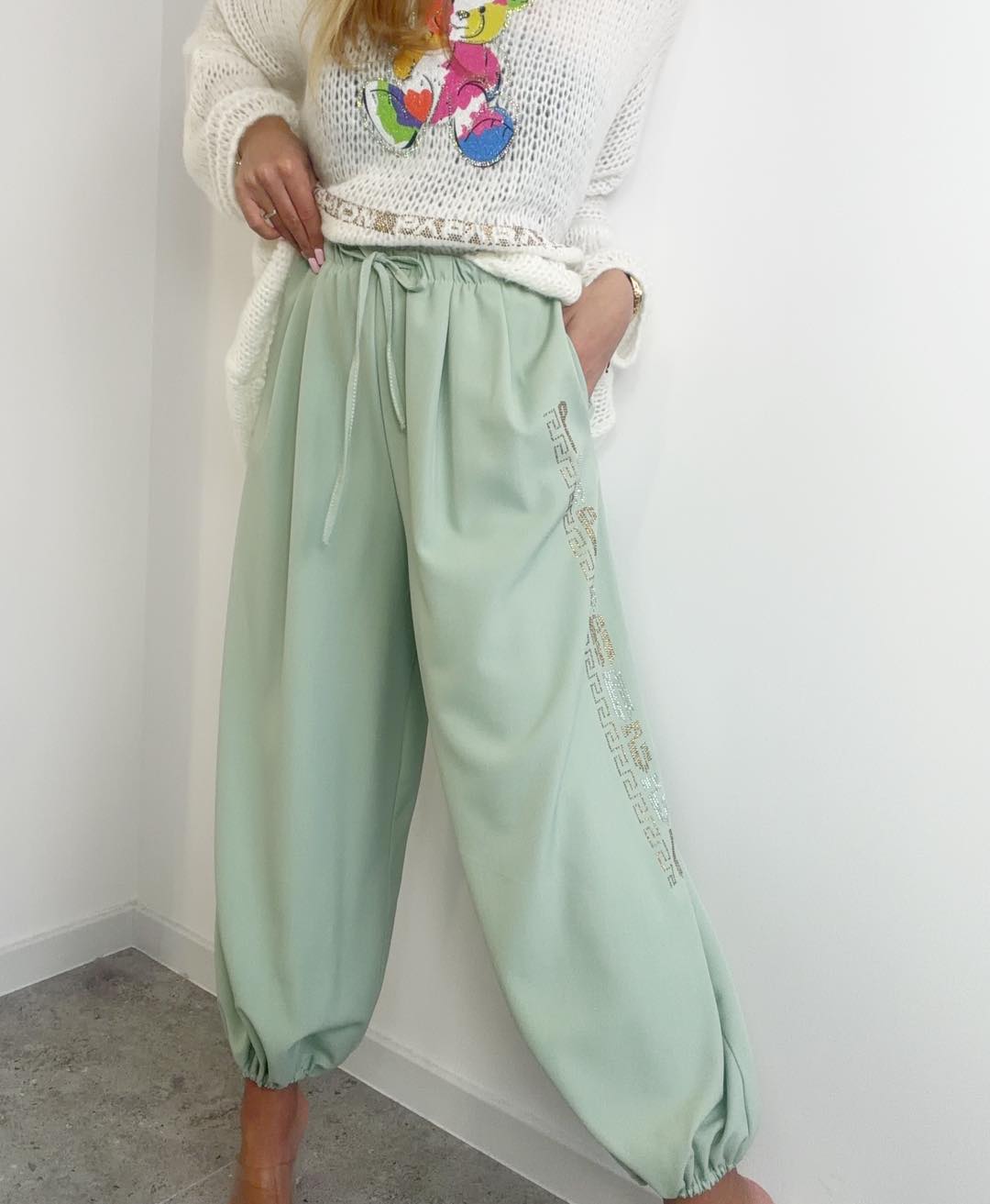 Spodnie o bardzo szerokim kroju, zakończone ściągaczem. Na boku ozdobny lampas z kamyczków.