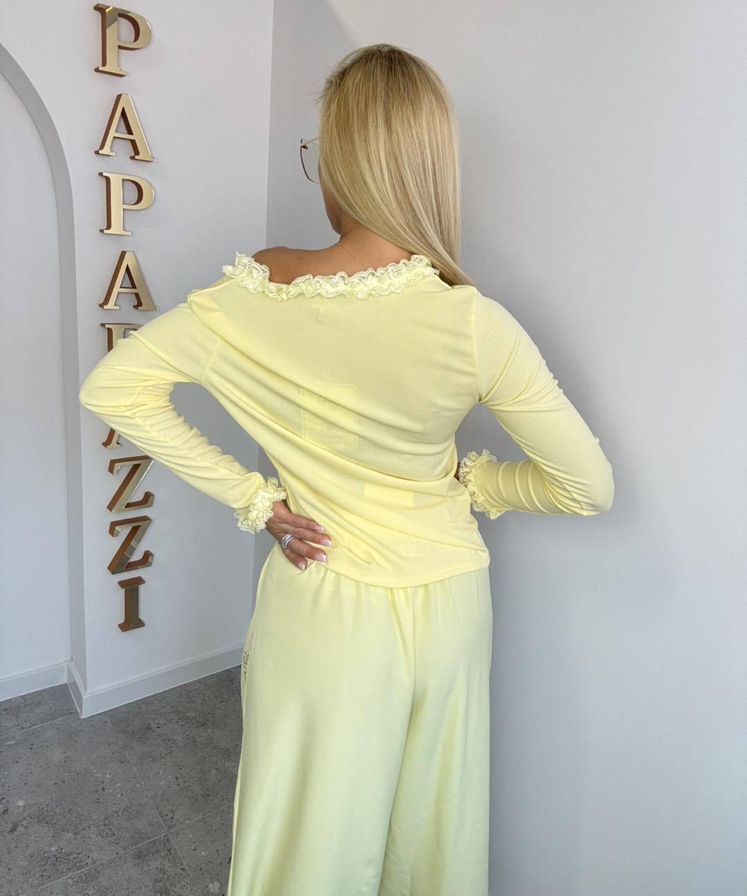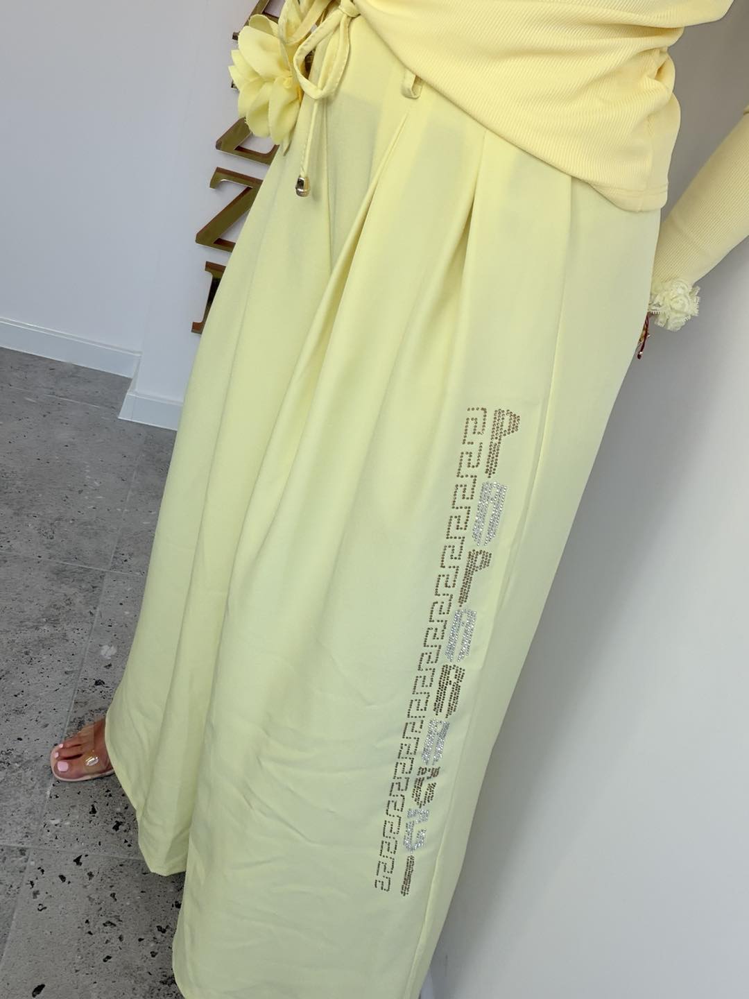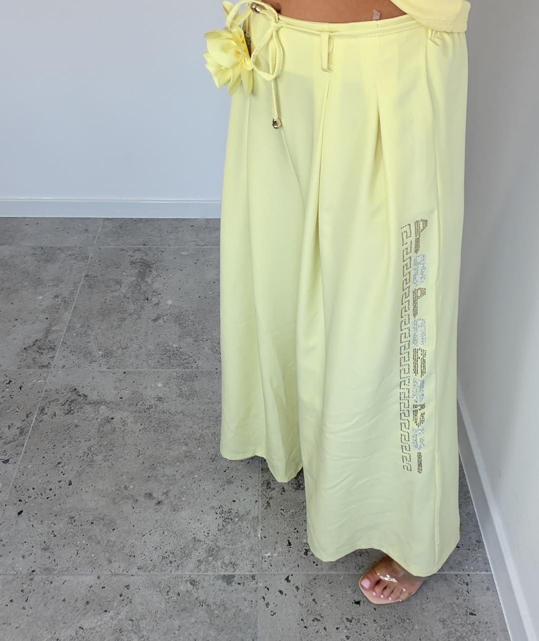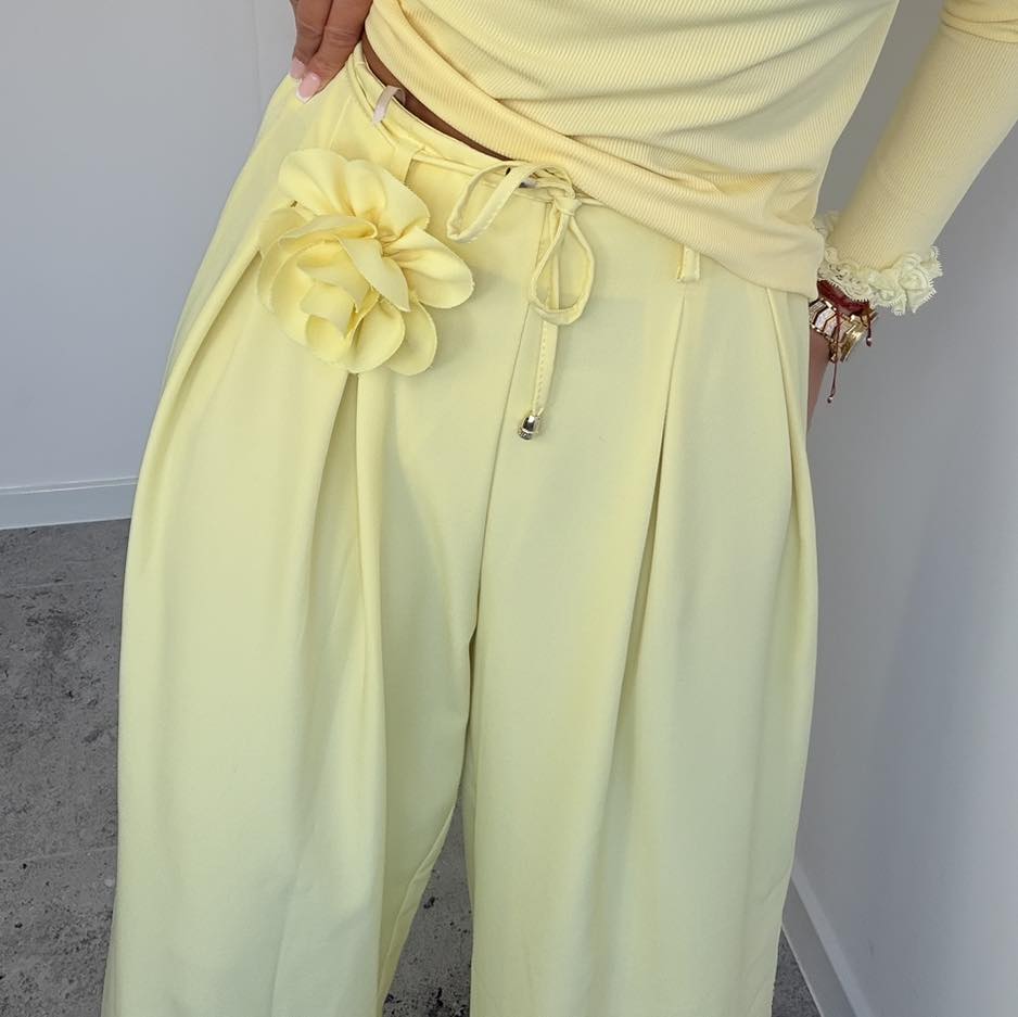 Spodnie z kontrafałdami o szerokim kroju, na pasie ozdobny kwiat. Rozmiar: Spodnie: Pas: 36-46 x2 Biodra:70x2 Długość:104cm