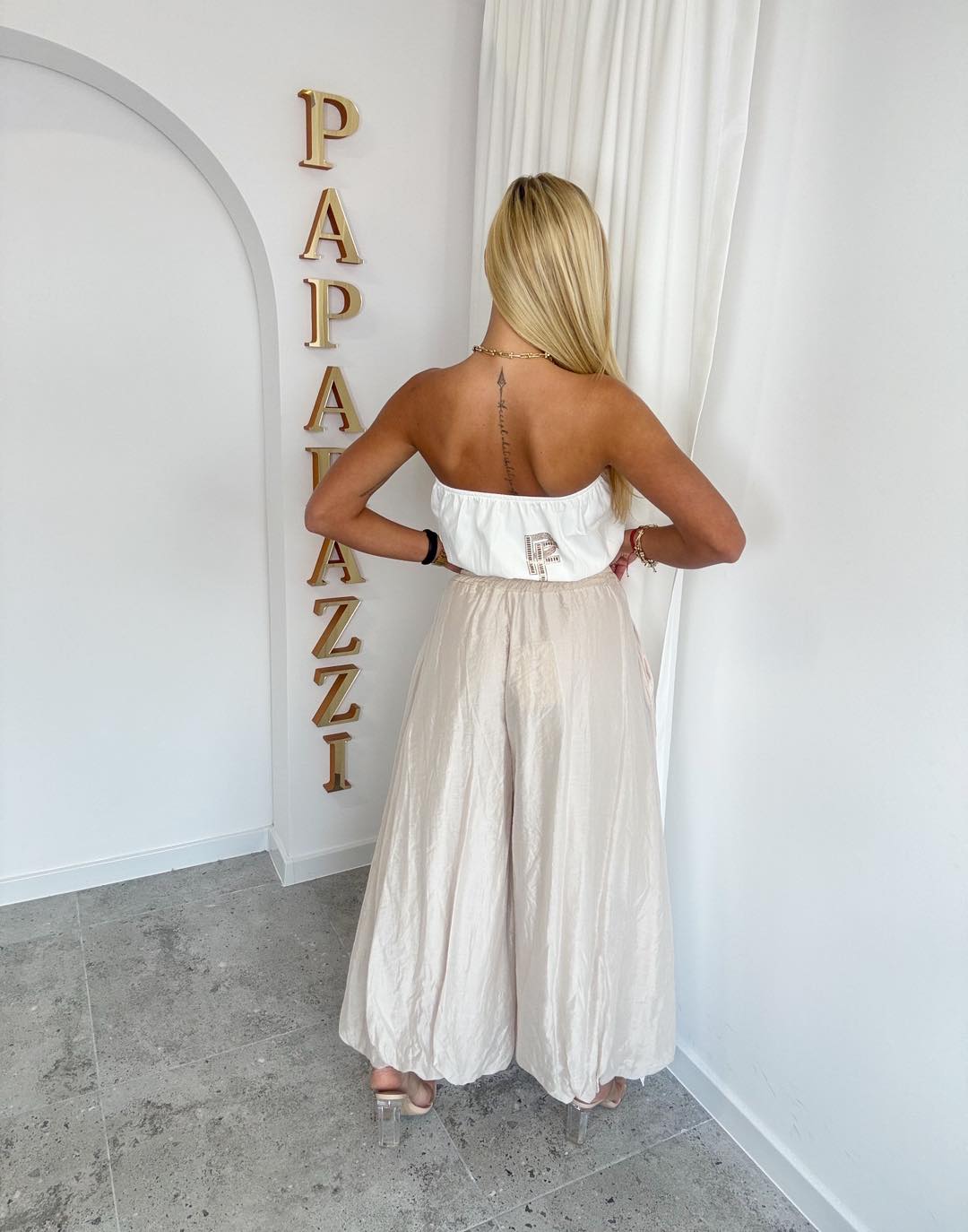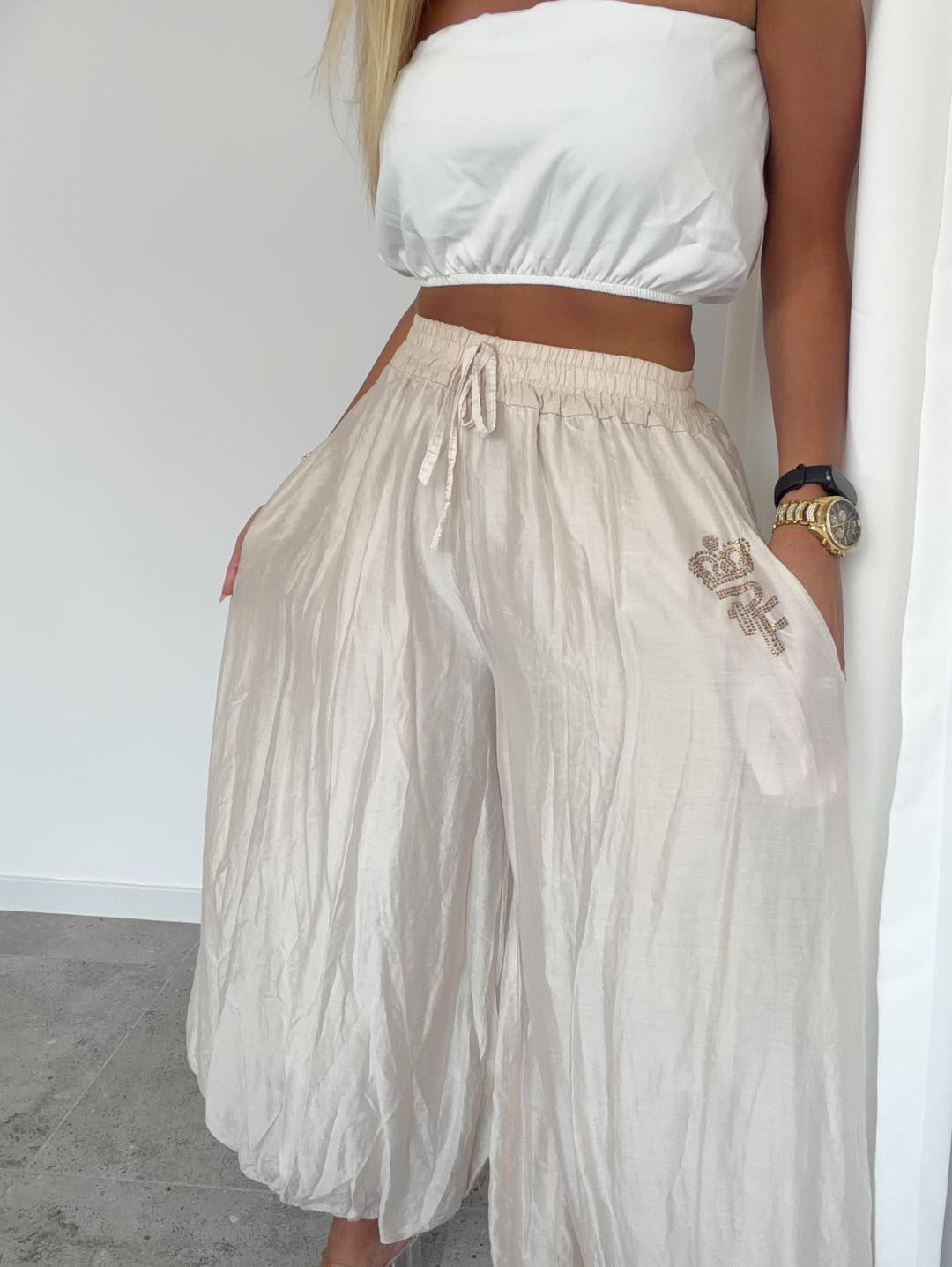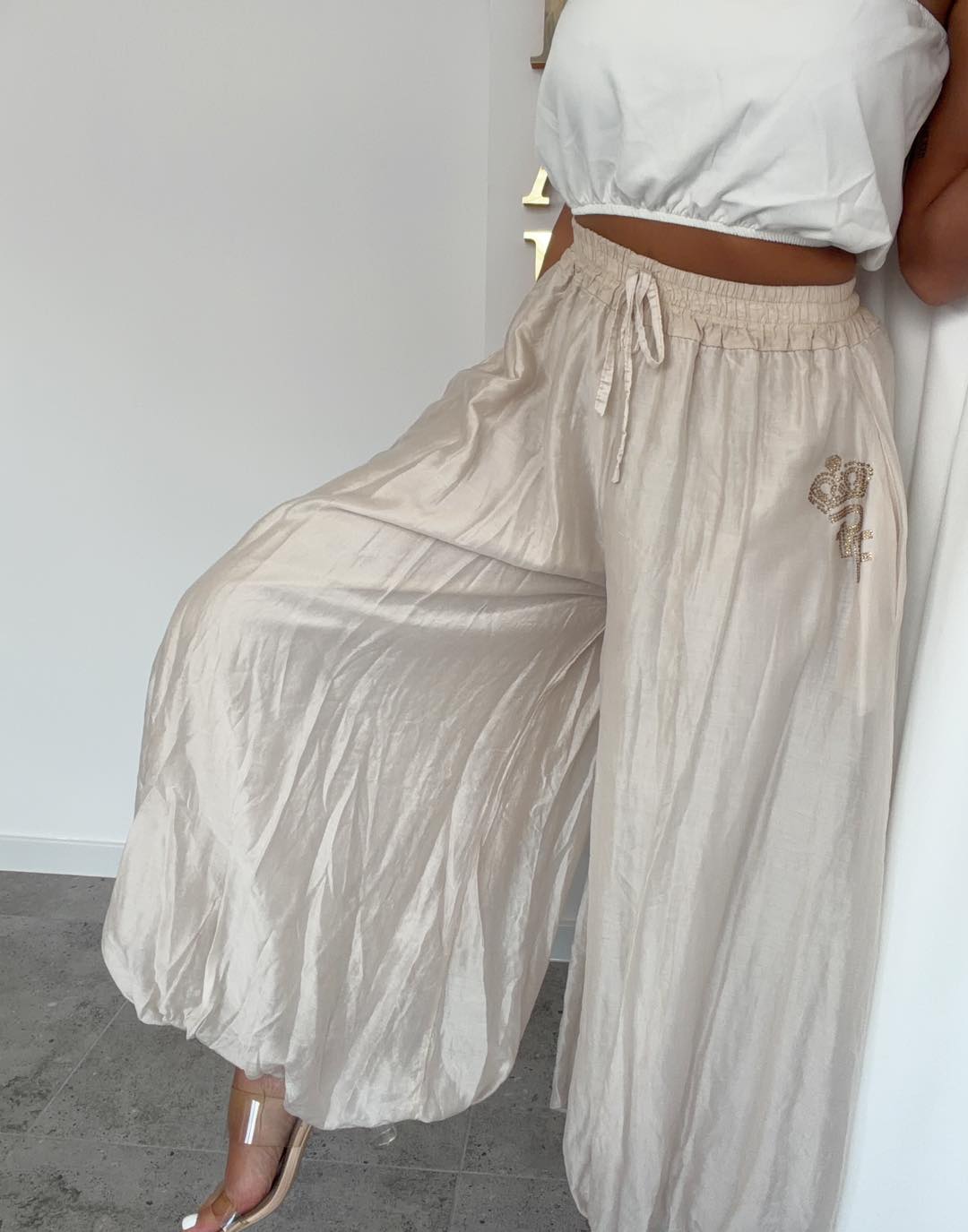 Spodnie o bardzo szerokim, lejącym kroju, na szerokiej gumie. Delikatna aplikacja przy kieszonce.