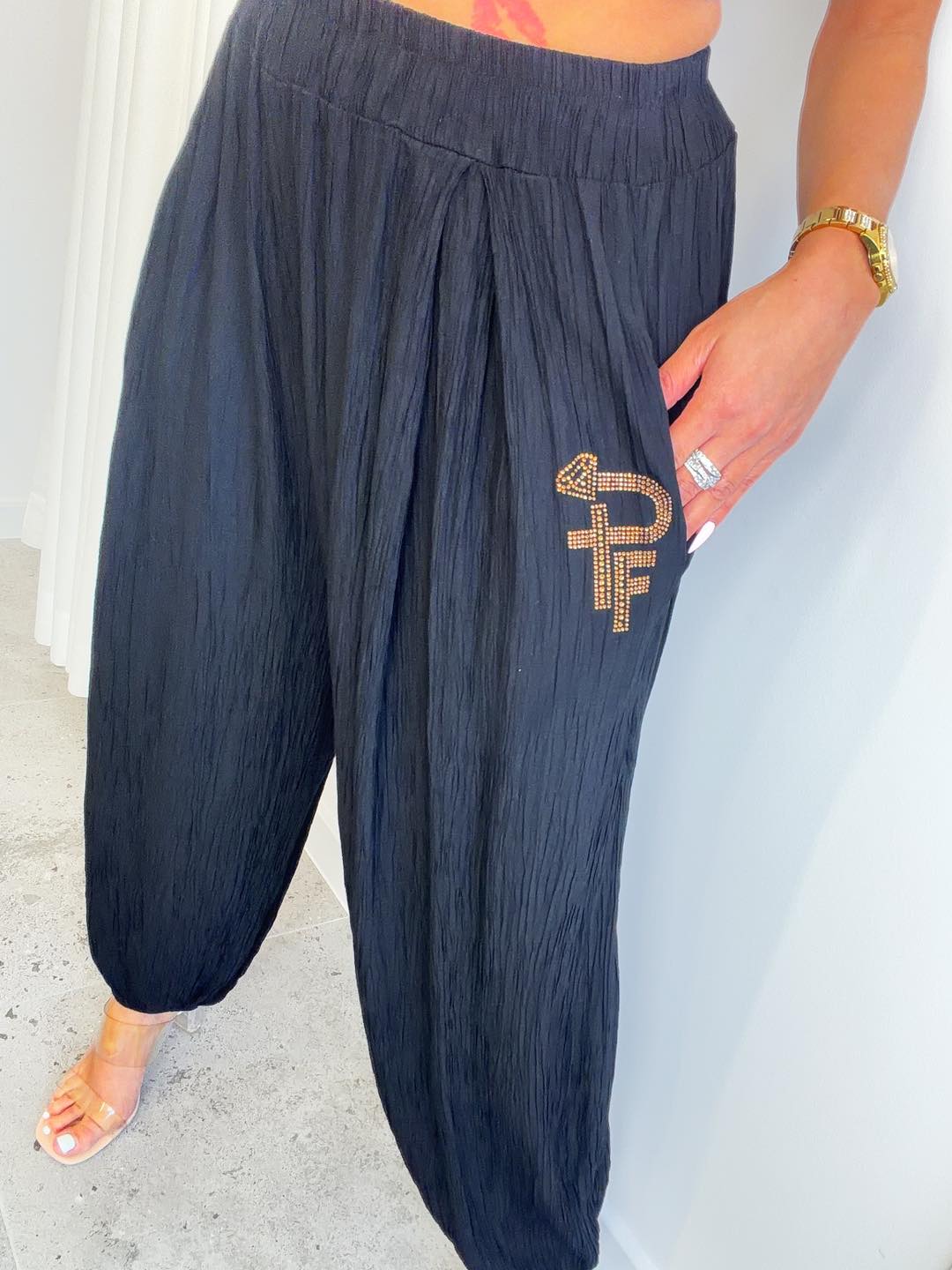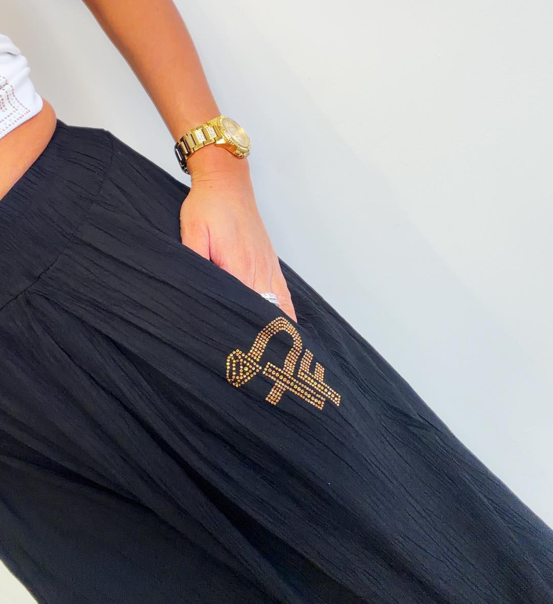 Spodnie o bardzo szerokim, lejącym kroju, na szerokiej gumie. Delikatna aplikacja przy kieszonce. Rozmiar: Pas:35-56x2 Biodra:80x2 Długość:99cm