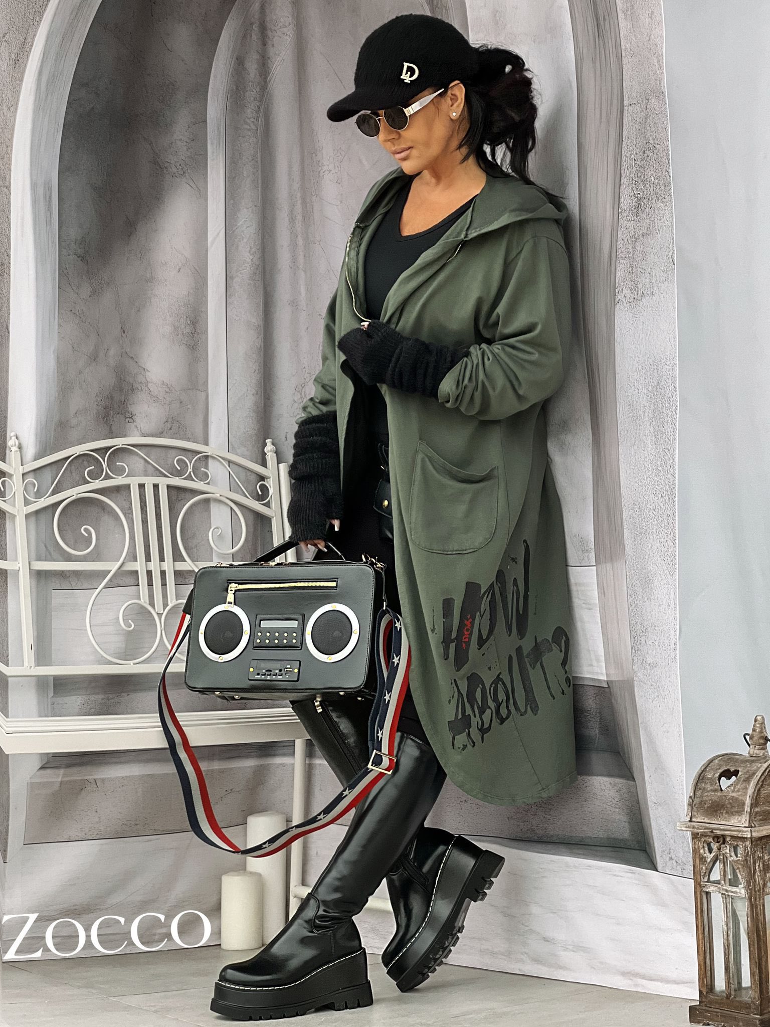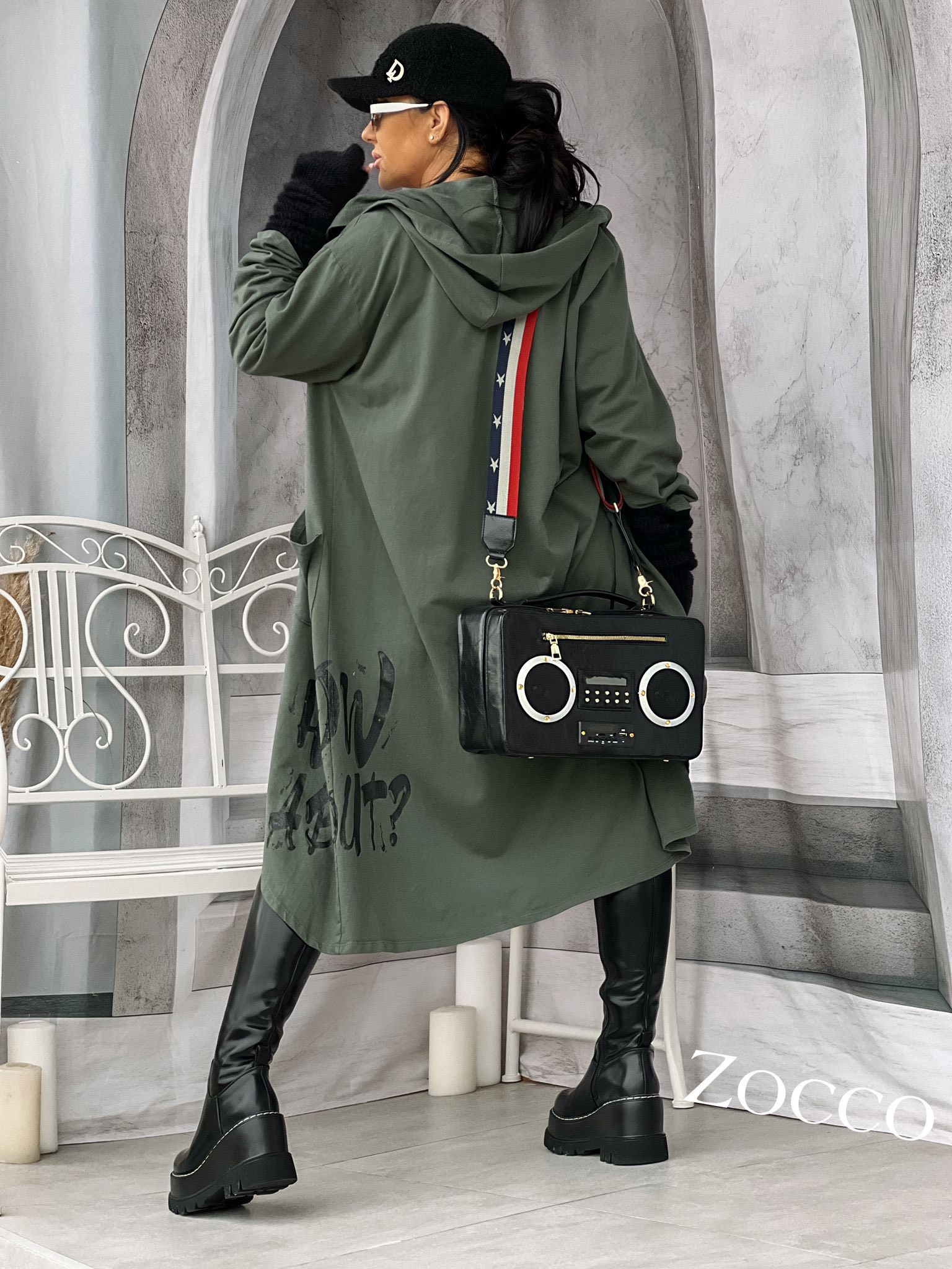 Sportowa, asymetryczna bluza na zamku Zocco ,dekoracyjne nadruki . Rozmiar: Biust:64x2 Długość:110cm Skład: Bawełna 95% Elastan 5%