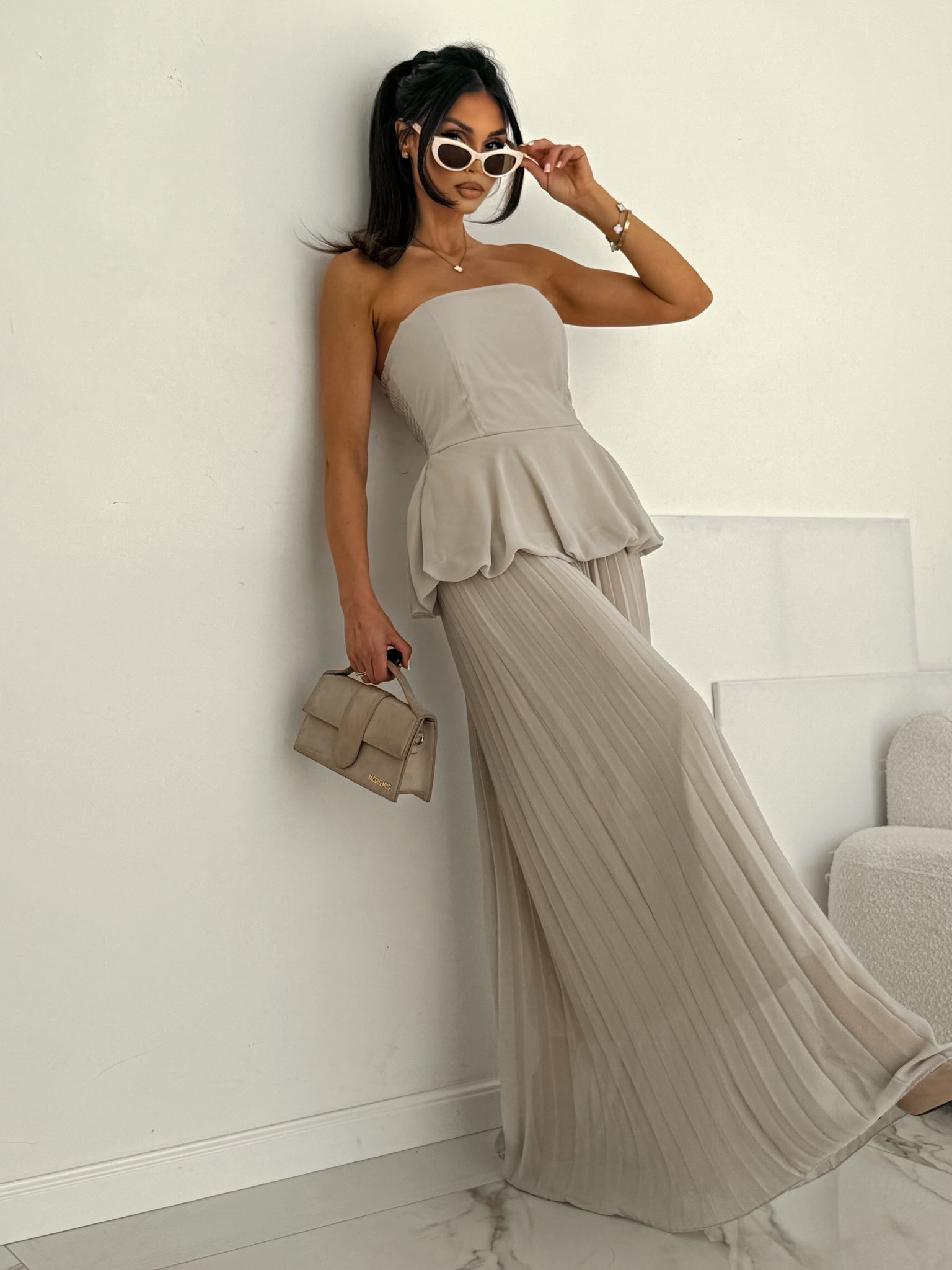 Subtelny beżowy odcień podkreśla elegancję i lekkość tego modelu Gorsetowy fason pięknie modeluje sylwetkę, a plisowany dół z efektownym rozcięciem dodaje całości wyjątkowego charakteru. Doskonała propozycja na …
