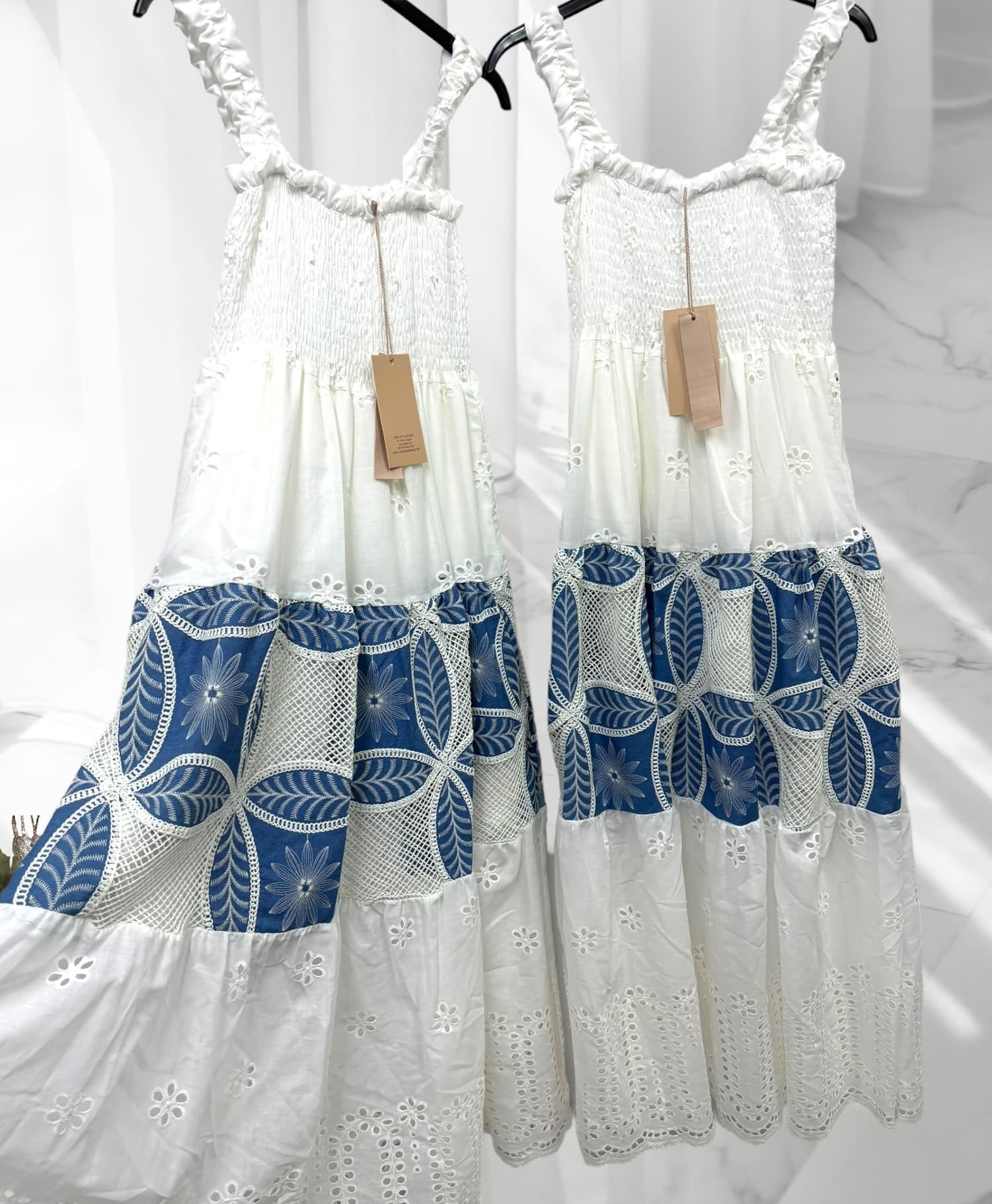 Sukienka na biuście posiada gumonici, ramiączkach z gumą ,piękne hafty oraz połączenia jeansu. Rozmiar: Biust:36-50x2 Pas:67x2 Biodra:67x2 Długość:128cm Skład: Bawełna 100%