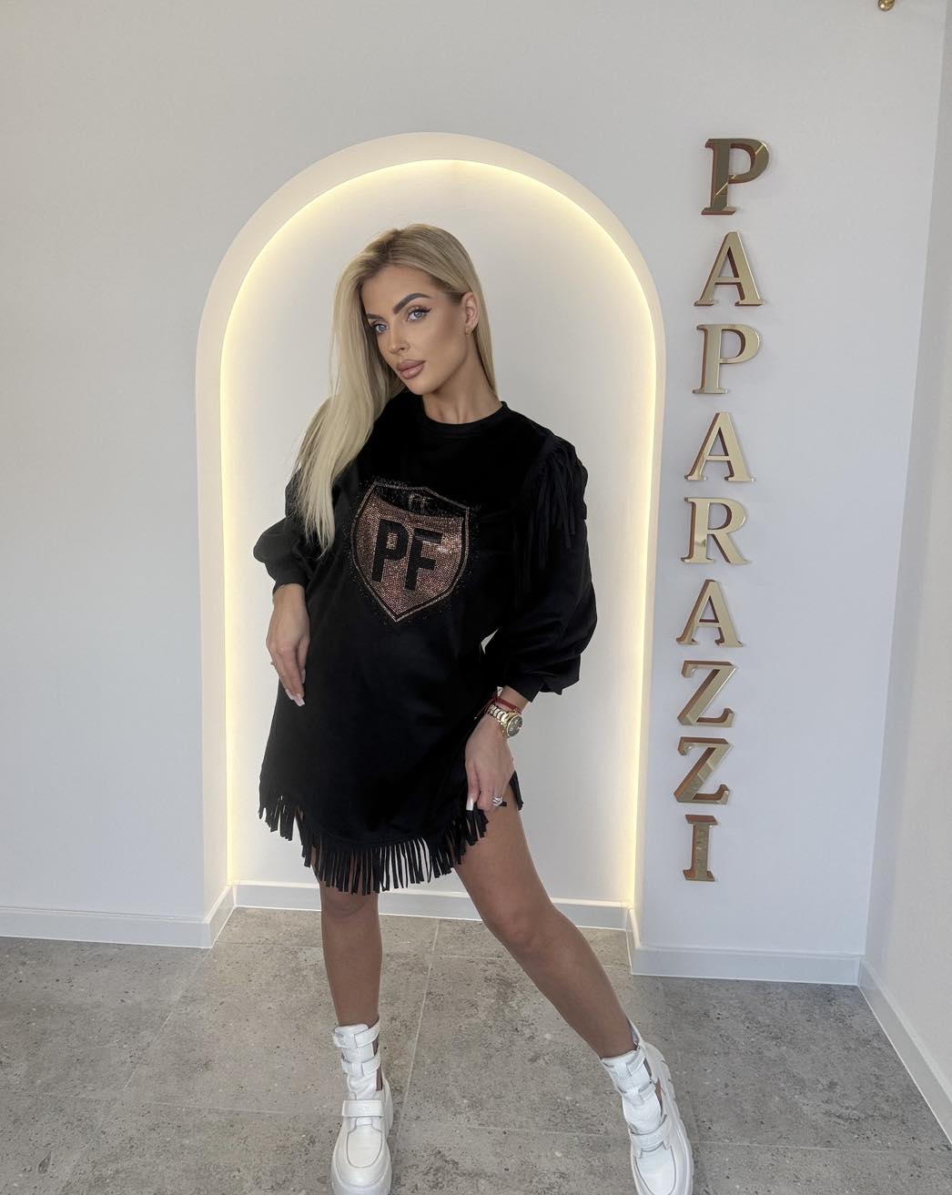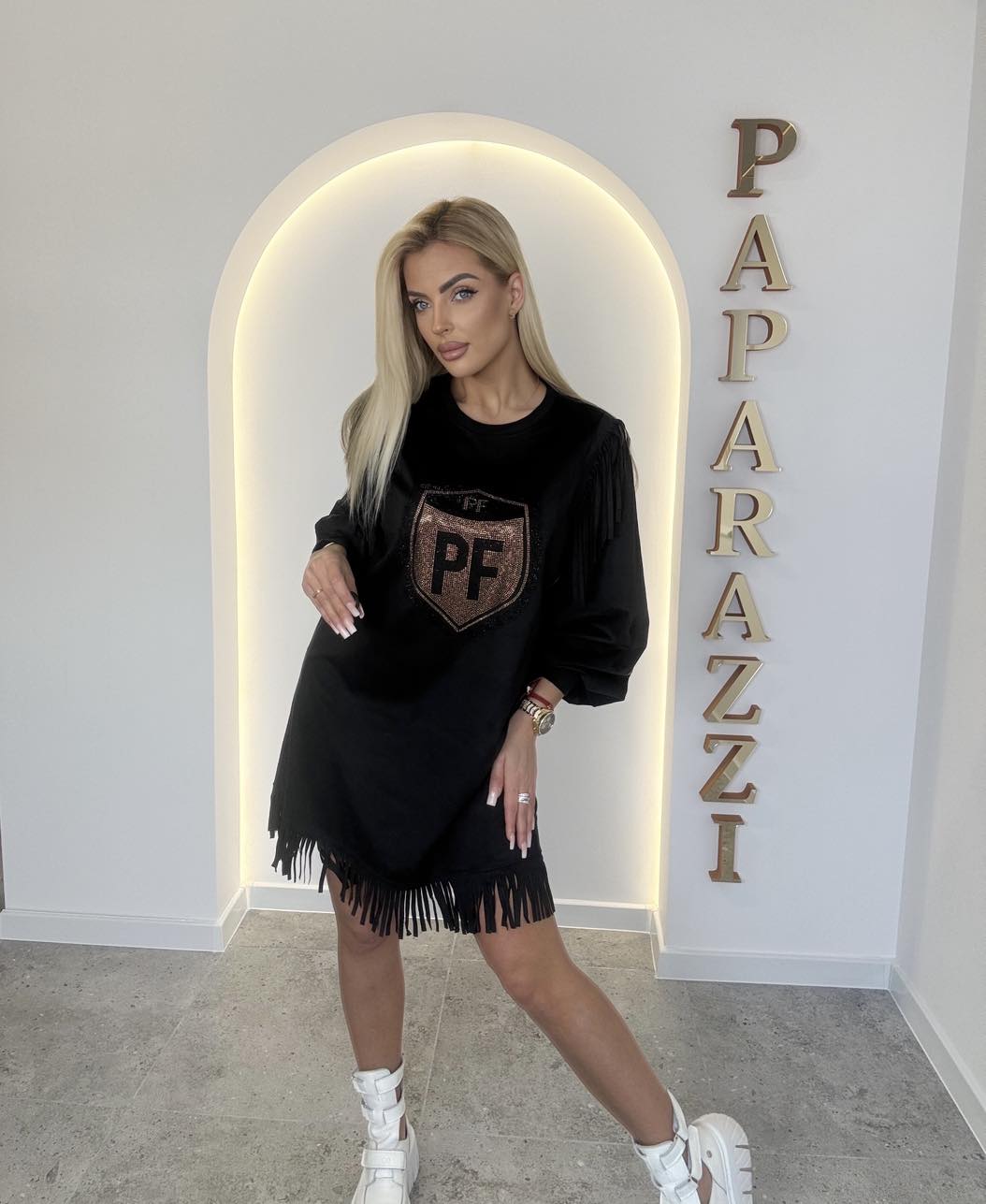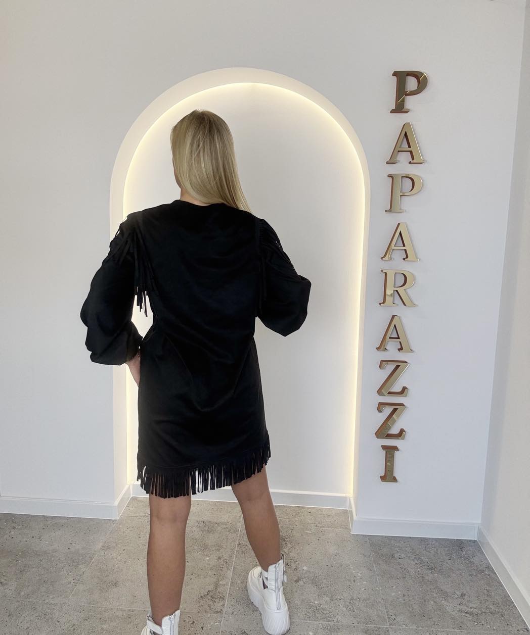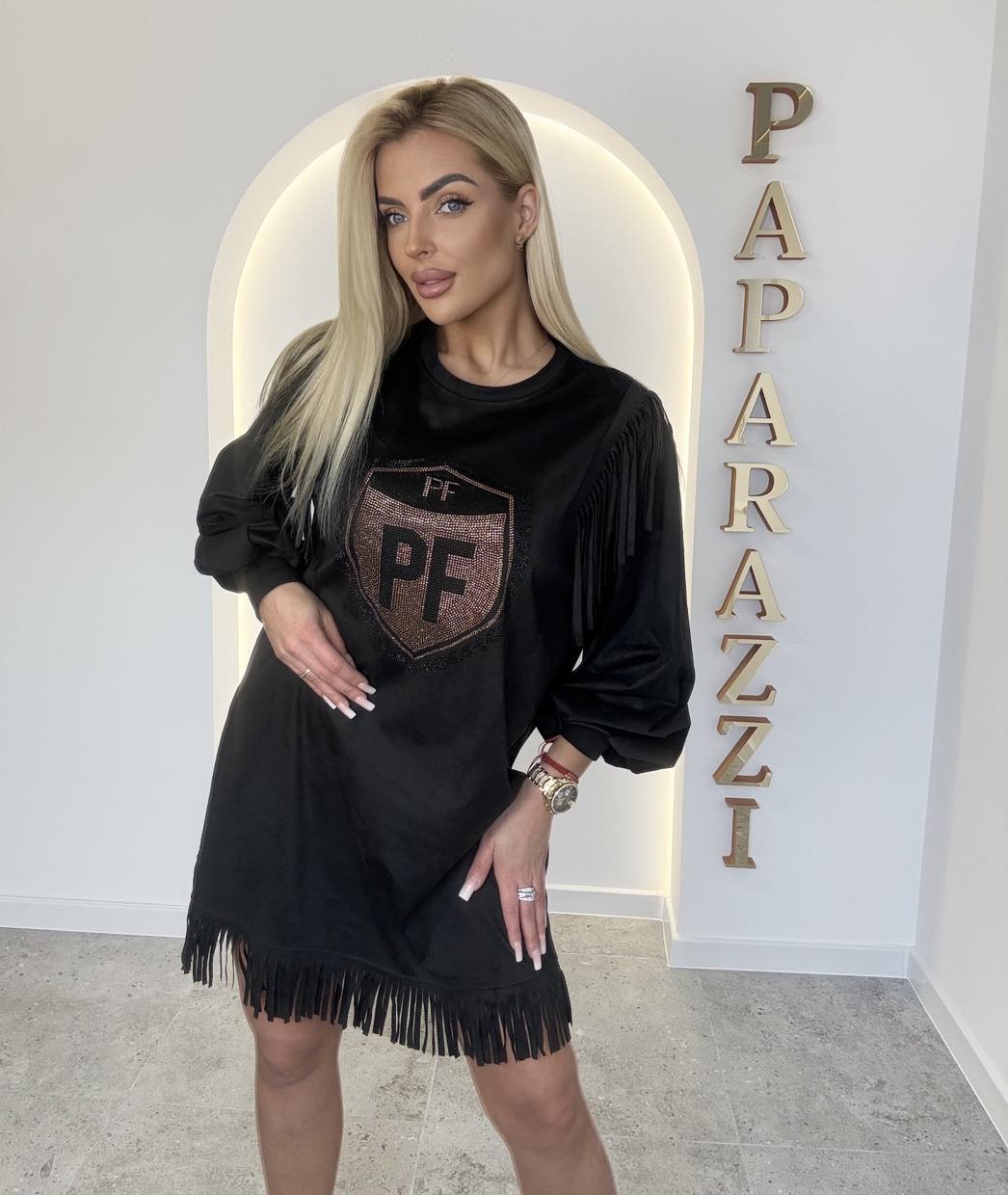 Zamszowa sukienka z ozdobnymi frędzelkami na zakończeniu oraz ramionach. Szerokie rękawki zakończone mankietem. Na przodzie logo ze złotych kamyczków.