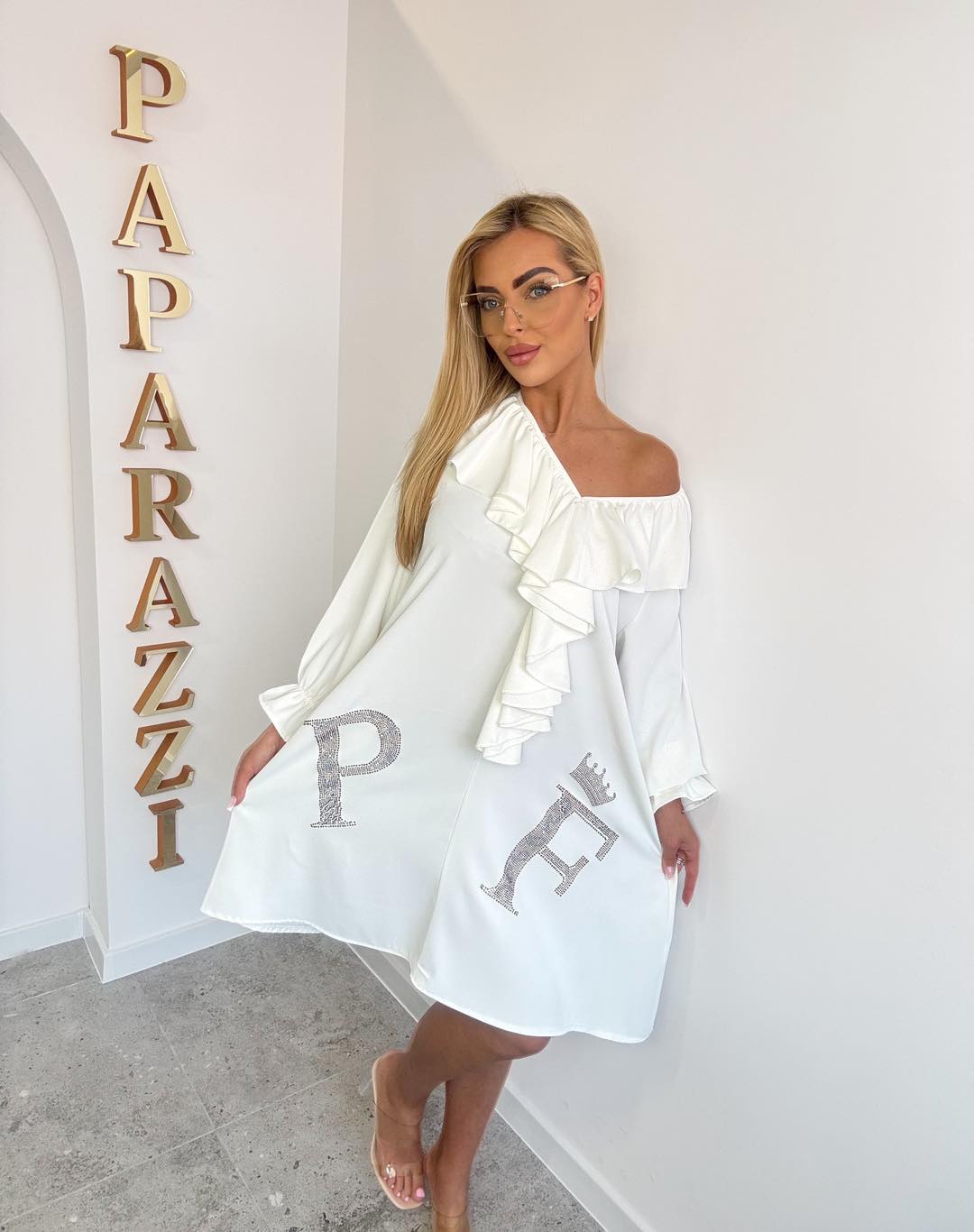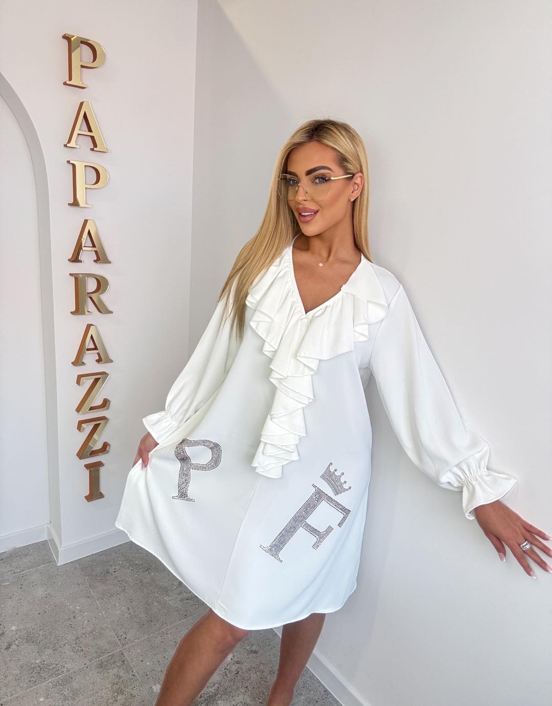 Elegancka sukienka z efektowną falbanką na przodzie, na rękawkach ozdobny ściągacz. Rozmiar: Biust: 54x2 Pas:60 x2 Długość:100cm
