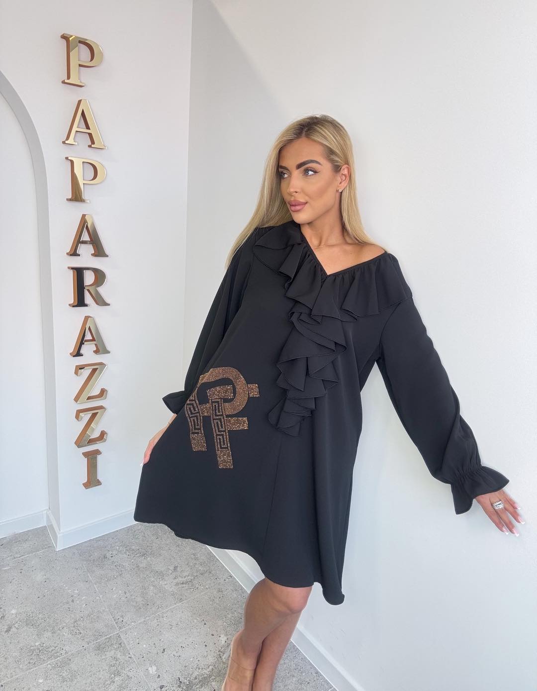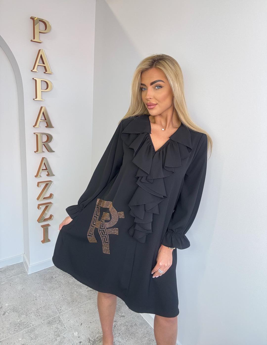 Elegancka sukienka z efektowną falbanką na przodzie, na rękawkach ozdobny ściągacz.