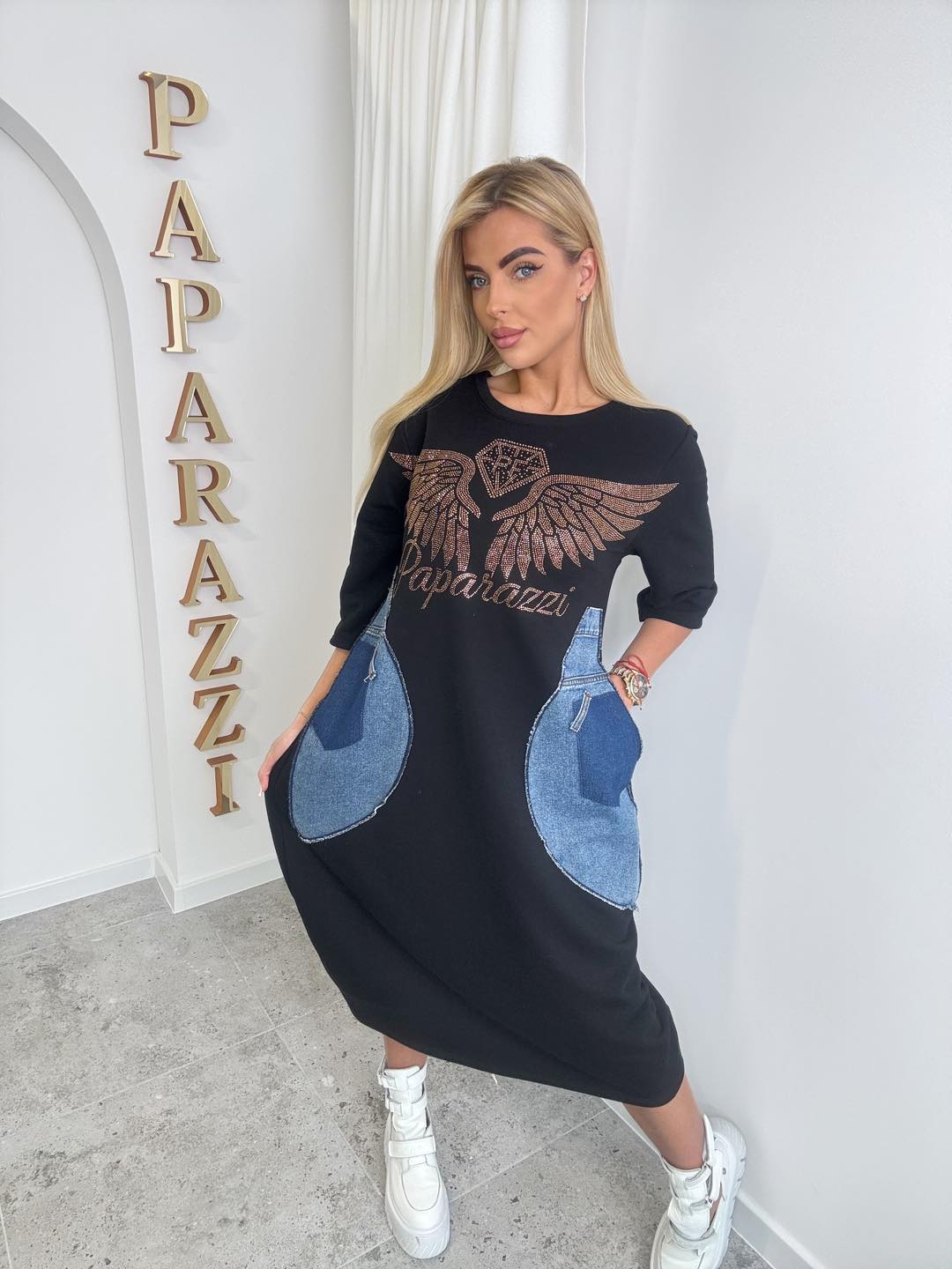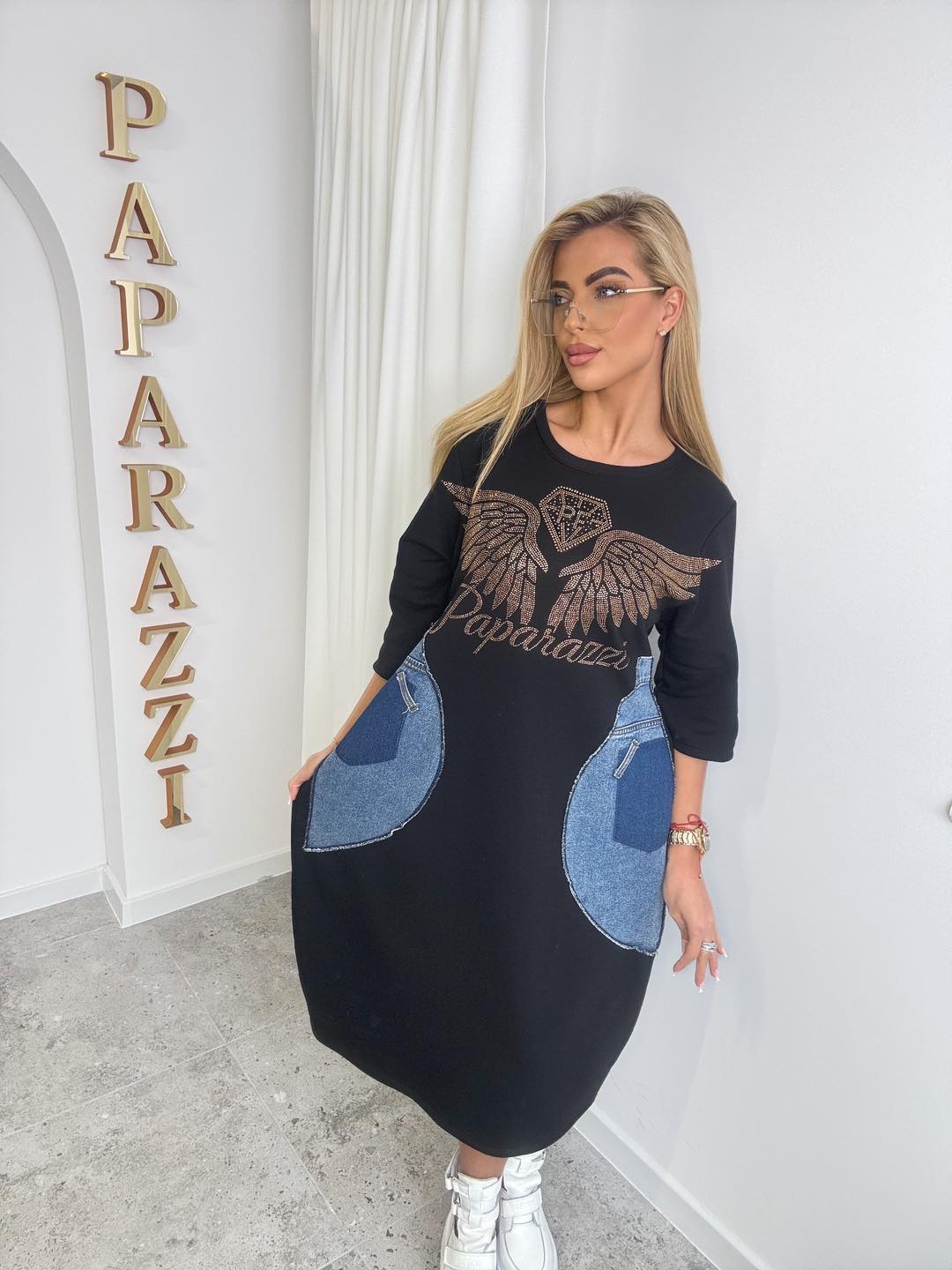 Model o luźniejszym fasonie z rękawem 3/4 pięknie układa się na sylwetce i daje swobodę ruchów. Z przodu znajduje się efektowny, połyskujący nadruk ze skrzydłami w odcieniu złota, który nadaje całości wyrazistego charakteru. Duże, kontrastowe kieszenie z wstawką imitującą jeans to modny detal, który przyciąga uwagę i podkreśla unikalny styl sukienki.