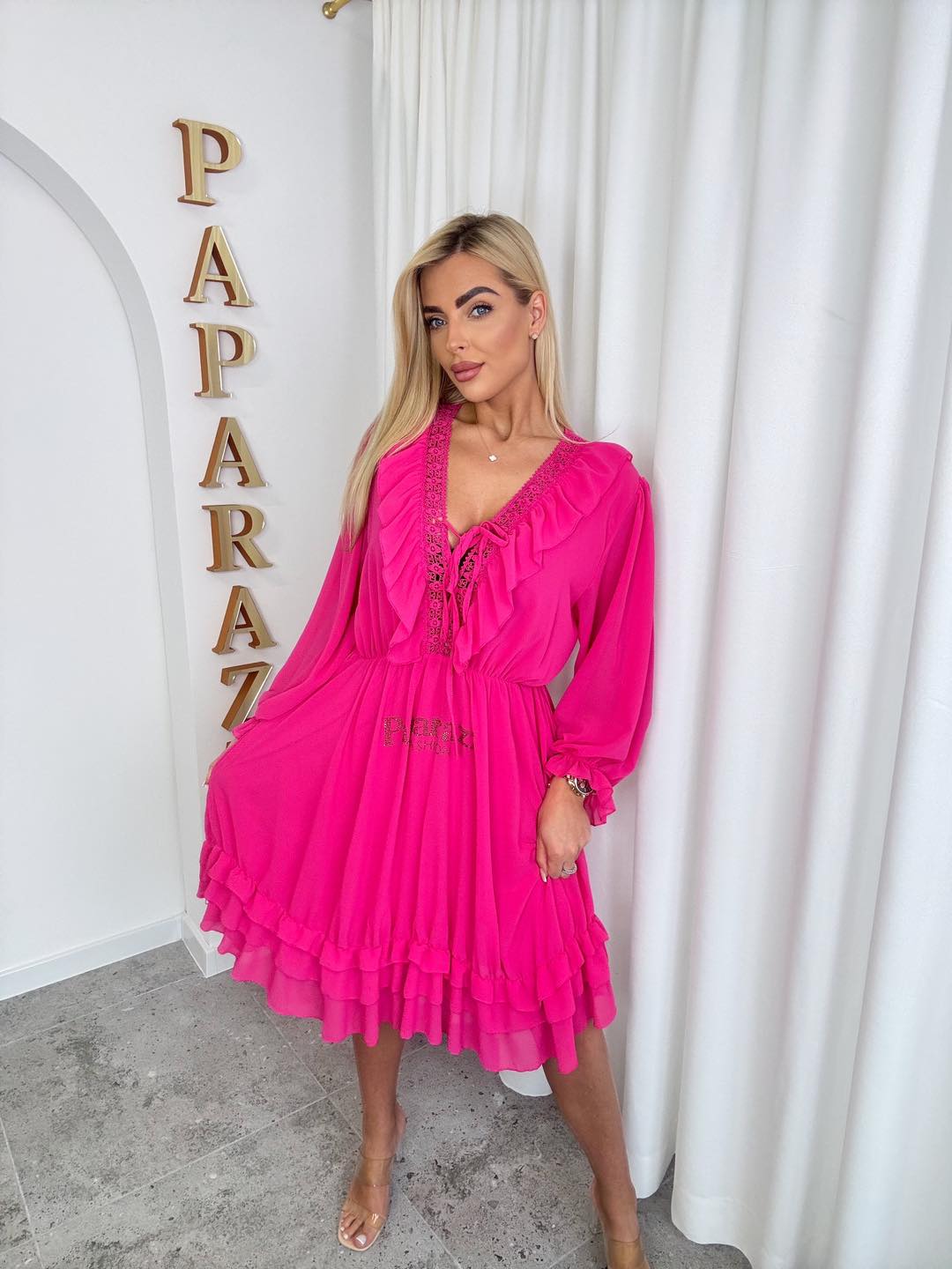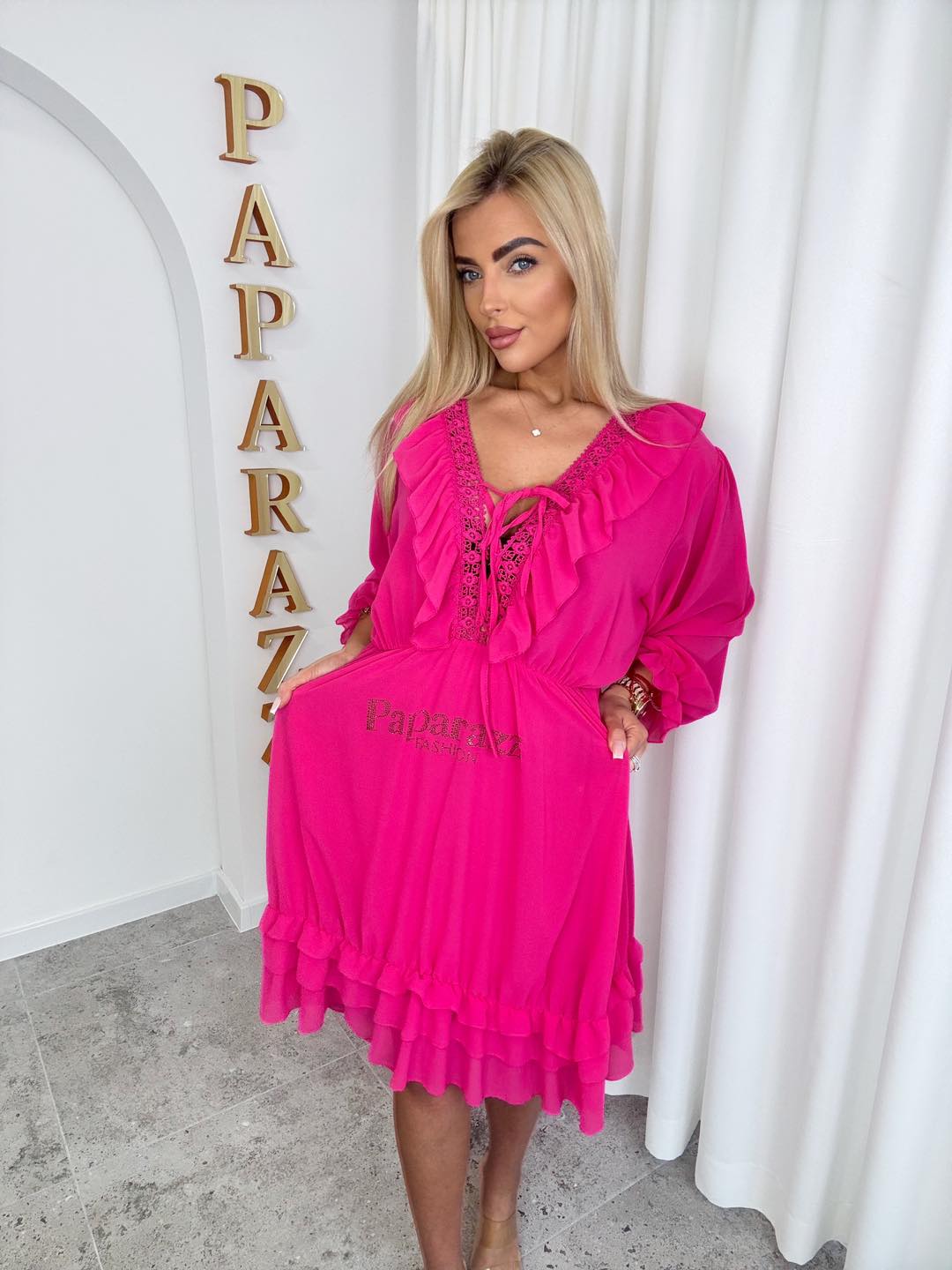 Zjawiskowa, kobieca sukienka w modnym odcieniu fuksji, która zachwyca lekkością i subtelnymi detalami. Wykonana z delikatnej, zwiewnej tkaniny pięknie układa się w ruchu, podkreślając romantyczny charakter stylizacji. Model wyróżnia się: dekoltem w kształcie litery V z koronkowym wykończeniem, ozdobnym wiązaniem przy szyi, efektownymi falbanami wzdłuż dekoltu i u dołu sukienki, długimi rękawami zakończonymi delikatną gumką, luźnym, komfortowym fasonem z odcięciem w talii. To idealna propozycja na przyjęcia, rodzinne uroczystości, randkę czy wiosenno-letnie wyjścia. Wystarczy dobrać sandałki lub szpilki, aby stworzyć elegancki look, albo zestawić ją z botkami dla bardziej swobodnego efektu.