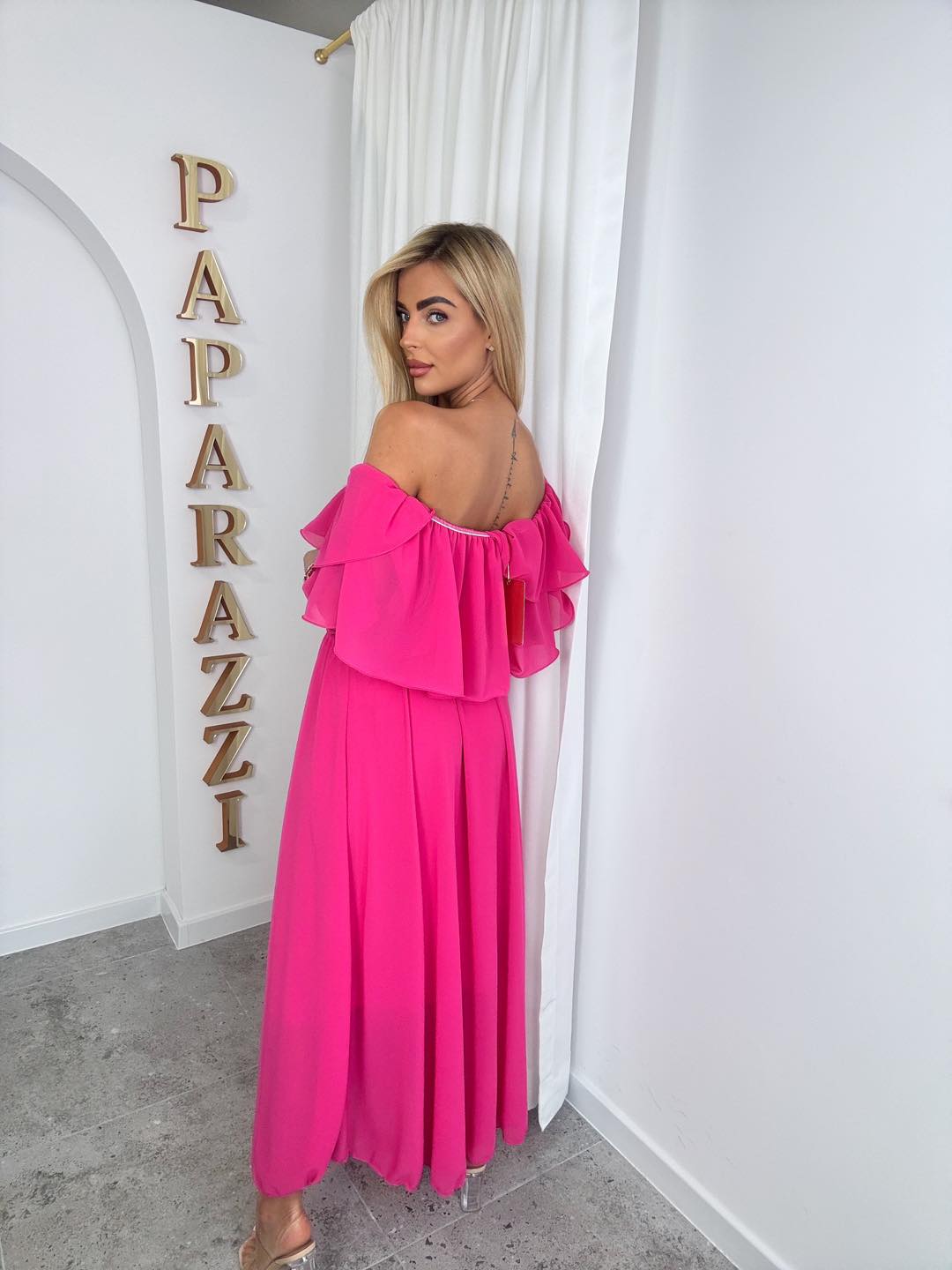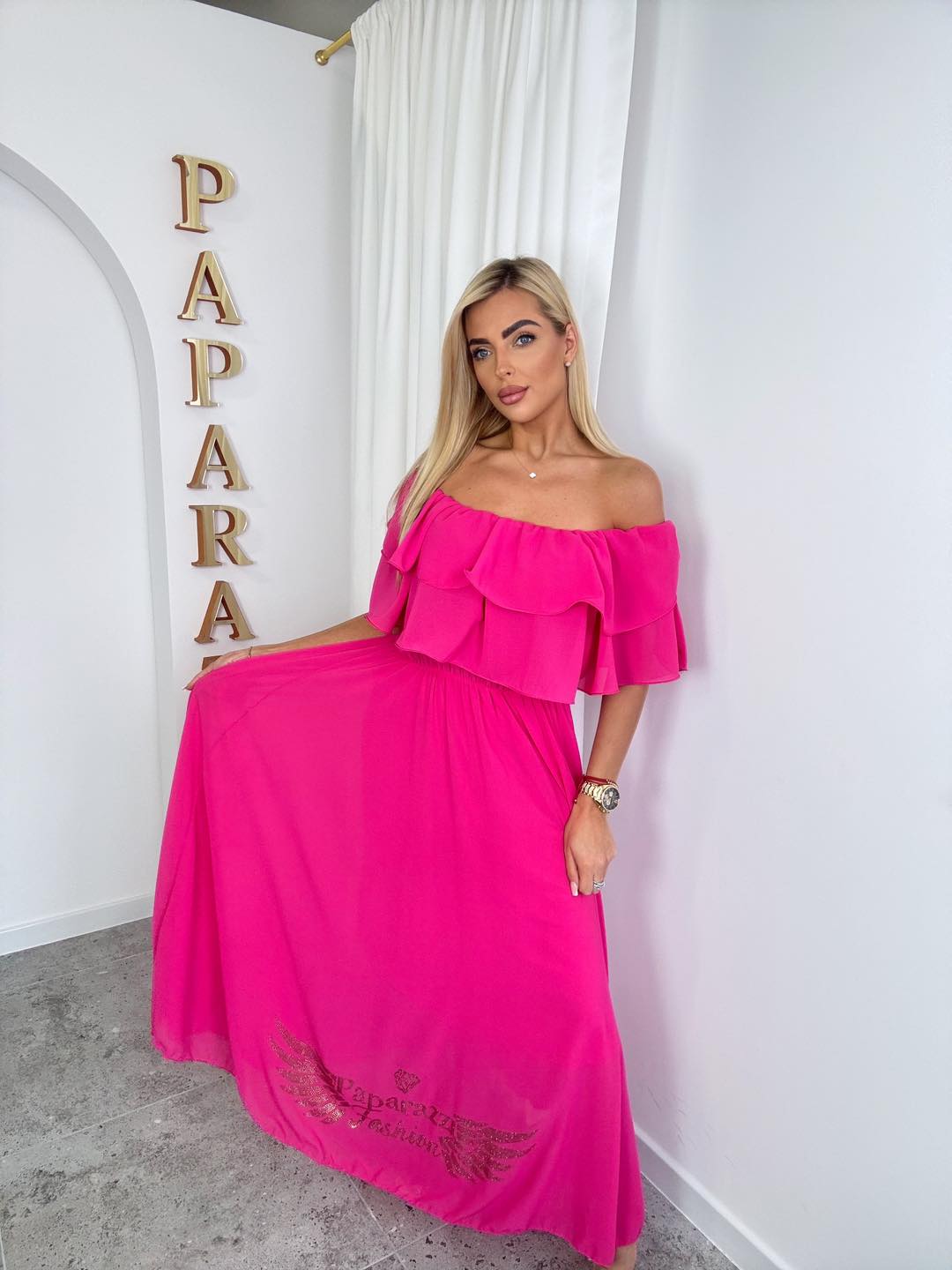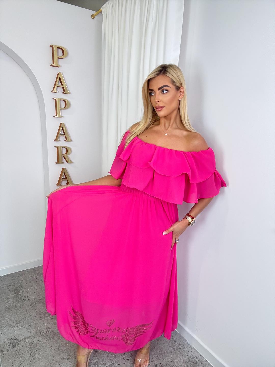 Zwiewna sukienka maxi w odcieniu fuksji to idealna propozycja na ciepłe dni i wyjątkowe okazje. Hiszpański dekolt z falbaną pięknie podkreśla ramiona, a elastyczna talia modeluje sylwetkę i zapewnia komfort noszenia. Lekki, rozkloszowany dół nadaje całości kobiecej lekkości i elegancji.