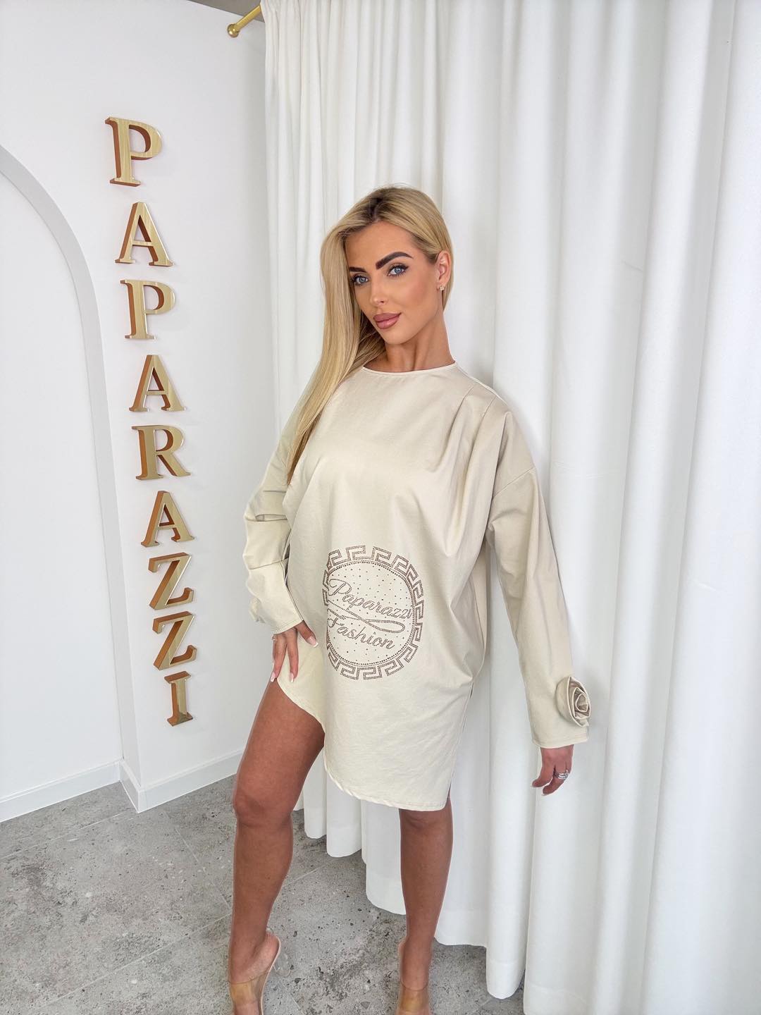 Stylowa sukienka/tunika oversize to must-have w codziennej garderobie. Luźny fason pięknie układa się na sylwetce, maskuje niedoskonałości i zapewnia pełen komfort noszenia. Miękki materiał oraz długie rękawy sprawiają, że model świetnie sprawdzi się przez cały sezon, a ozdobne kwiatowe detale na rękawach dodają jej subtelnej kobiecości i wyjątkowego charakteru. Ozdobne logo z przodu podkreśla modowy styl całości.