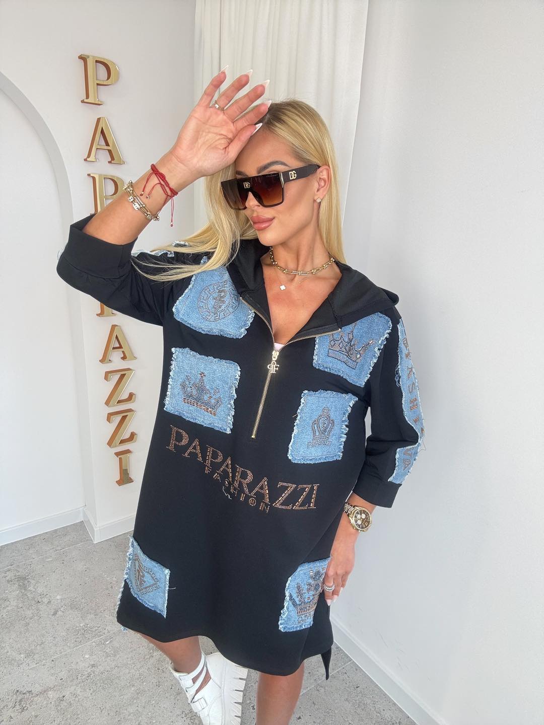 Sukienka/tunika oversize to must-have w codziennej garderobie. Luźny fason pięknie układa się na sylwetce, maskuje niedoskonałości i zapewnia pełen komfort noszenia. Materiał bazowy z naszytymi, postrzępionymi panelami z jasnego jeansu. Ozdobne logo z przodu podkreśla modowy styl całości.