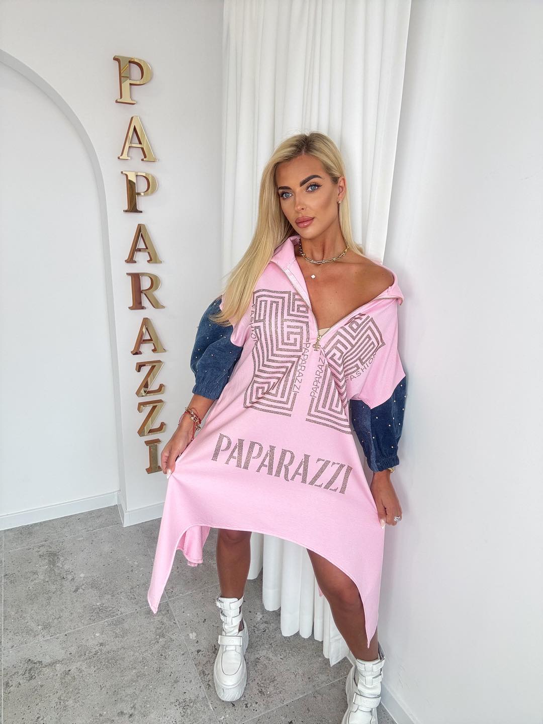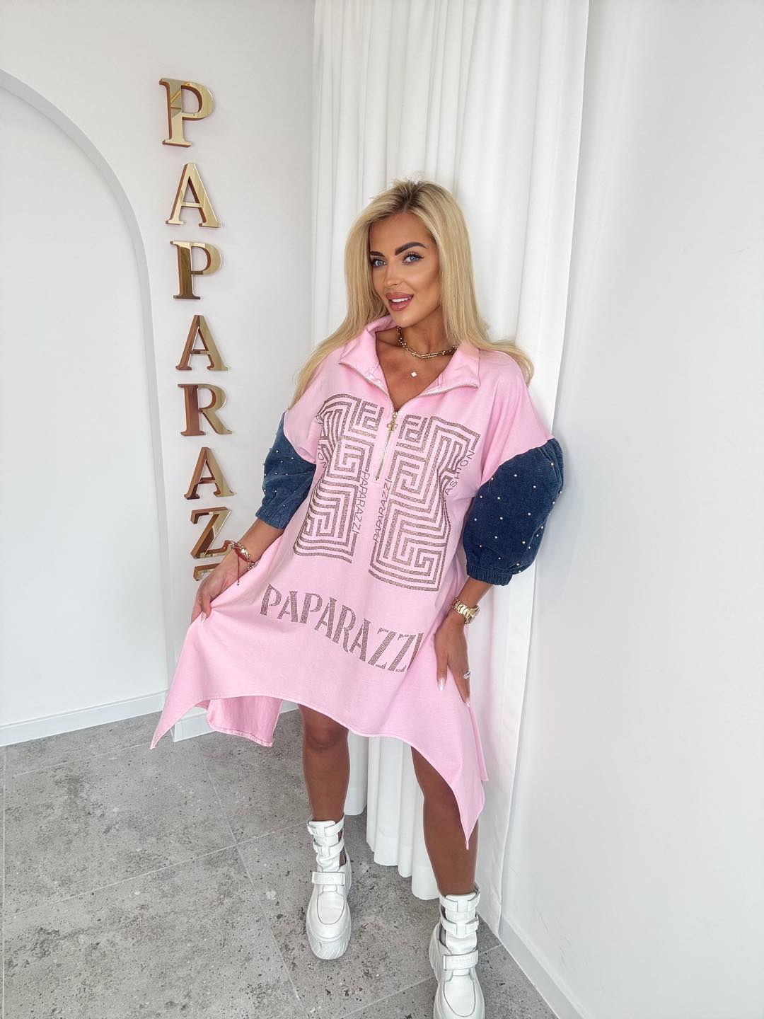 Sukienka/tunika oversize to must-have w codziennej garderobie. Luźny, asymetryczny fason z szerokimi jeansowymi rękawkami ozdobionymi perełkami pięknie układa się na sylwetce, maskuje niedoskonałości i zapewnia pełen …