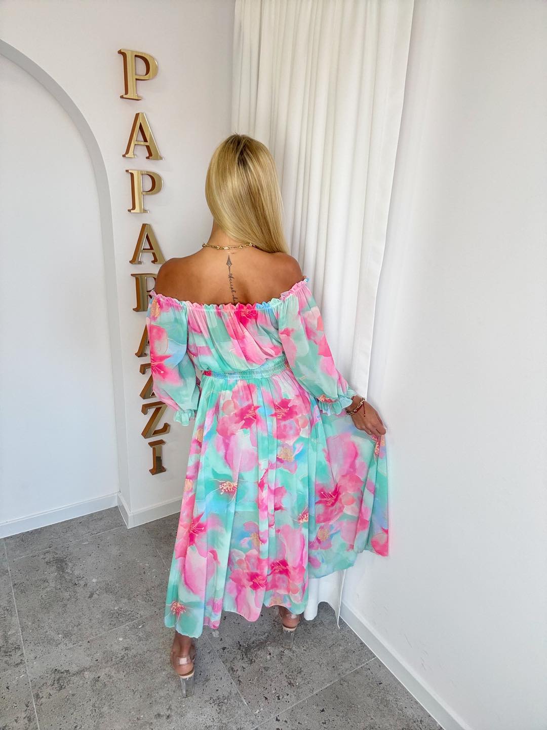 Sukienka midi w pastelowych kolorach to idealna propozycja na wiosnę i lato. Model z odkrytymi ramionami pięknie podkreśla linię dekoltu i dodaje kobiecej lekkości. Zwiewny, delikatny materiał układa się swobodnie podczas ruchu, zapewniając komfort noszenia przez cały dzień.