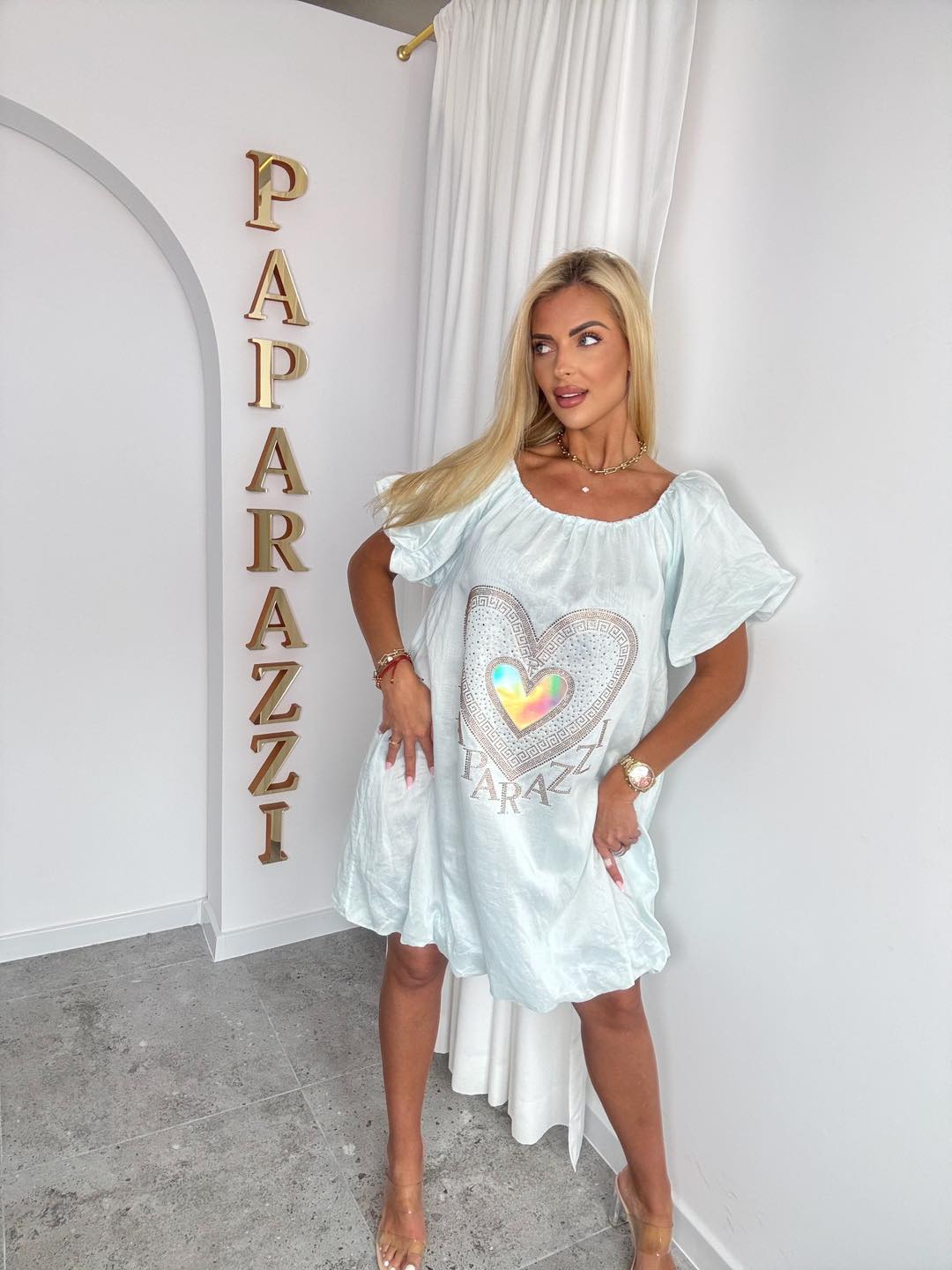 Centralnym elementem sukienki jest efektowny nadruk w kształcie serca, ozdobiony subtelnymi zdobieniami oraz holograficznym akcentem, który przyciąga wzrok i nadaje całości unikalnego stylu. Dodatkowym detalem jest napis „PAPARAZZI”, podkreślający modowy charakter modelu.